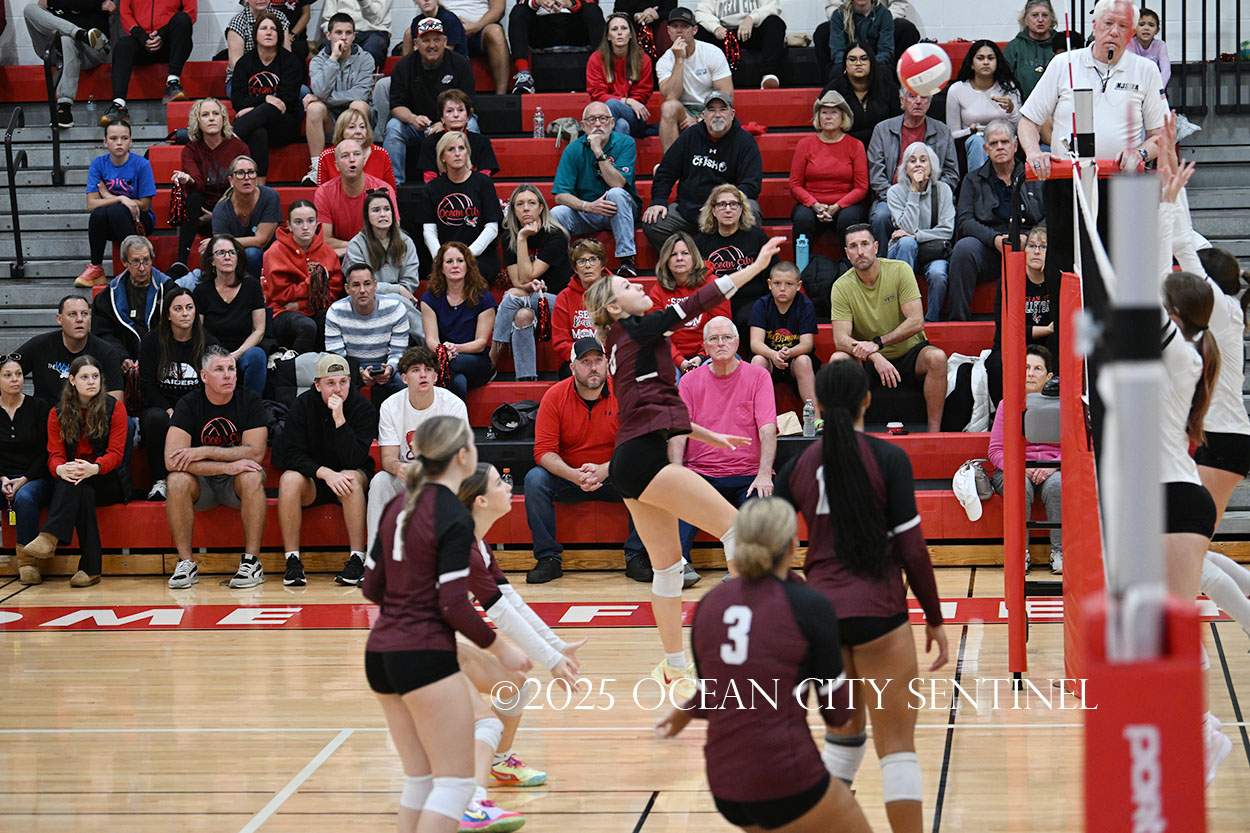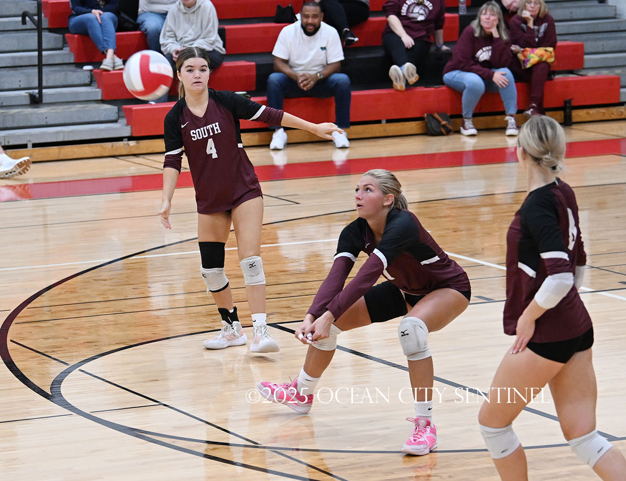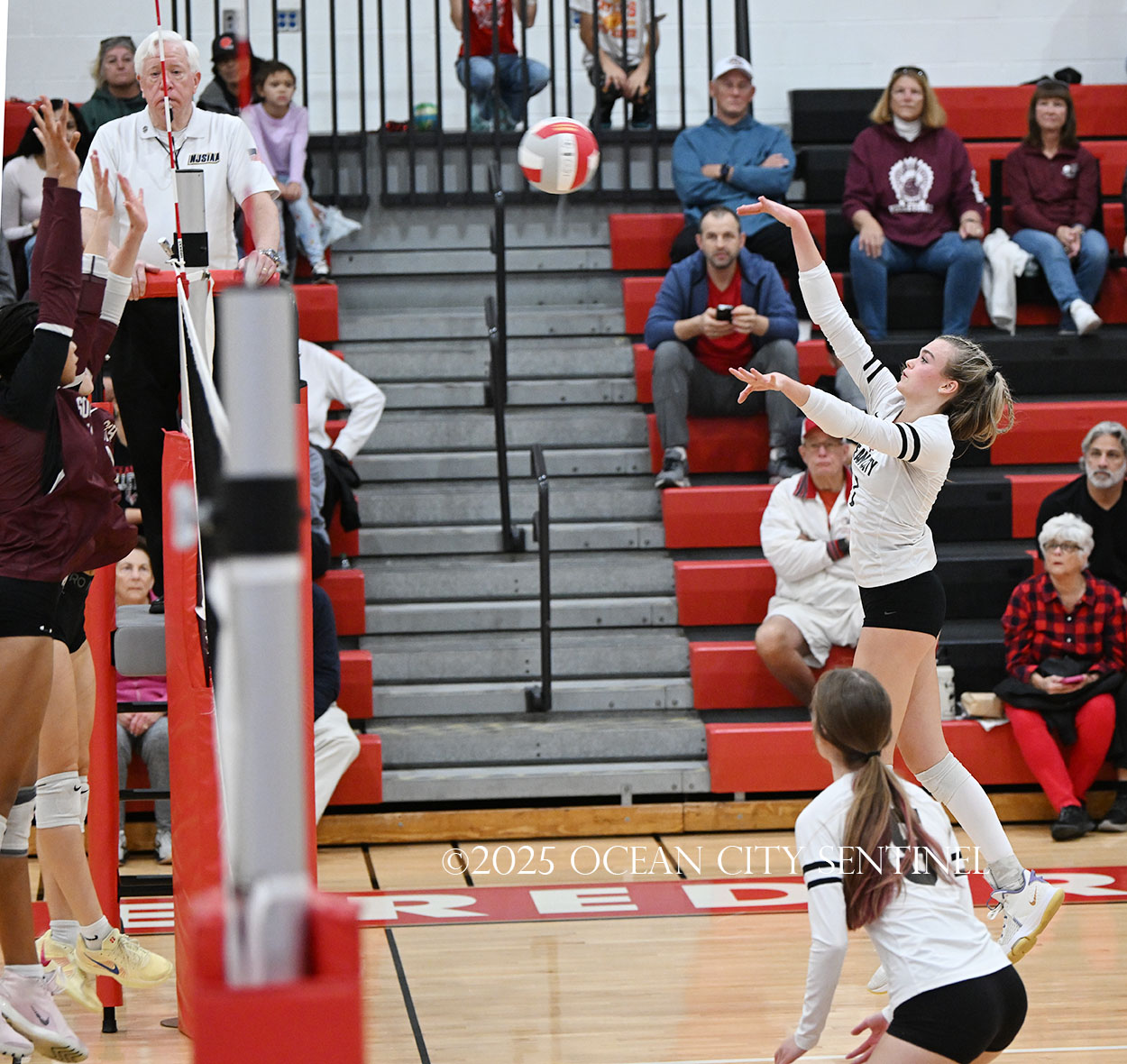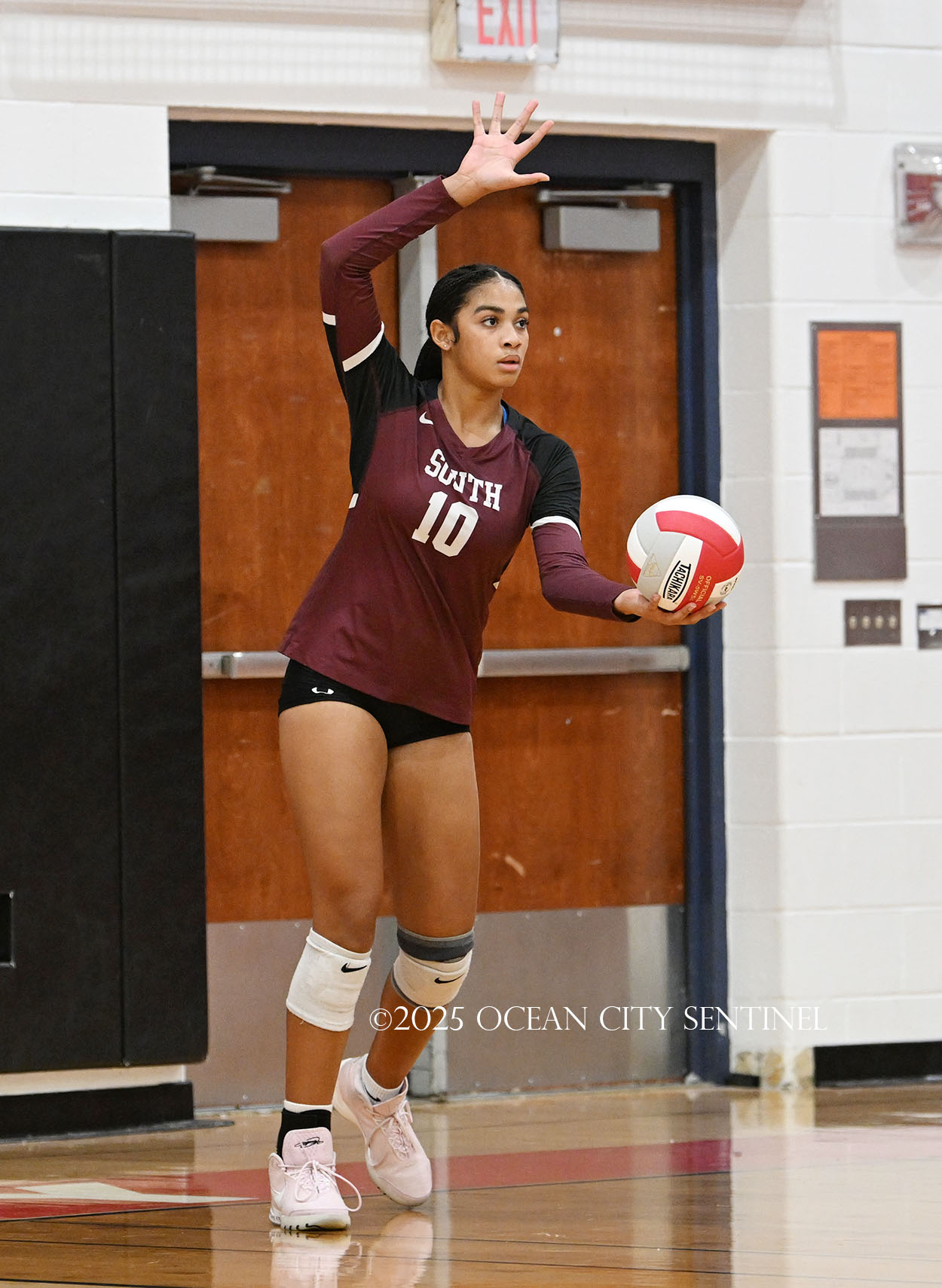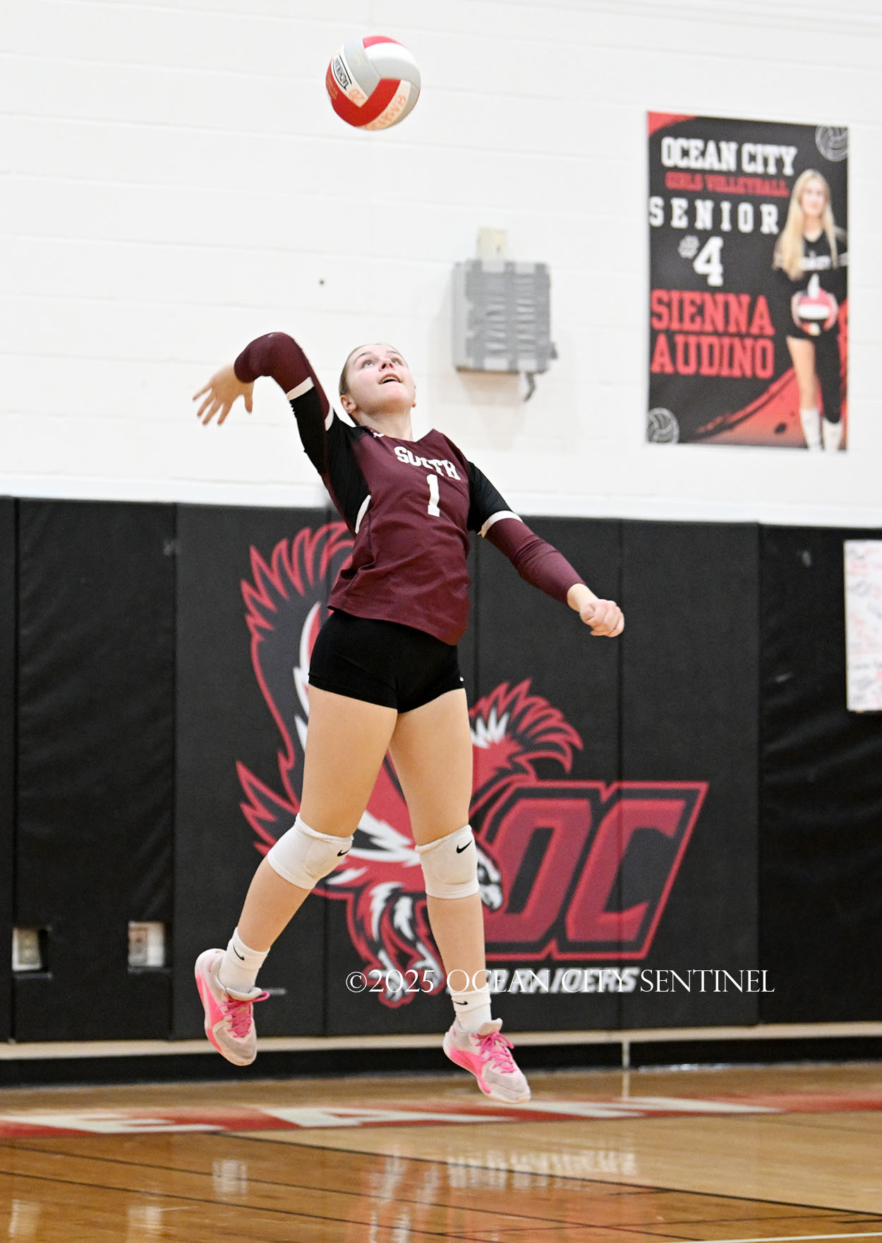 Toms River South started strong in the third set, leading early 6-2 before the Red Raiders tied at 6-6. Ocean City took the lead for good at 12-11. TRS got within a point later, 14-13, but Ocean City held at 22-18 and then got five set points at 24-19 before winning 25-19.