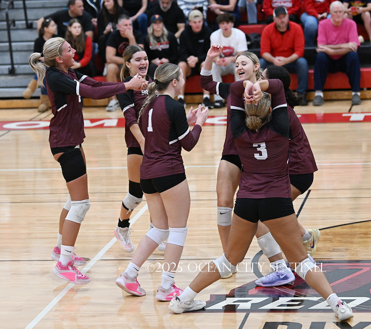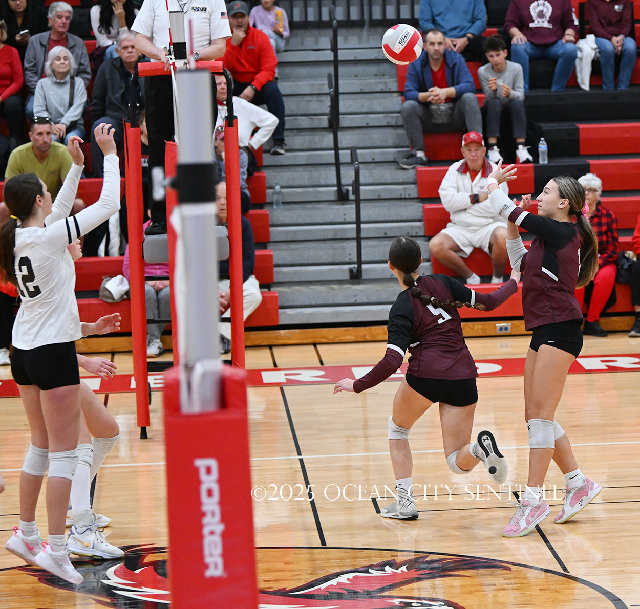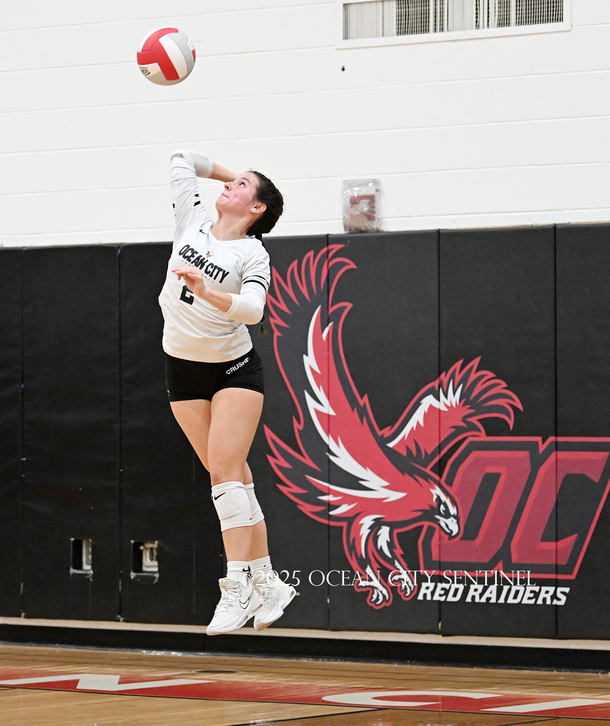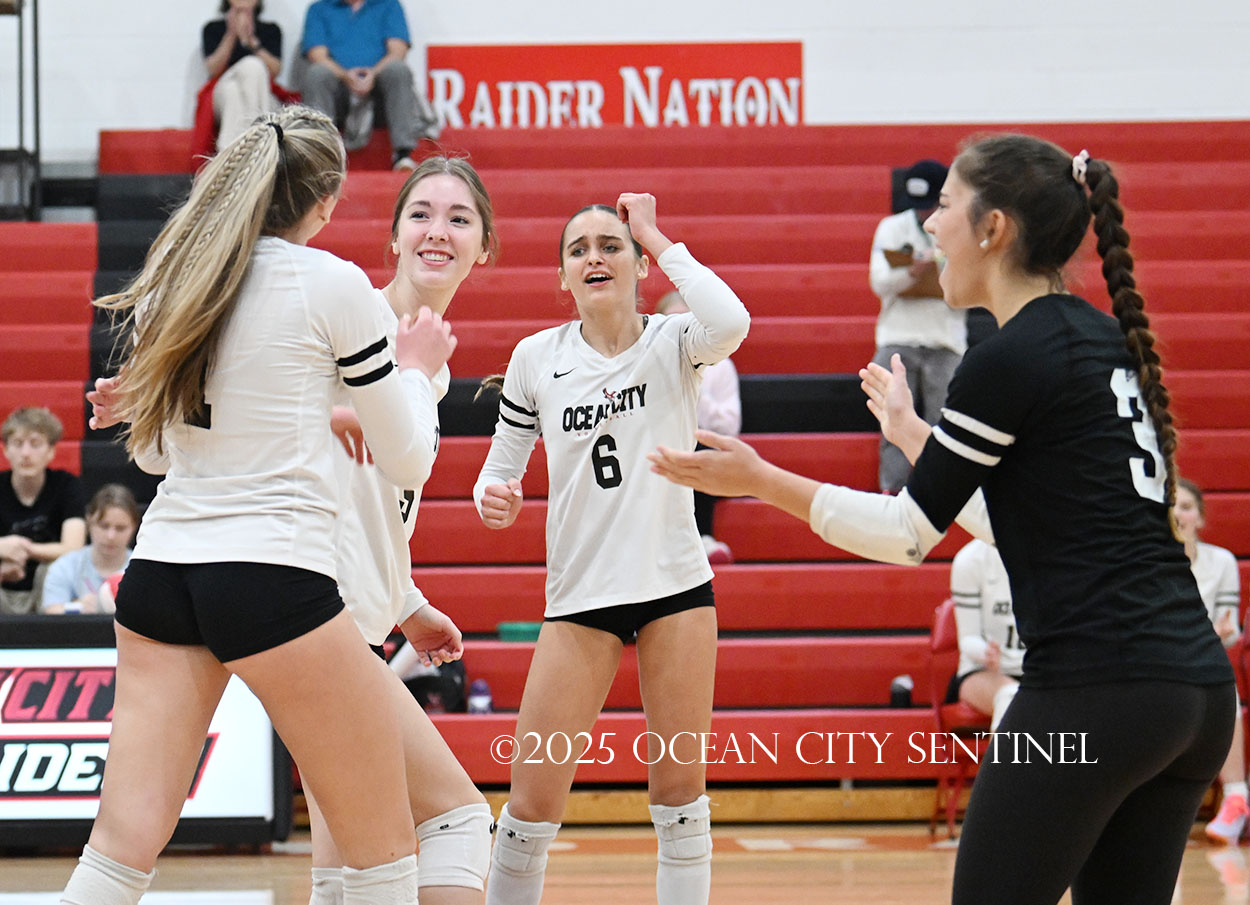 The fourth set was tied early, but TRS took control and ran its lead to 16-8 before Ocean City narrowed it to 20-16. The visitors got up 23-17, but the Red Raiders closed back in to within a point at 23-22 before TRS won 25-22 to even the match at 2-2.