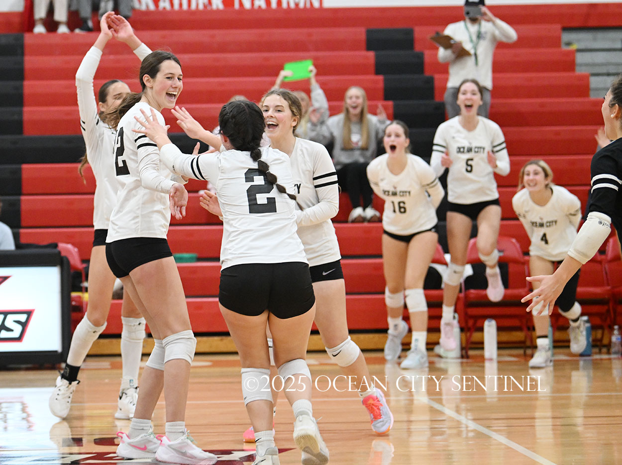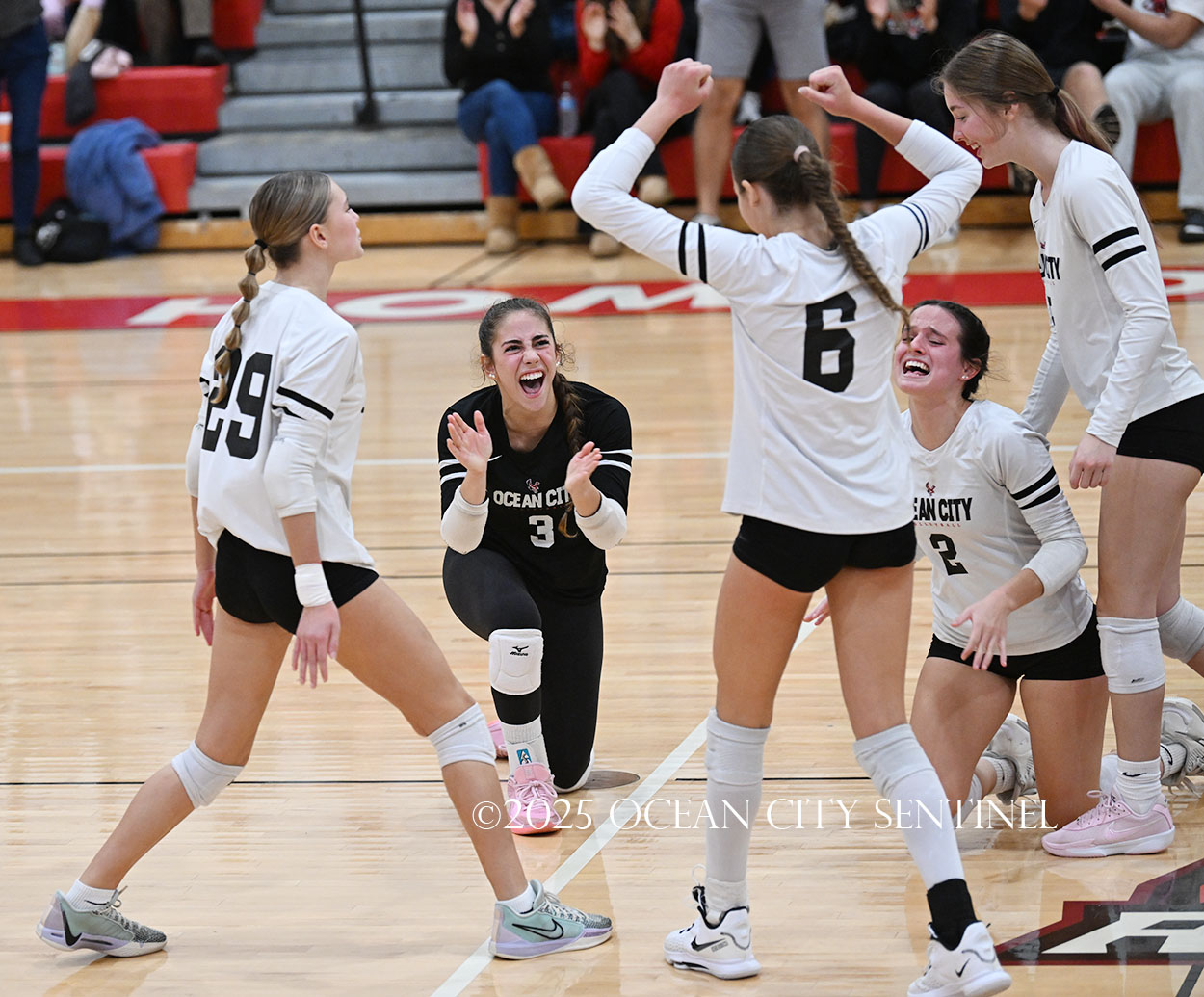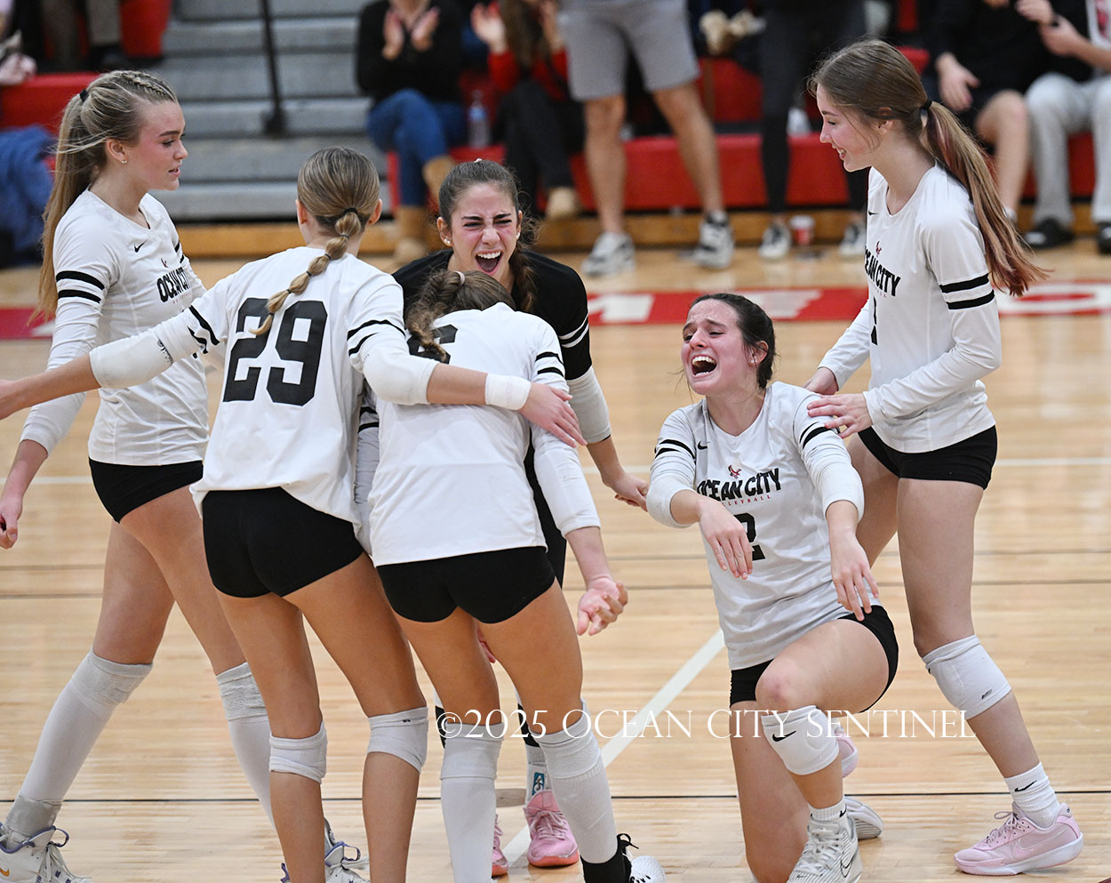 Ocean City narrowly won the first set 25-23, lost the second 25-21, then controlled the third set 25-19. Toms River South tied things up in the fourth, 25-22, then won in the third set, 15-12, to move on to the sectional championship game.