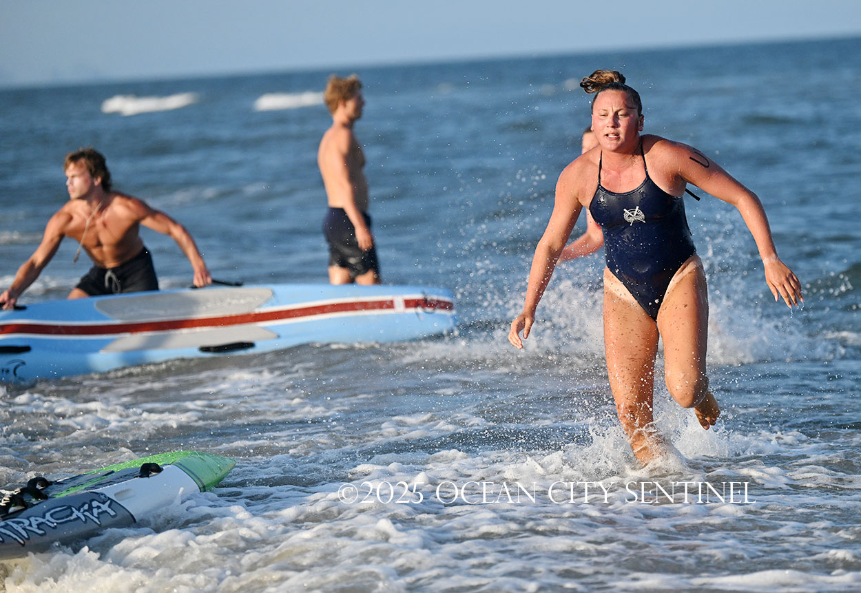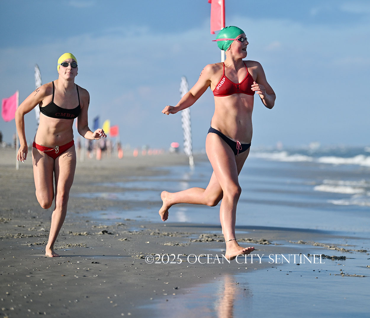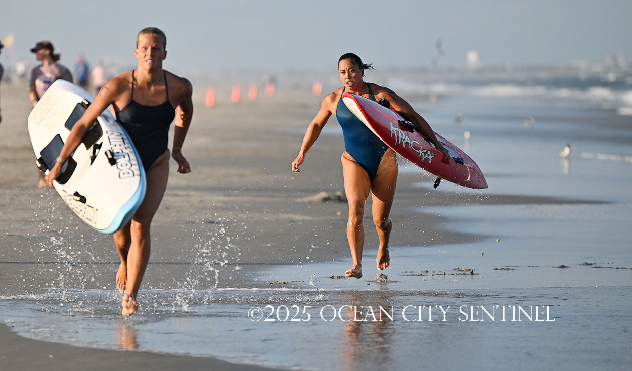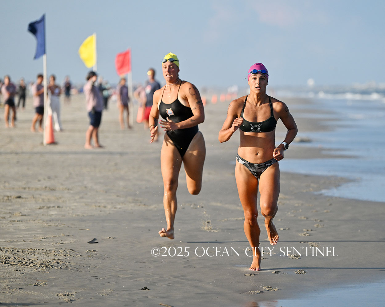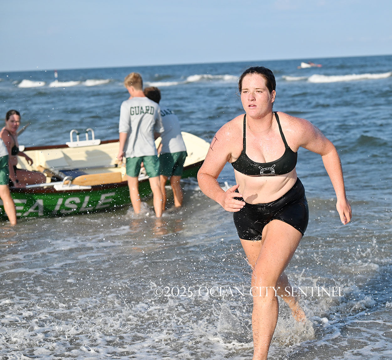 The Upper Township Beach Patrol duo of Lorna Connell and Kailey Grimley were first in 4:54, followed by Sea Isle City sisters Molly and Maura Quinn in 4:57 and the Ventnor City Beach Patrol’s Sam Keough and Charlotte Thomas in 5:01.