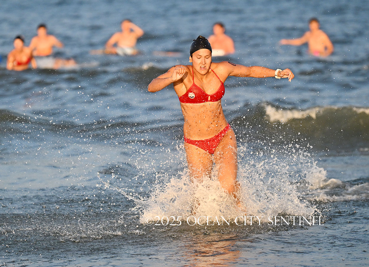 The tide was on the ebb and there is a sandbar off the beach, making for more of a surf dash than a swim as the athletes had to high-step through the early and late stages.