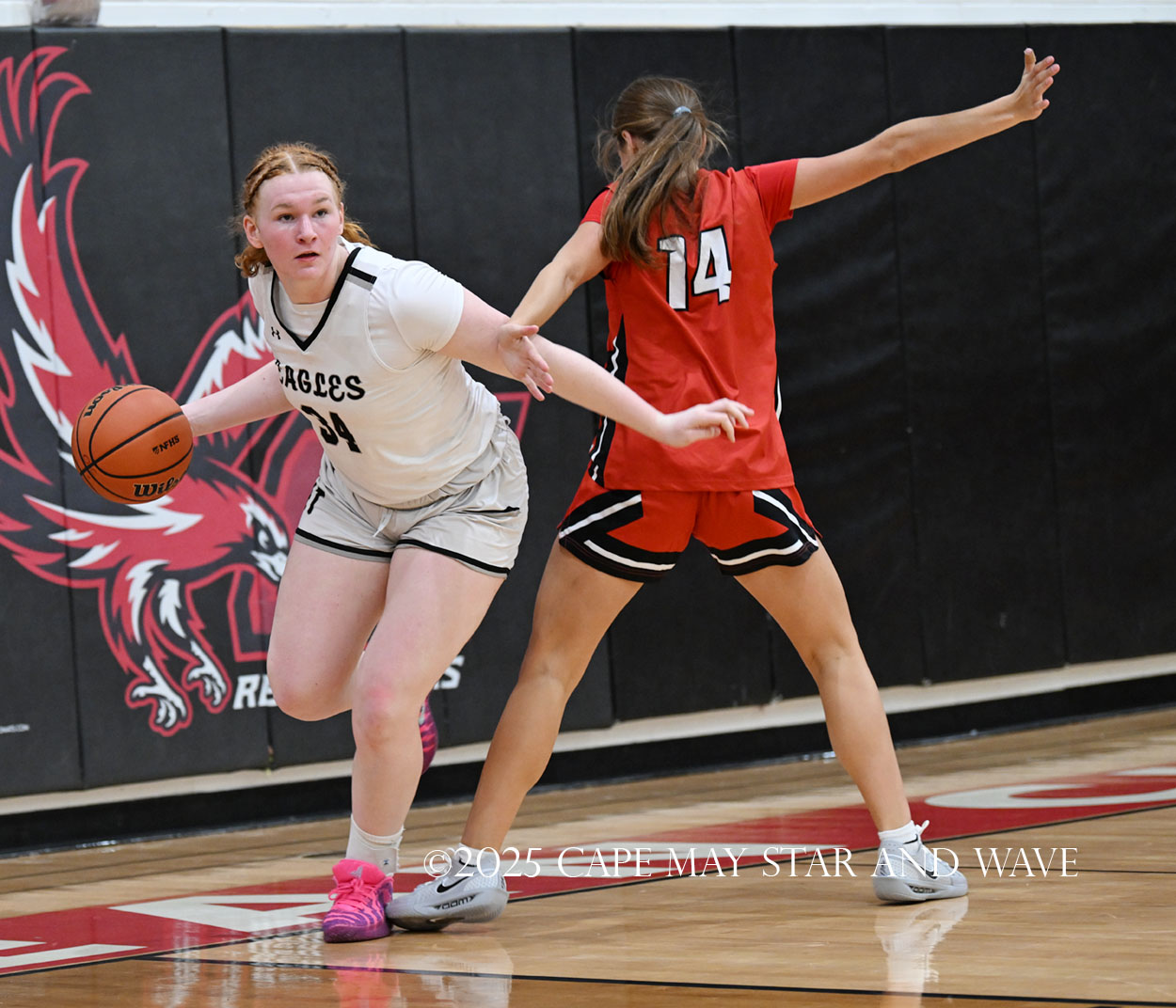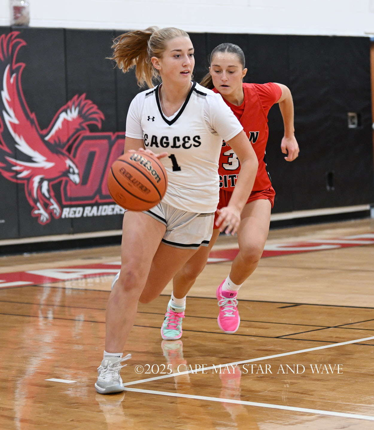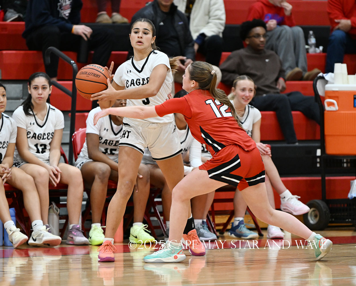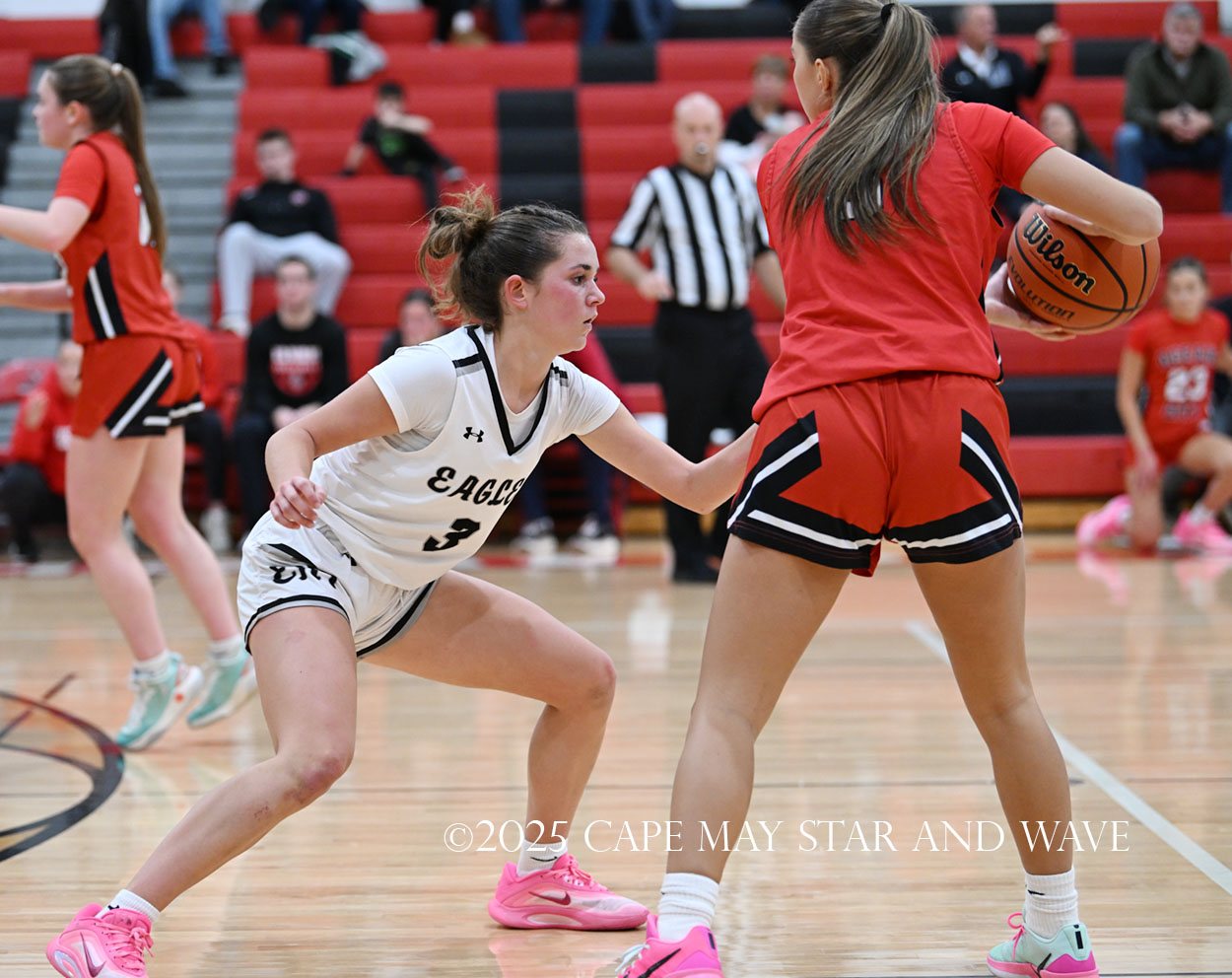The Eagles, in their fourth game of the season, exploded with 20 points in the second quarter after a tight first quarter of action. Siena Jaworski and Evalyn Brown each scored 14 points to help build a 32-10 halftime lead for Egg Harbor Township. Jaworski hit four three-pointers that all came in response to a good Raider offensive possession.