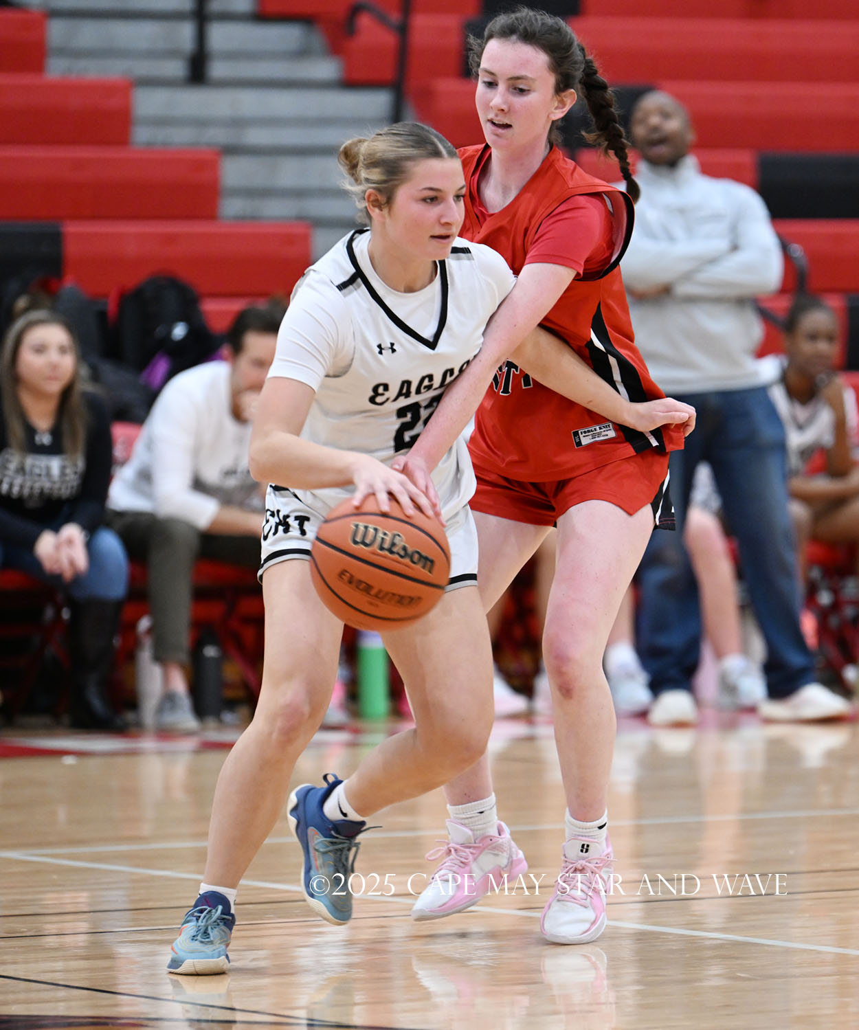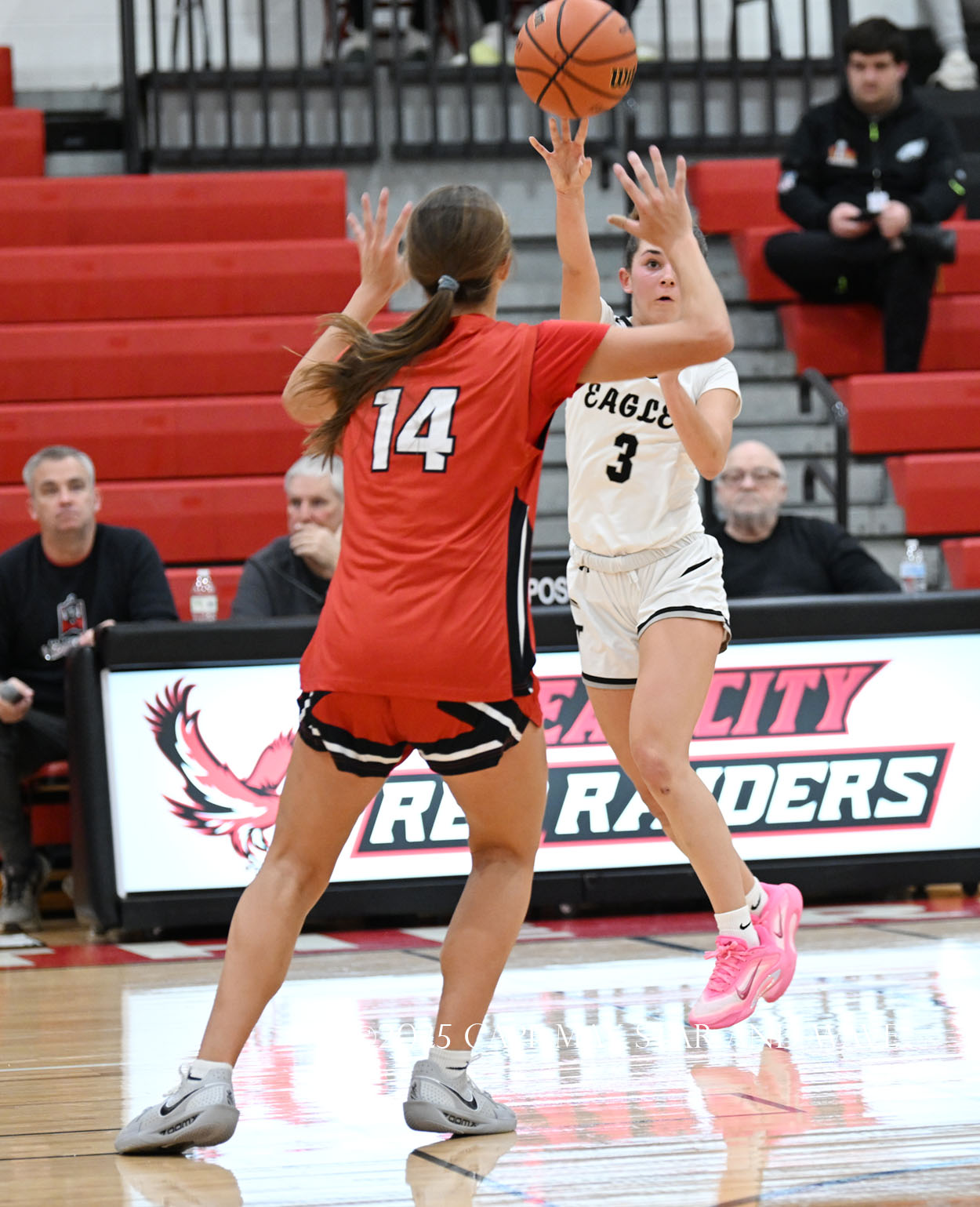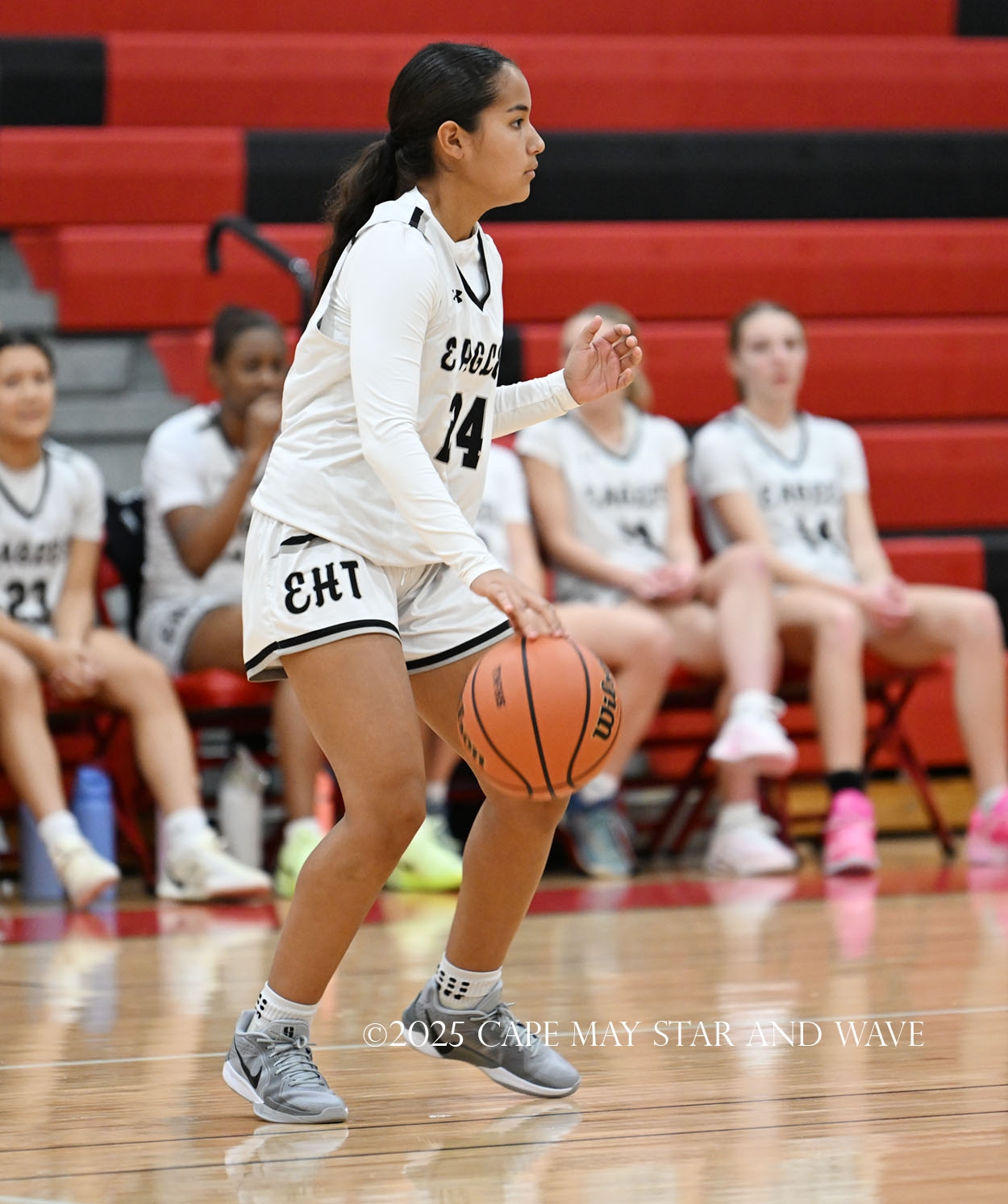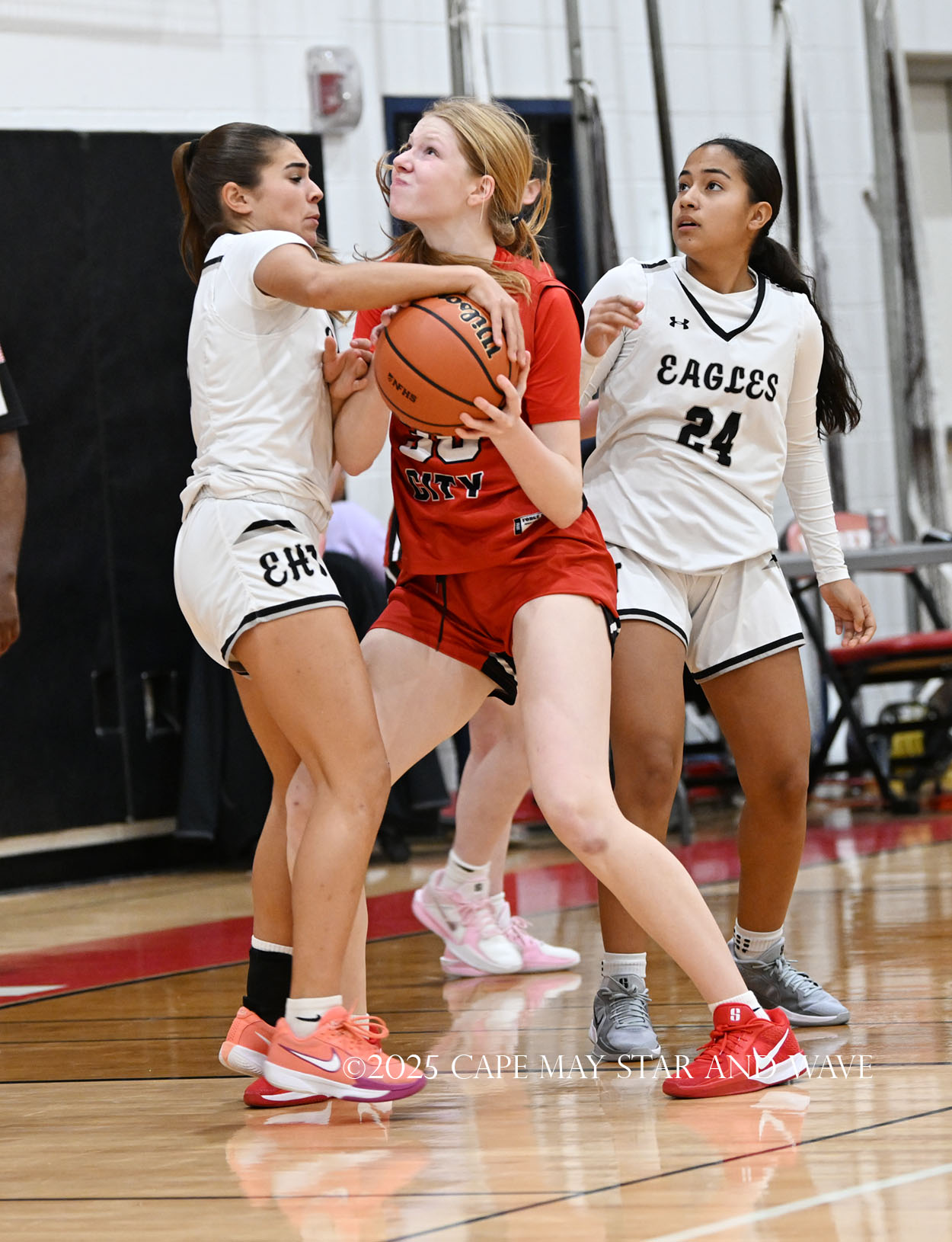 The Eagles, in their fourth game of the season, exploded with 20 points in the second quarter after a tight first quarter of action. Siena Jaworski and Evalyn Brown each scored 14 points to help build a 32-10 halftime lead for Egg Harbor Township. Jaworski hit four three-pointers that all came in response to a good Raider offensive possession.