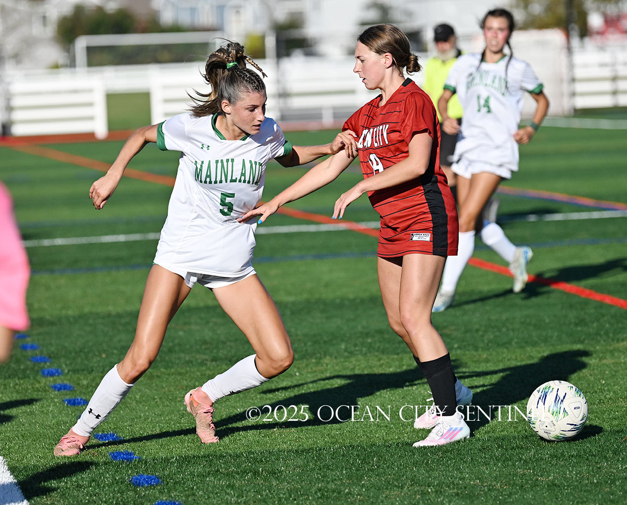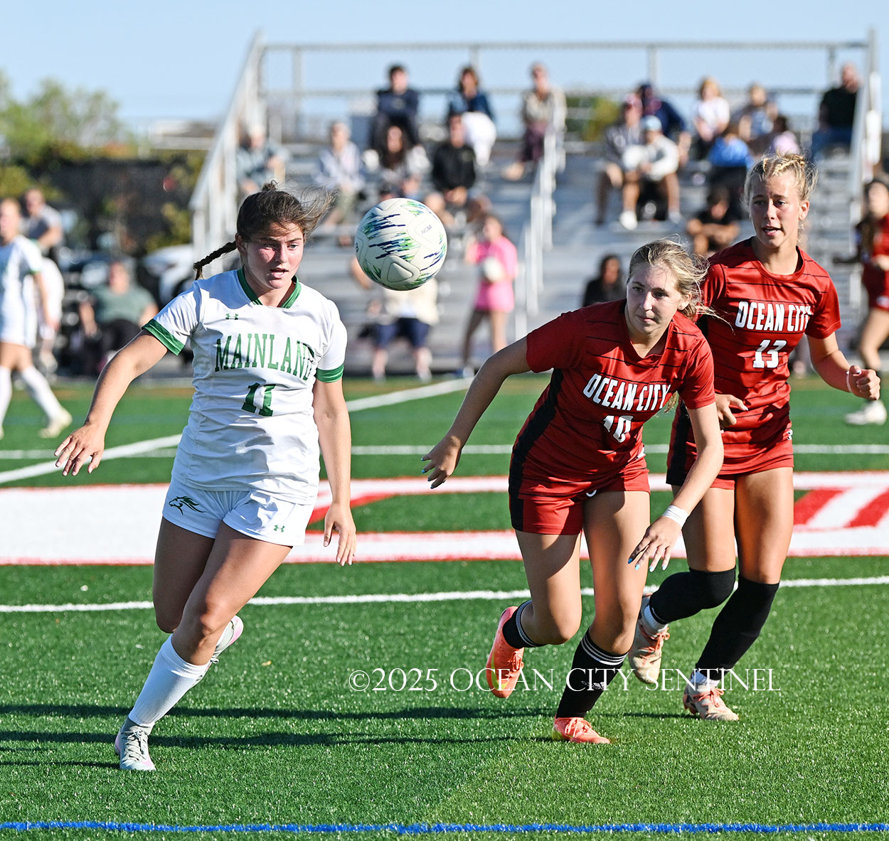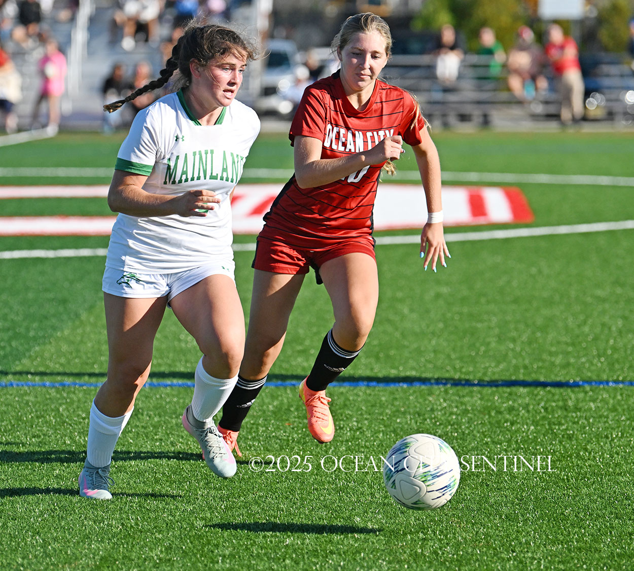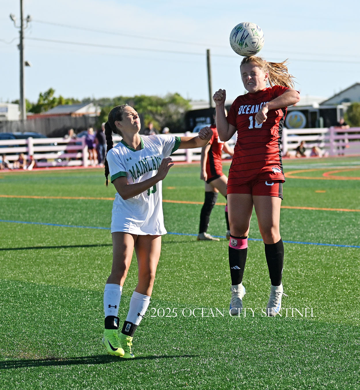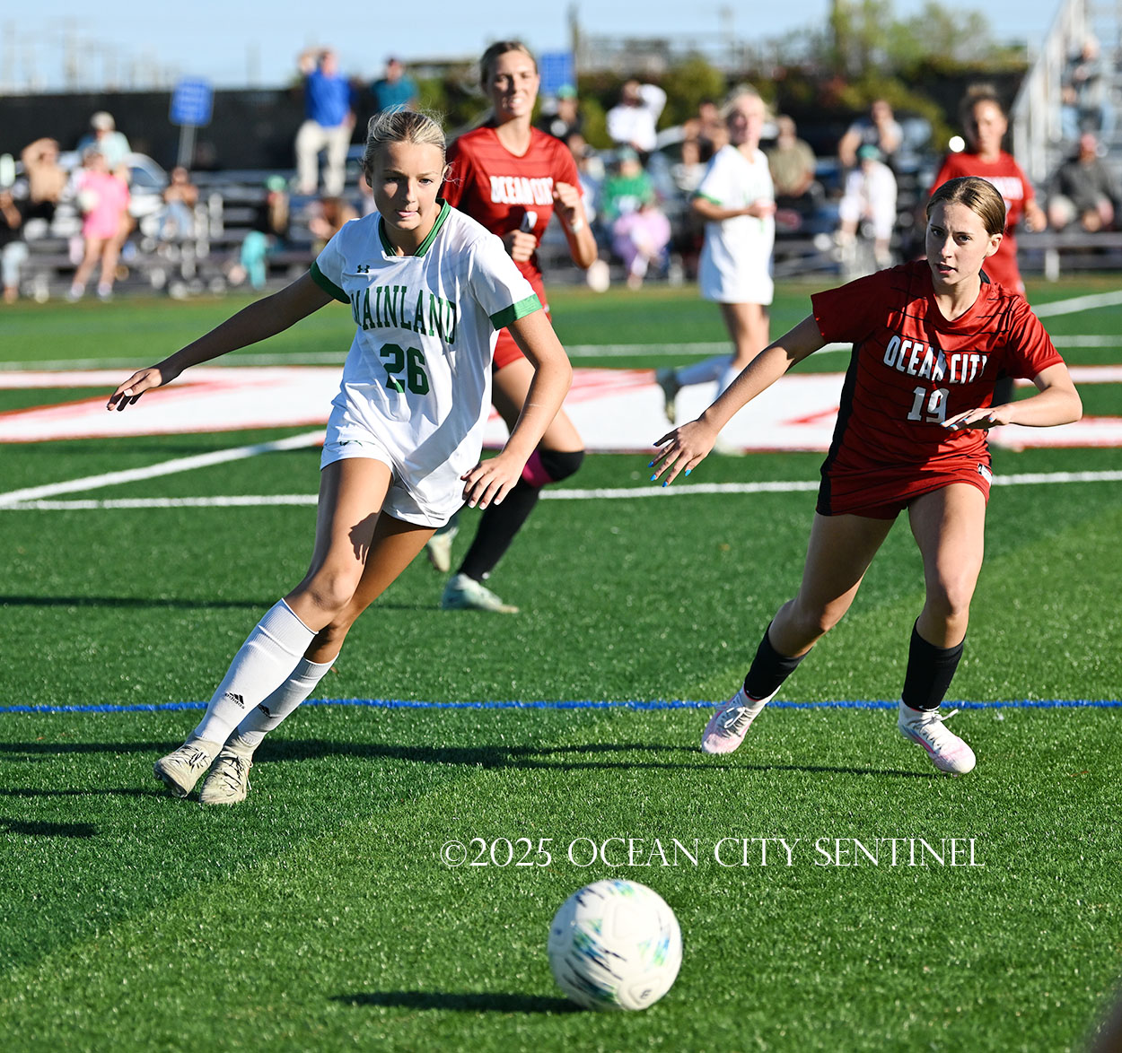 OCEAN CITY – Mya Dever scored a goal in the first and second halves to give Ocean City High School’s girls soccer team a victory over rival Mainland Regional Monday, but the Mustang girls didn’t show any quit, scoring late and pressing their attack until the end.