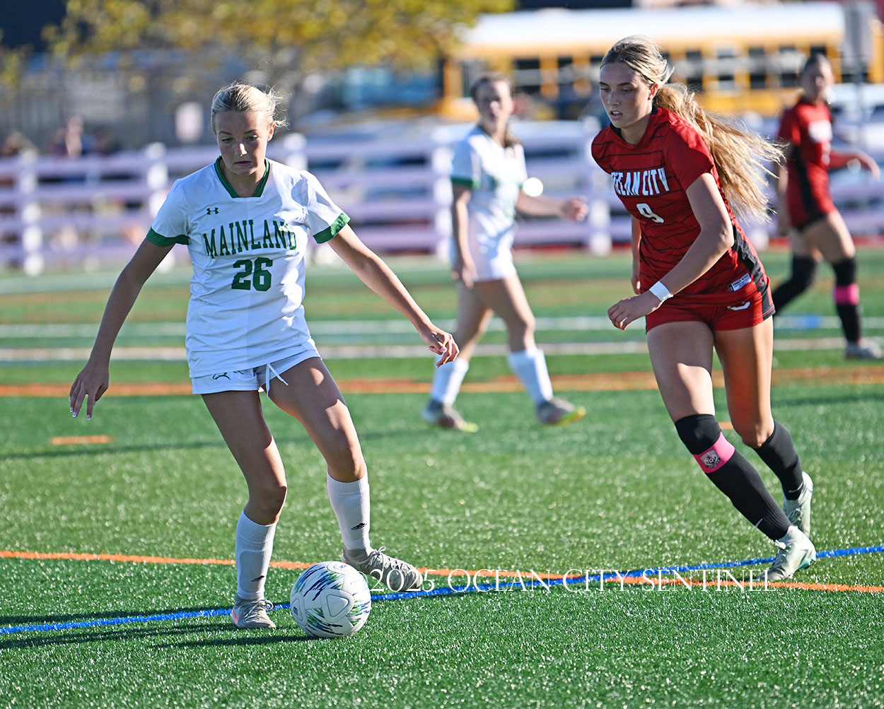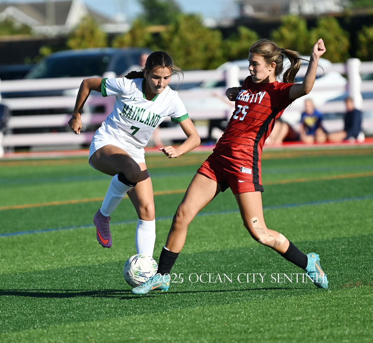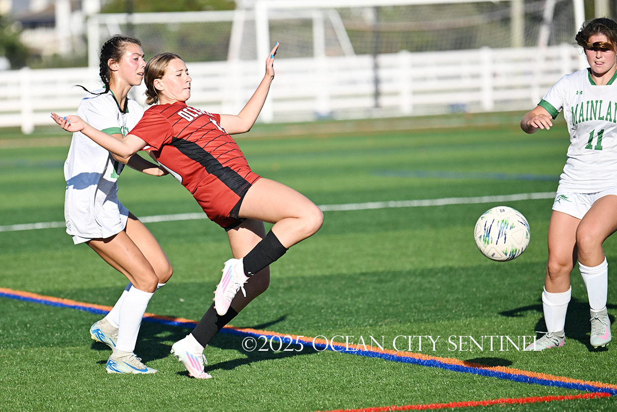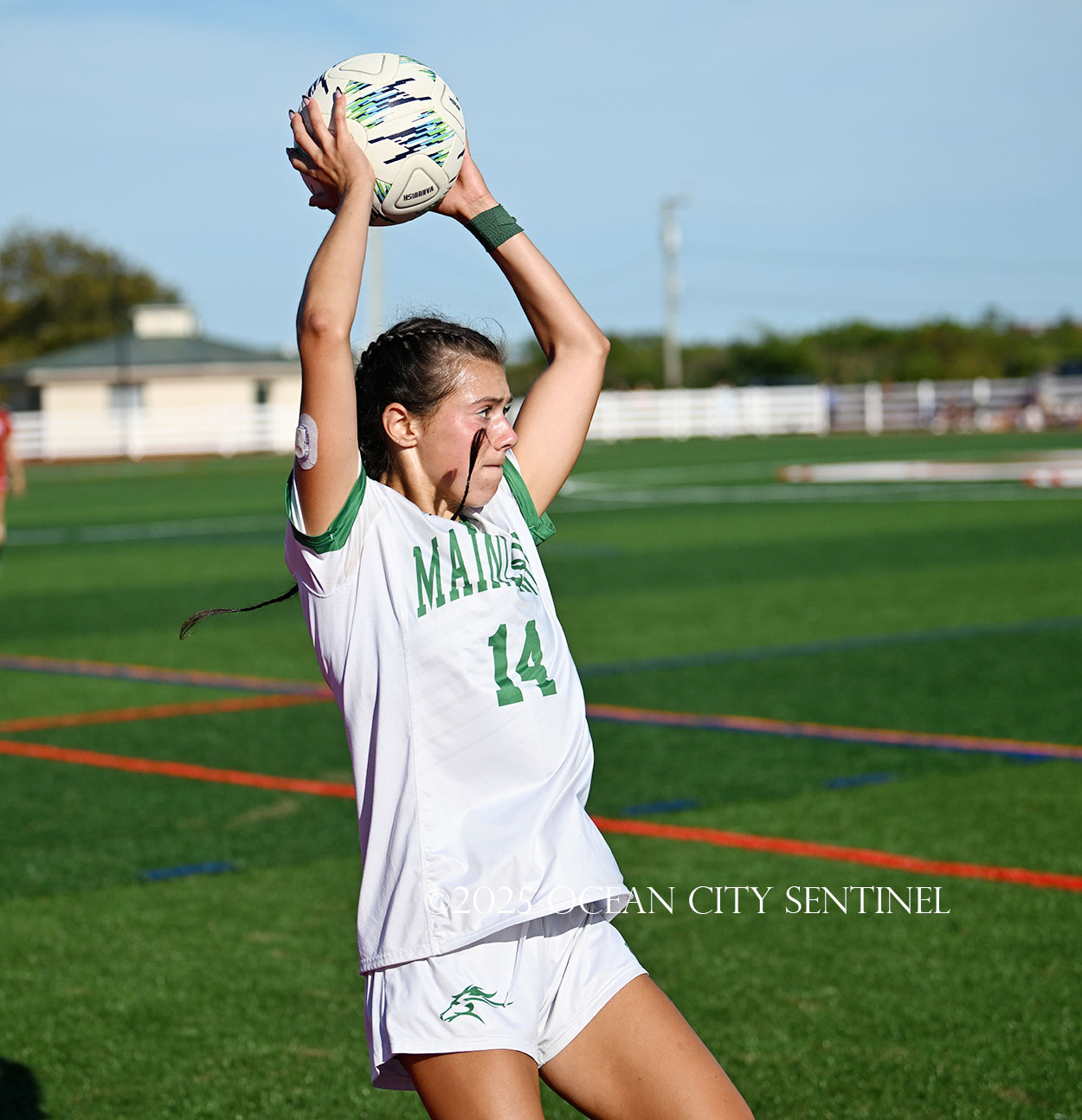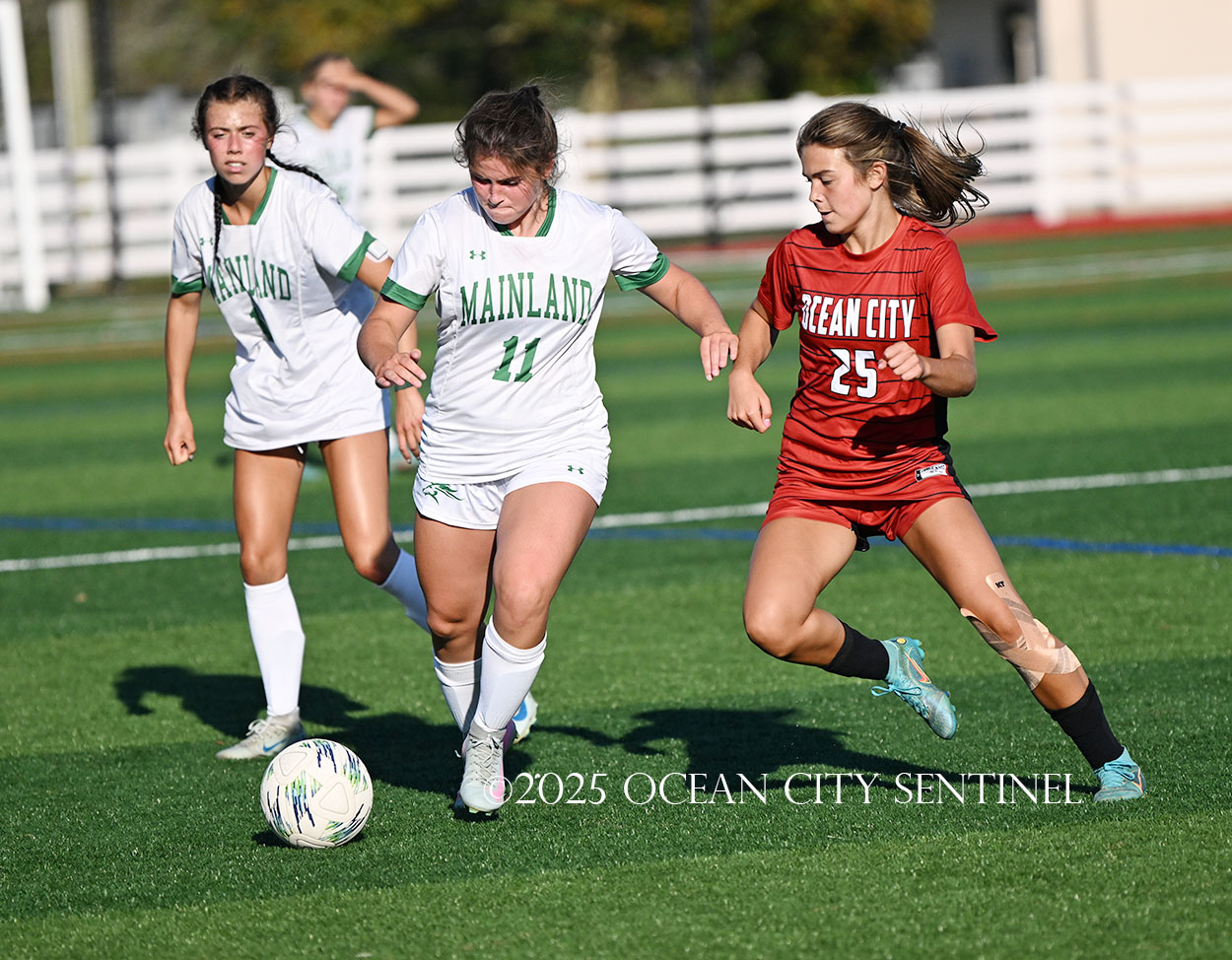 OCEAN CITY – Mya Dever scored a goal in the first and second halves to give Ocean City High School’s girls soccer team a victory over rival Mainland Regional Monday, but the Mustang girls didn’t show any quit, scoring late and pressing their attack until the end.