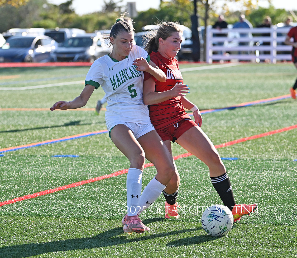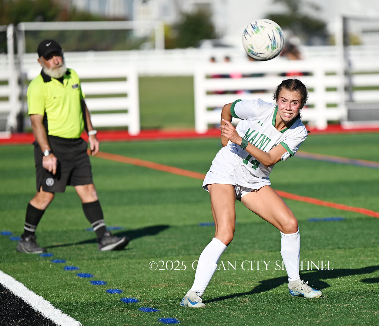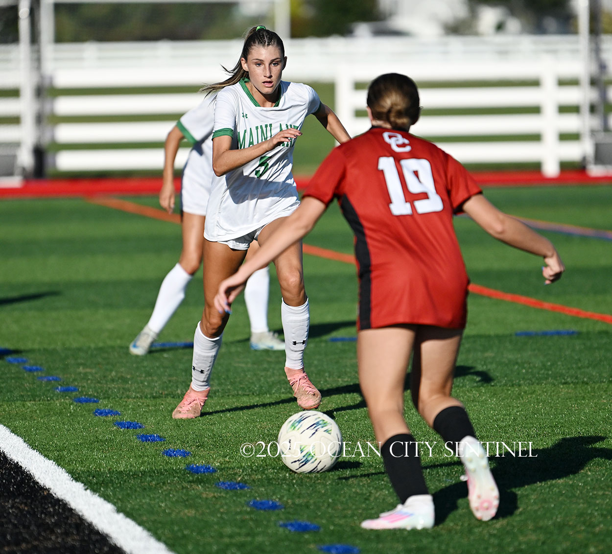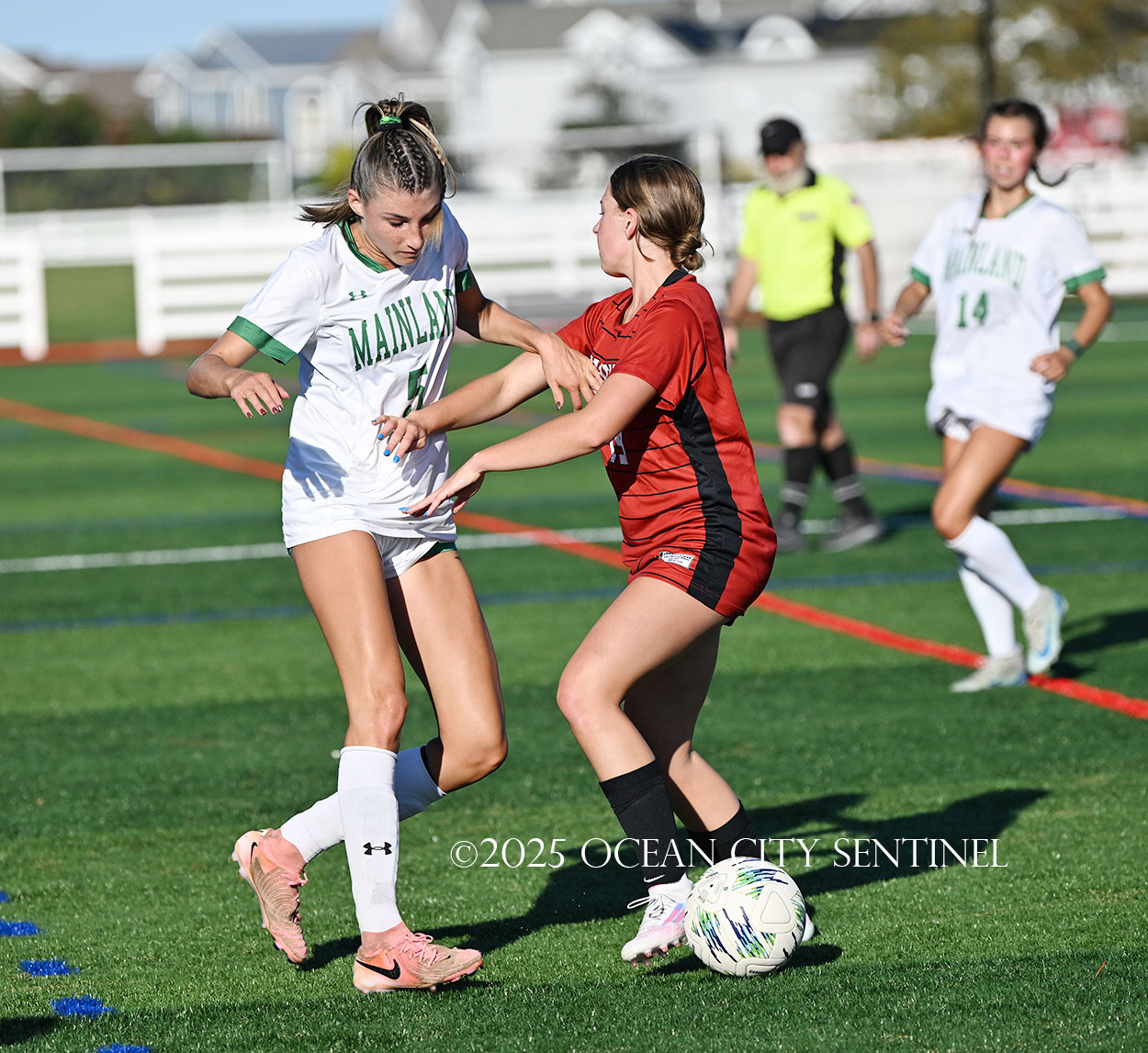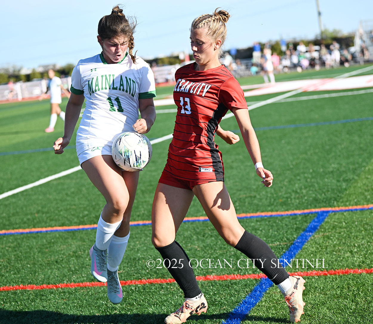 OCEAN CITY – Mya Dever scored a goal in the first and second halves to give Ocean City High School’s girls soccer team a victory over rival Mainland Regional Monday, but the Mustang girls didn’t show any quit, scoring late and pressing their attack until the end.