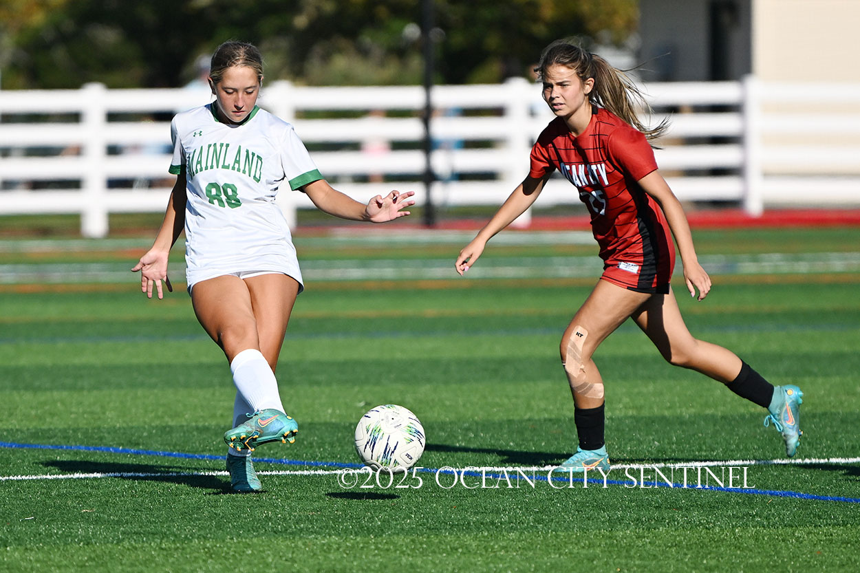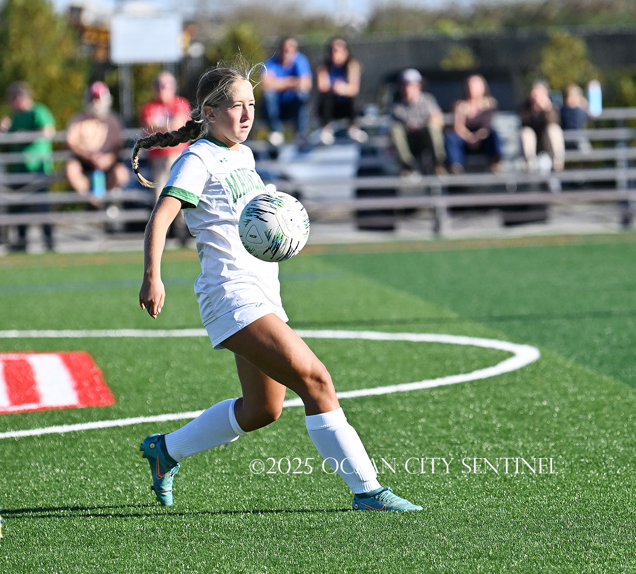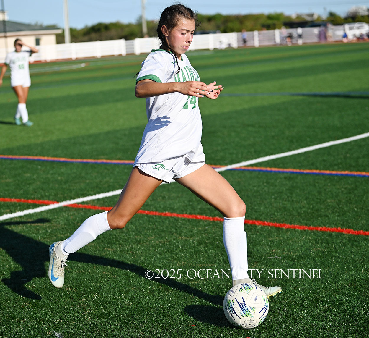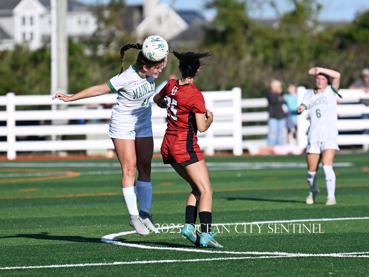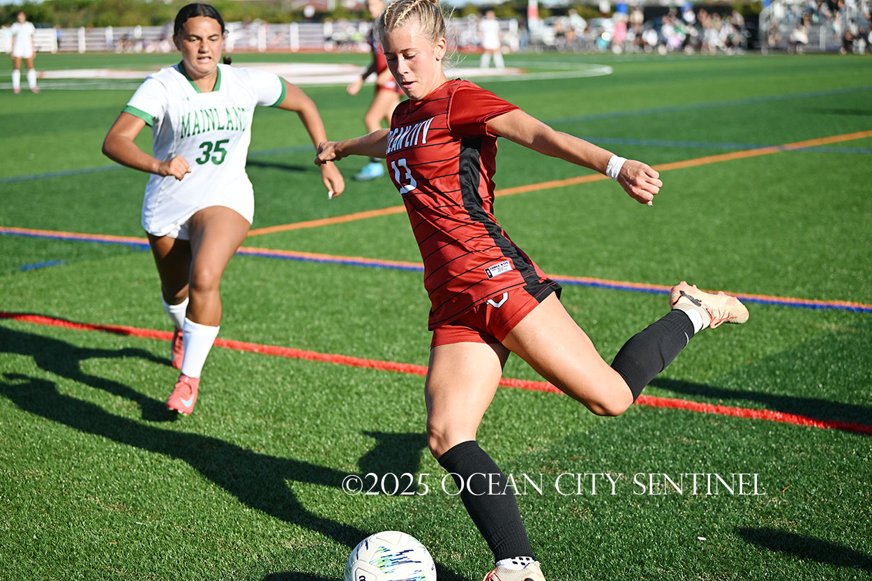 OCEAN CITY – Mya Dever scored a goal in the first and second halves to give Ocean City High School’s girls soccer team a victory over rival Mainland Regional Monday, but the Mustang girls didn’t show any quit, scoring late and pressing their attack until the end.
