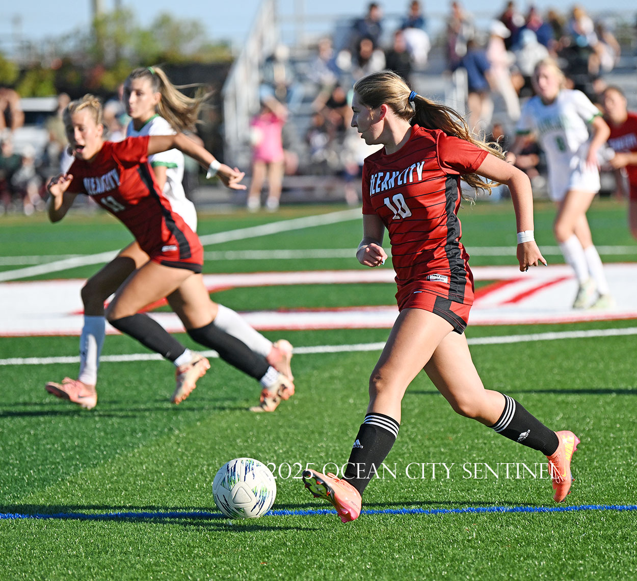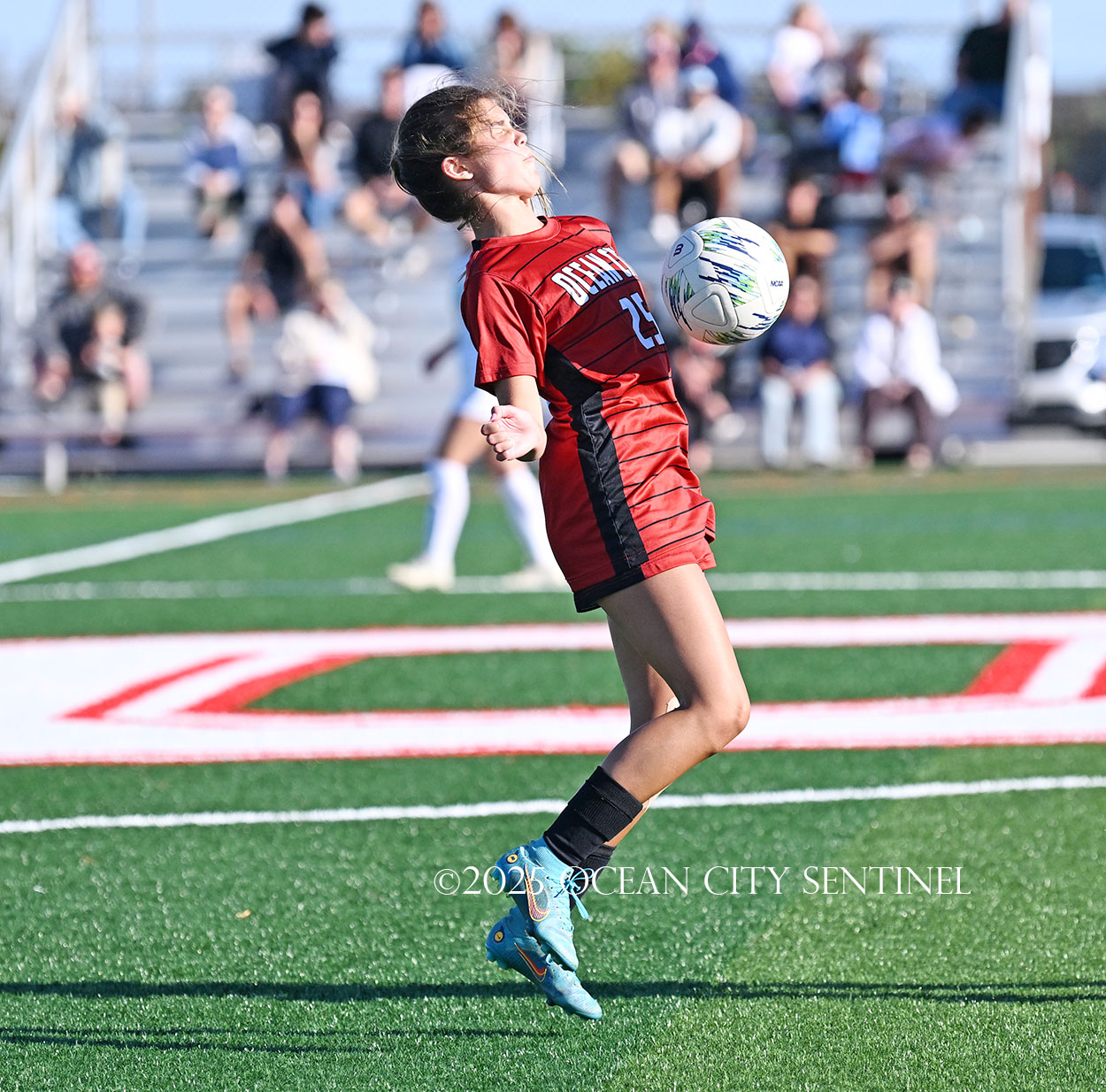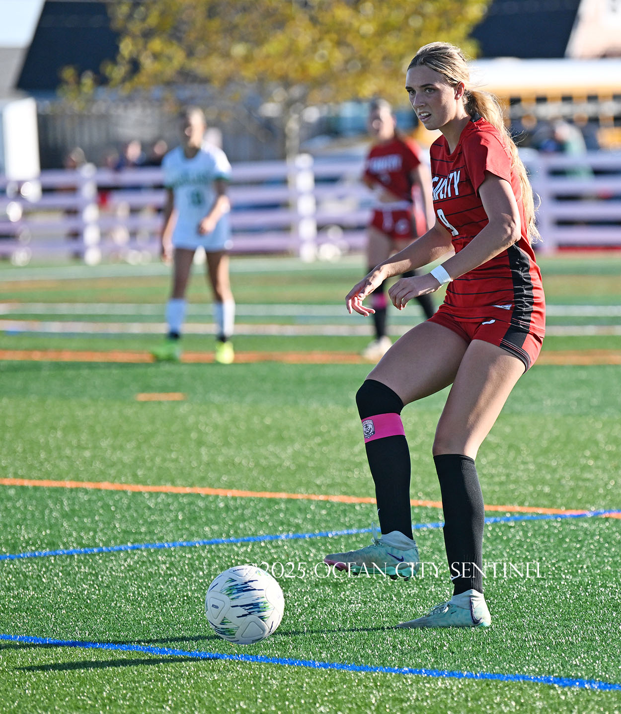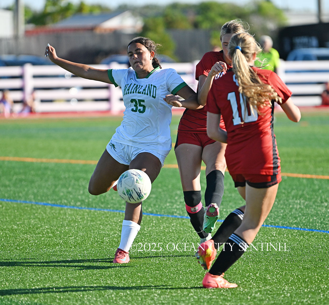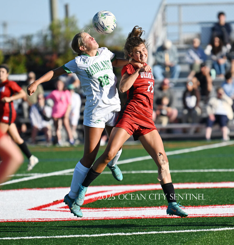 OCEAN CITY – Mya Dever scored a goal in the first and second halves to give Ocean City High School’s girls soccer team a victory over rival Mainland Regional Monday, but the Mustang girls didn’t show any quit, scoring late and pressing their attack until the end.