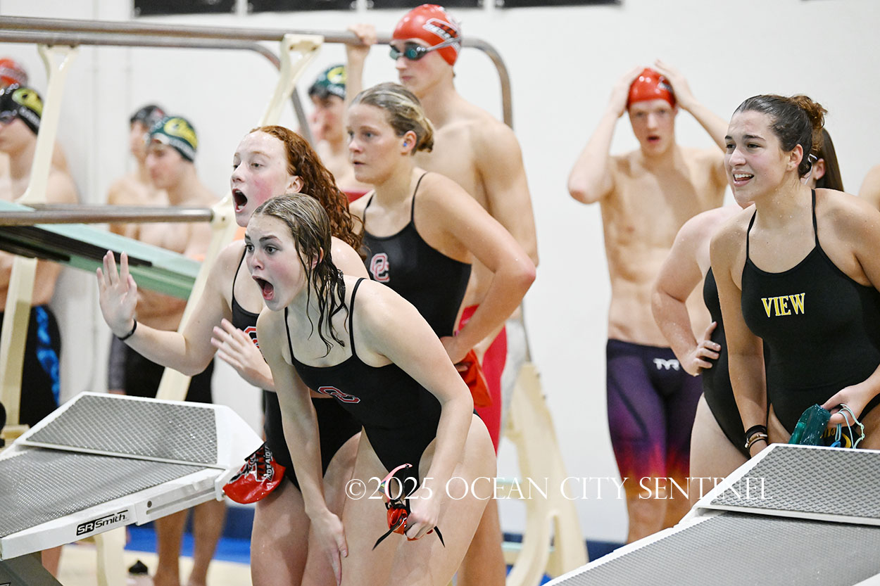 The teams battled through the final event, the 400 freestyle relay, with Clearview coming away with the win in 4:22.43 behind Brynn Schiavo, Propert, Duckworth and Allison Schiavo. Just over a tenth of a second later were Aiken, Elder, Gallagher and Stauffer in 4:22.55. Ocean City’s Carina Mattern, Coryn Driscoll, Grace Hays and Hope Robbins were second.