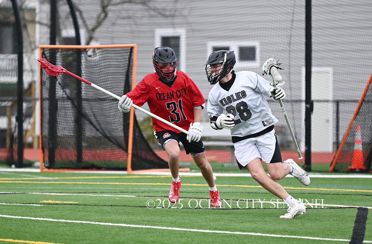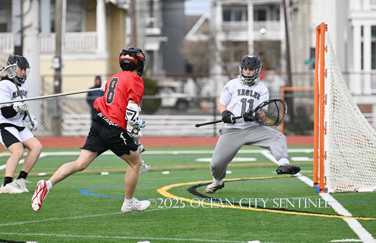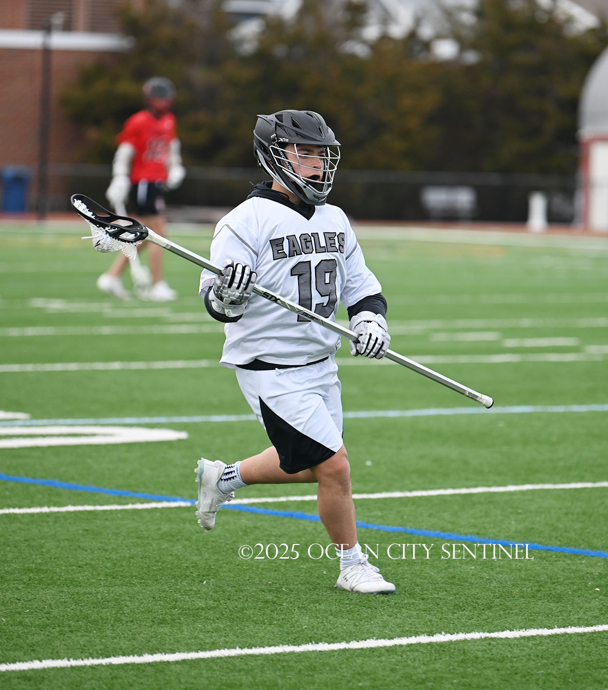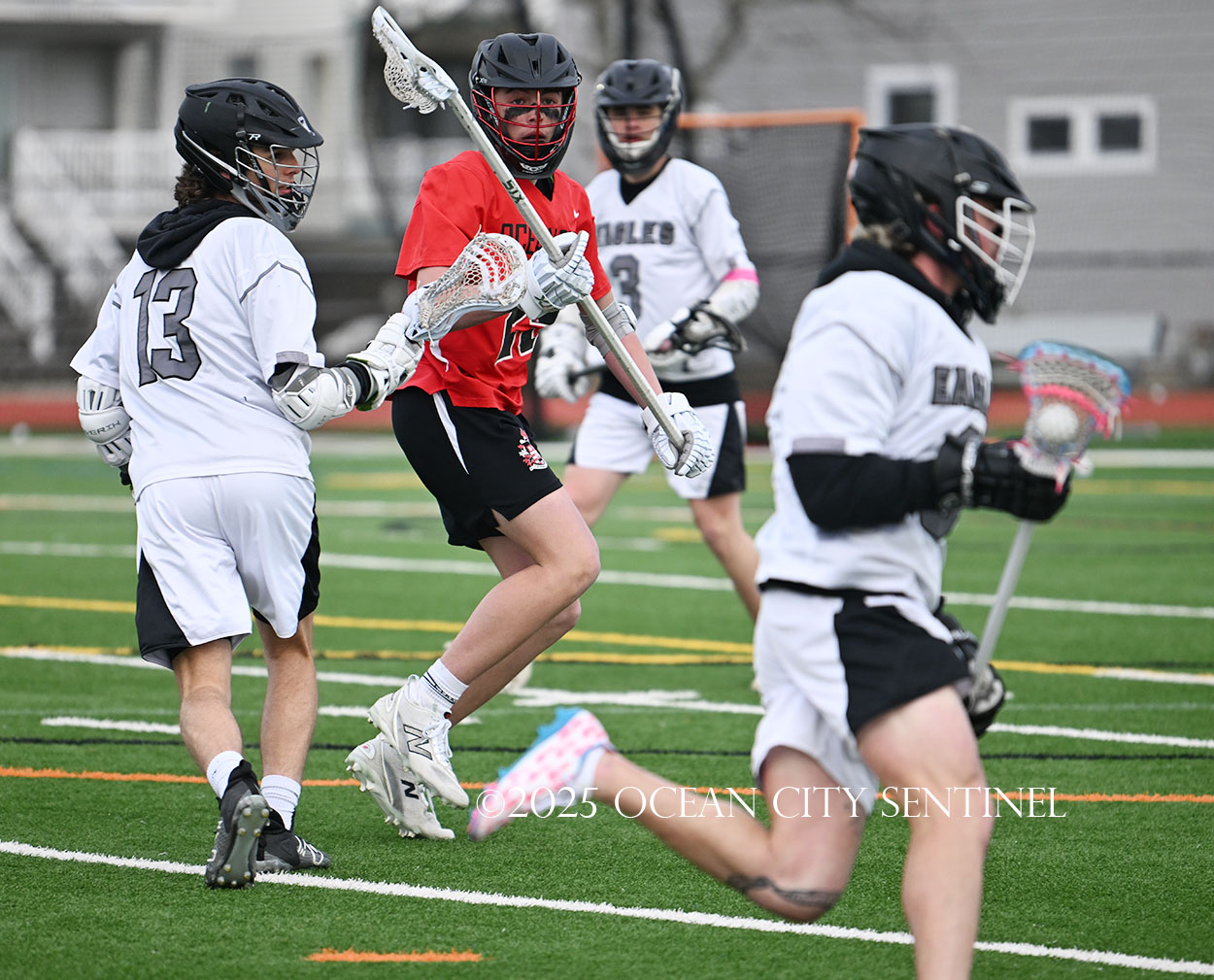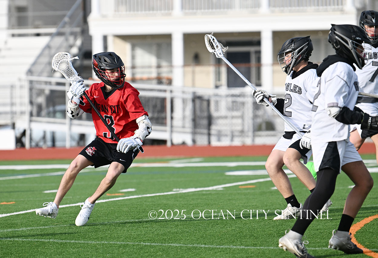 New face-off specialist for Ocean City, Chris Garrabrant, won 70 percent of his face-offs against the Eagles and helped fuel the Raider offense. He also scored a goal himself after he won a face-off and charged down the field for a quick solo shot that reached the back of the net. Bryce Hanin and Michael Marczyk had two goals each and Liam Weber, Kai Cooke, Bruce Hunt, Nolan O’Kane and Charlie Beseris had a goal each.