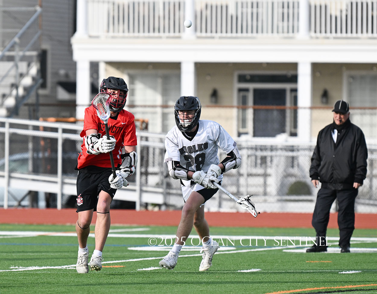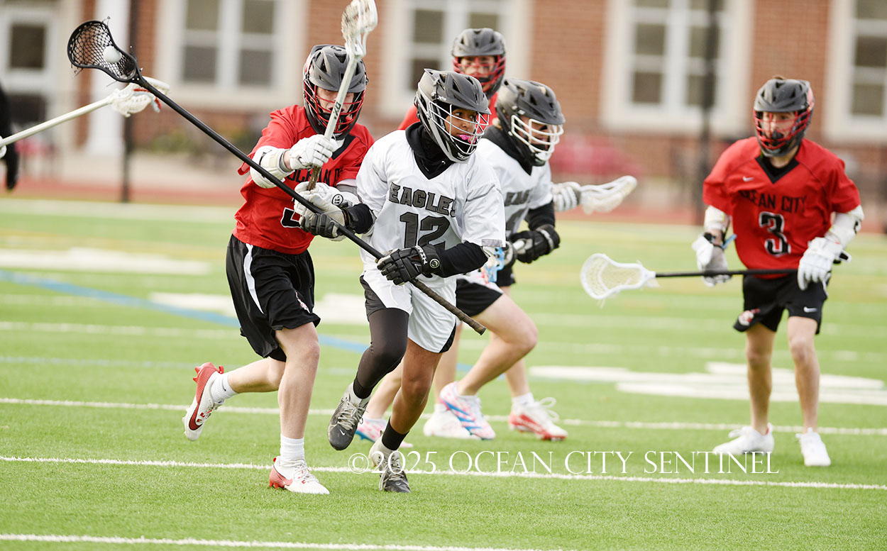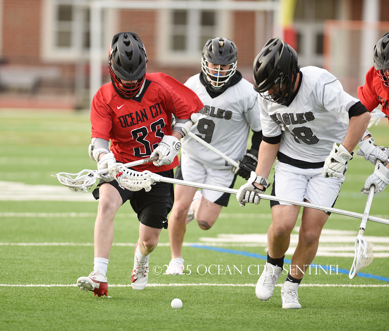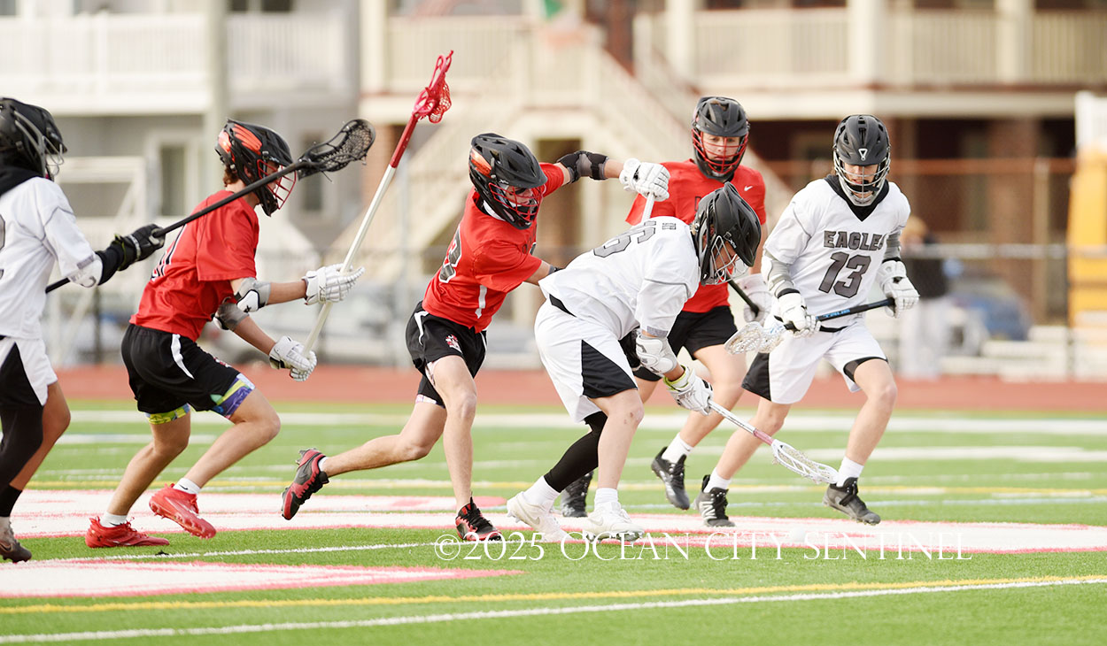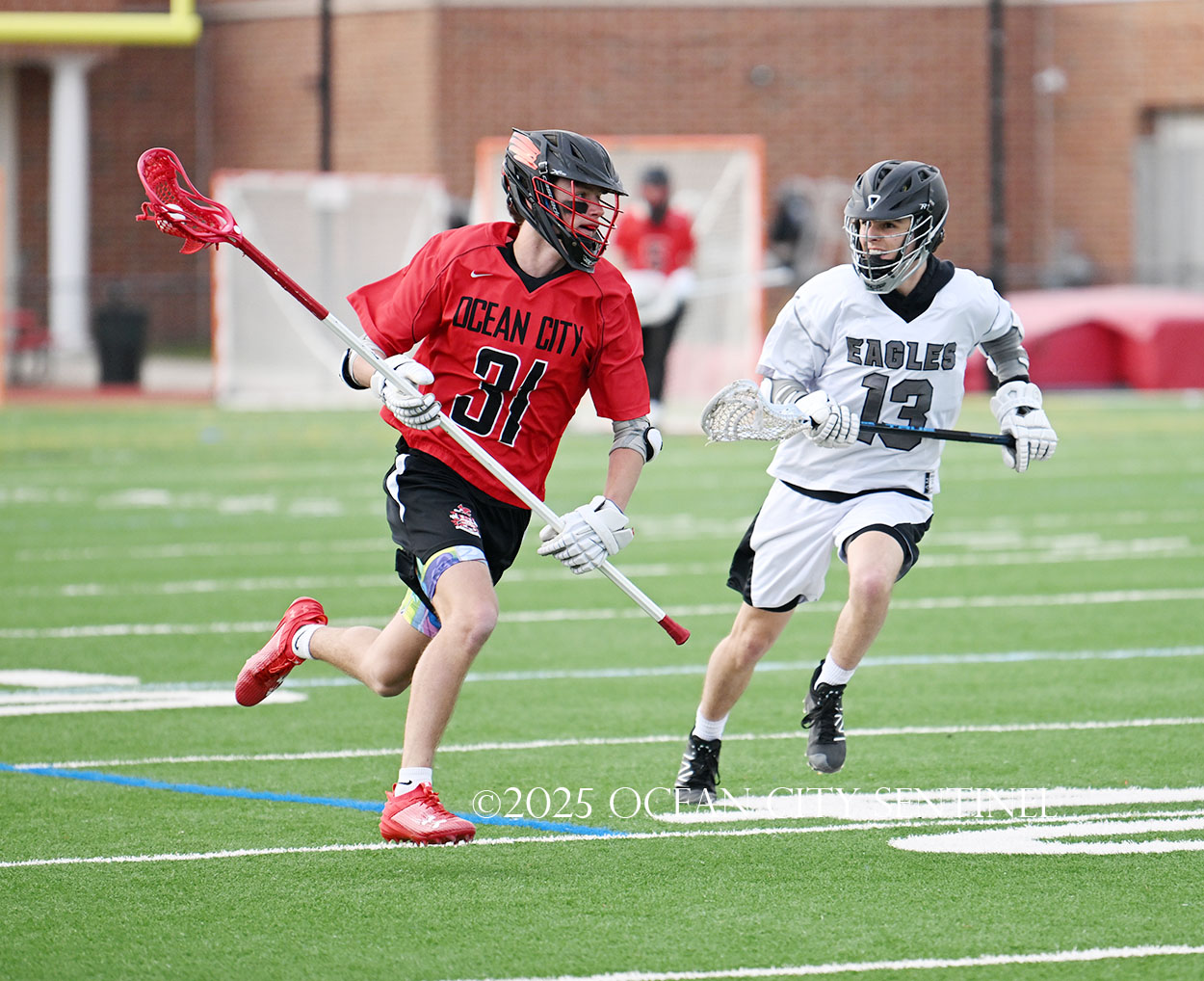 New face-off specialist for Ocean City, Chris Garrabrant, won 70 percent of his face-offs against the Eagles and helped fuel the Raider offense. He also scored a goal himself after he won a face-off and charged down the field for a quick solo shot that reached the back of the net. Bryce Hanin and Michael Marczyk had two goals each and Liam Weber, Kai Cooke, Bruce Hunt, Nolan O’Kane and Charlie Beseris had a goal each.