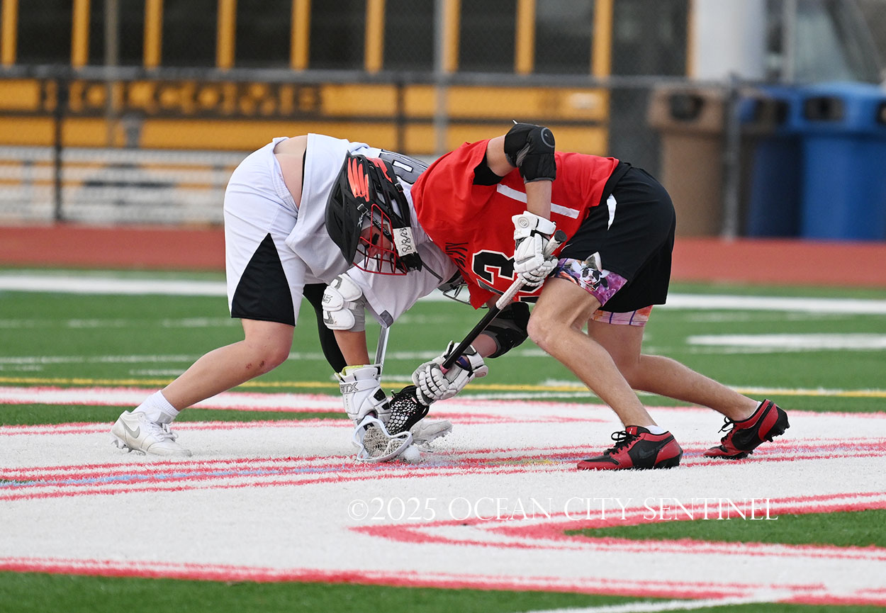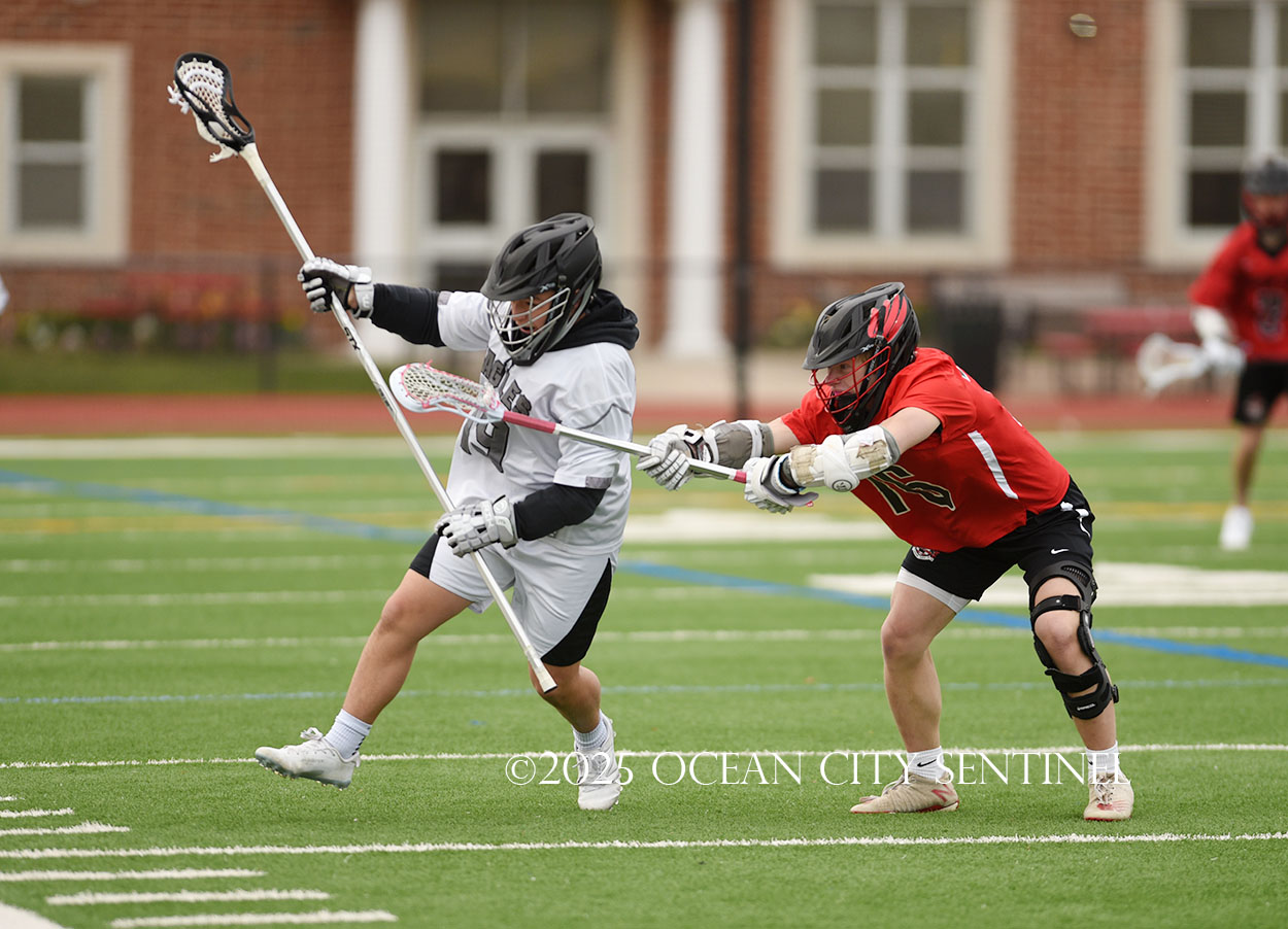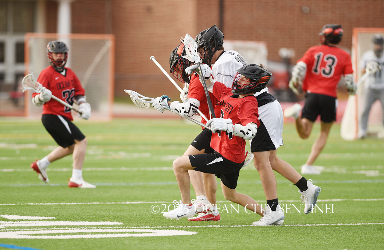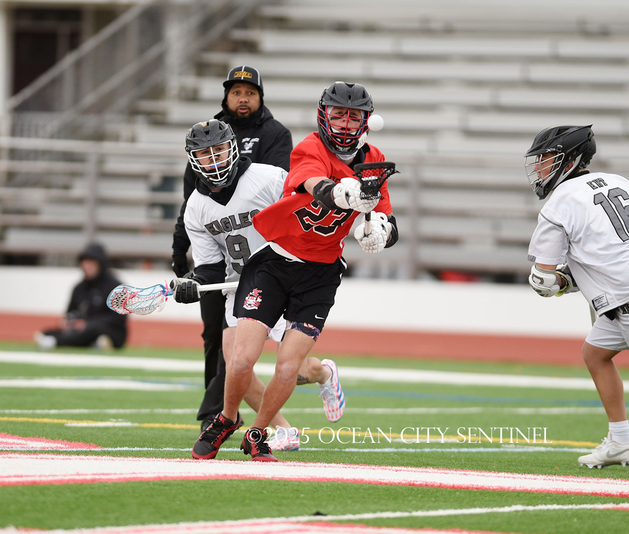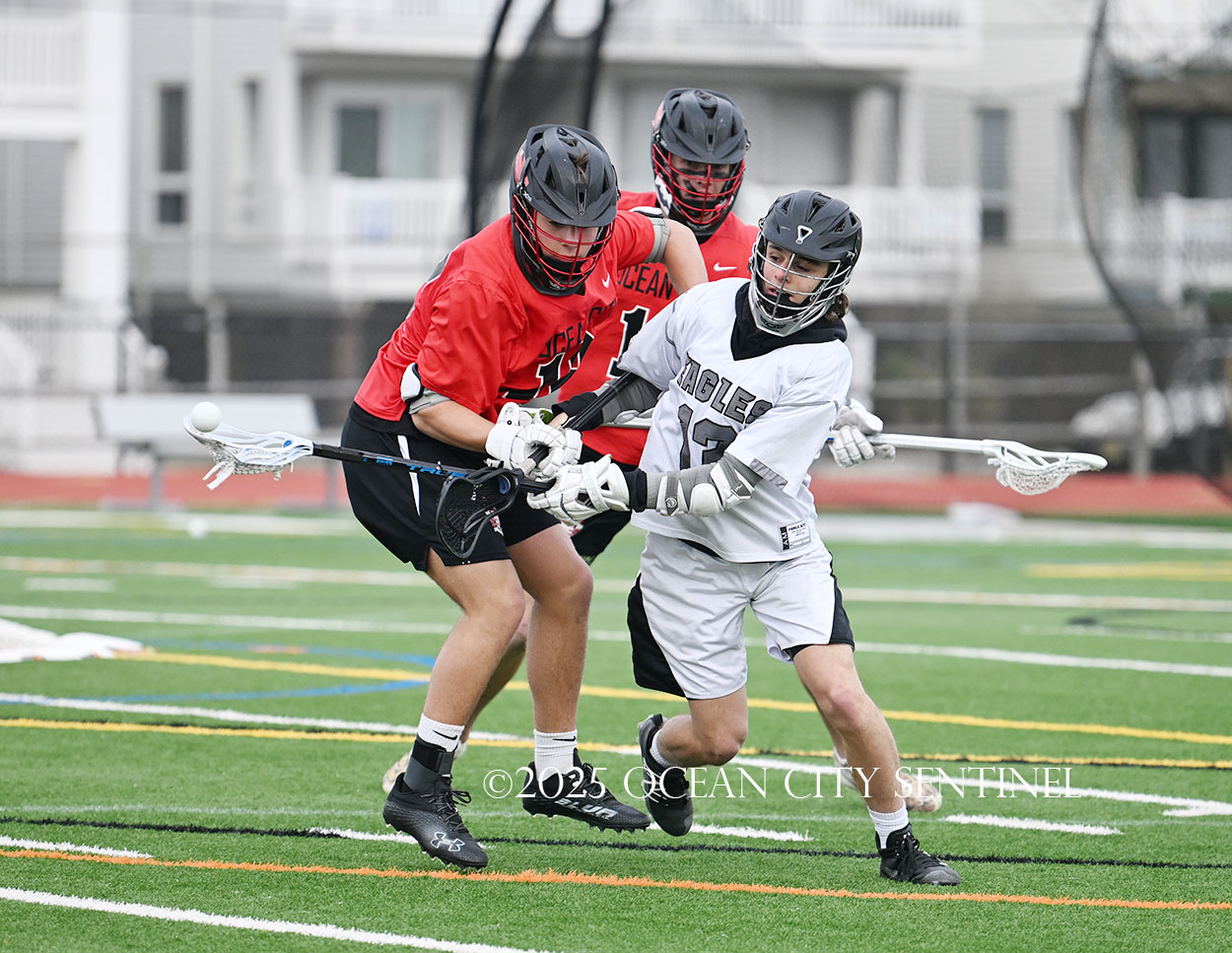 New face-off specialist for Ocean City, Chris Garrabrant, won 70 percent of his face-offs against the Eagles and helped fuel the Raider offense. He also scored a goal himself after he won a face-off and charged down the field for a quick solo shot that reached the back of the net. Bryce Hanin and Michael Marczyk had two goals each and Liam Weber, Kai Cooke, Bruce Hunt, Nolan O’Kane and Charlie Beseris had a goal each.