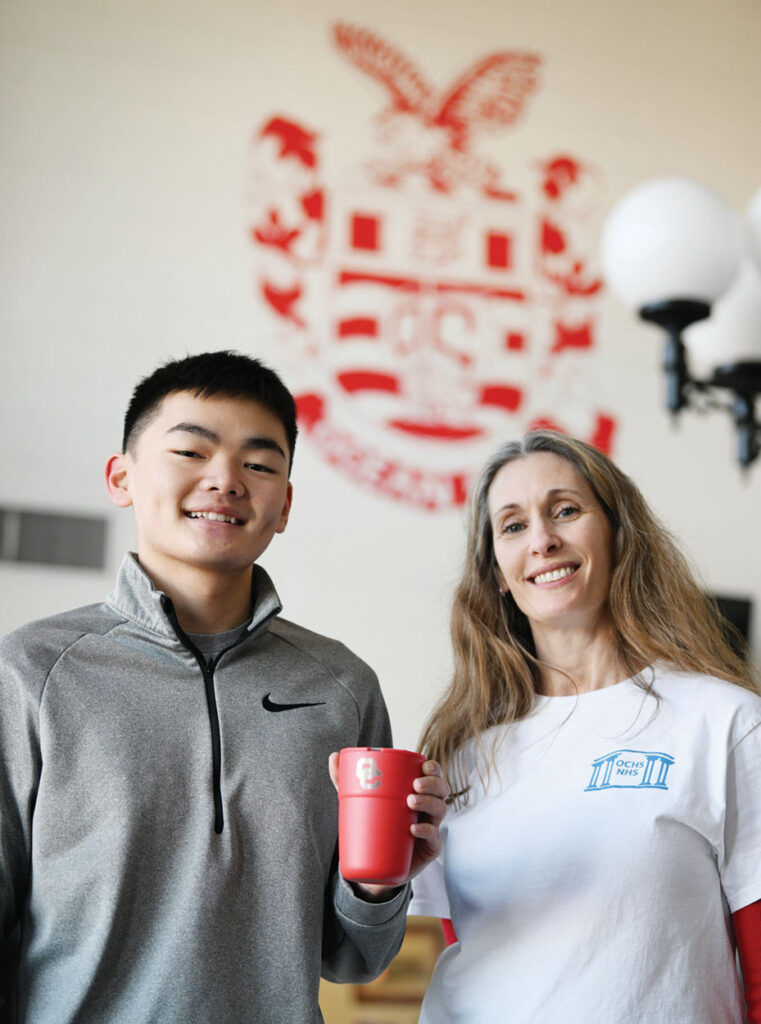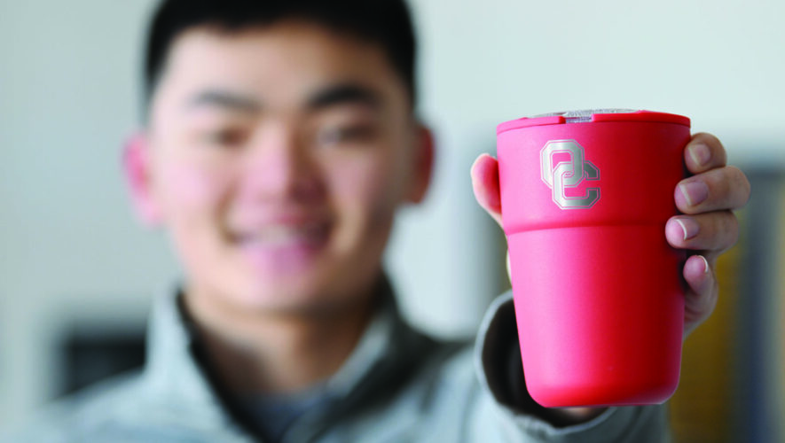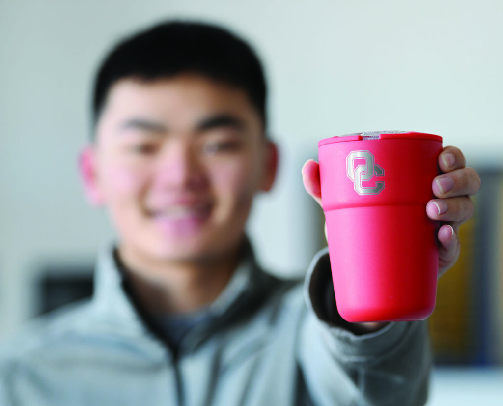 He and his adviser at OCHS, Catherine Georges, raised $11,000 to provide every student at the high school with a reusable cup made in Australia that contains 75 percent recycled steel. The cups, powder-coated red and engraved with the OCHS logo, were distributed for free to all the students in February.