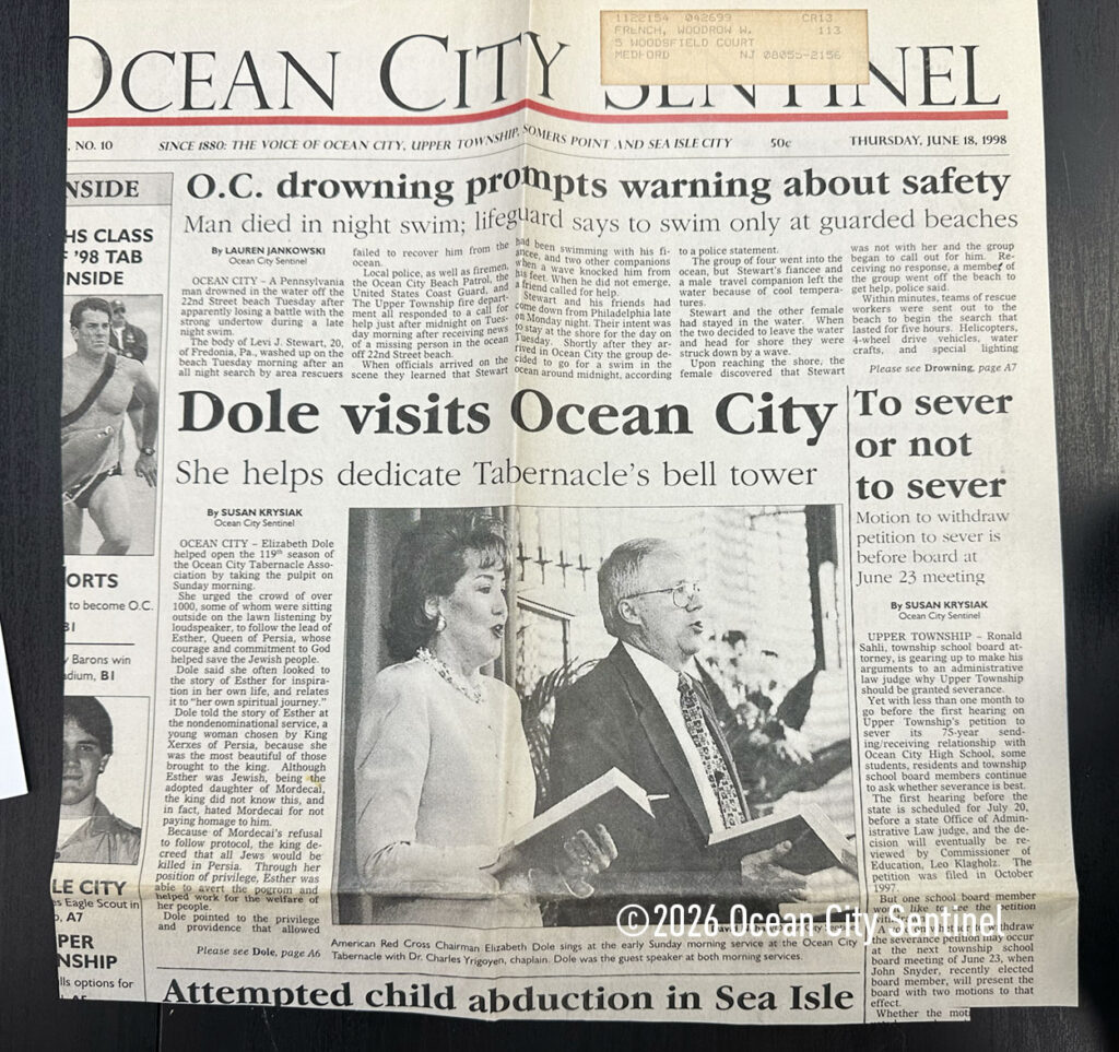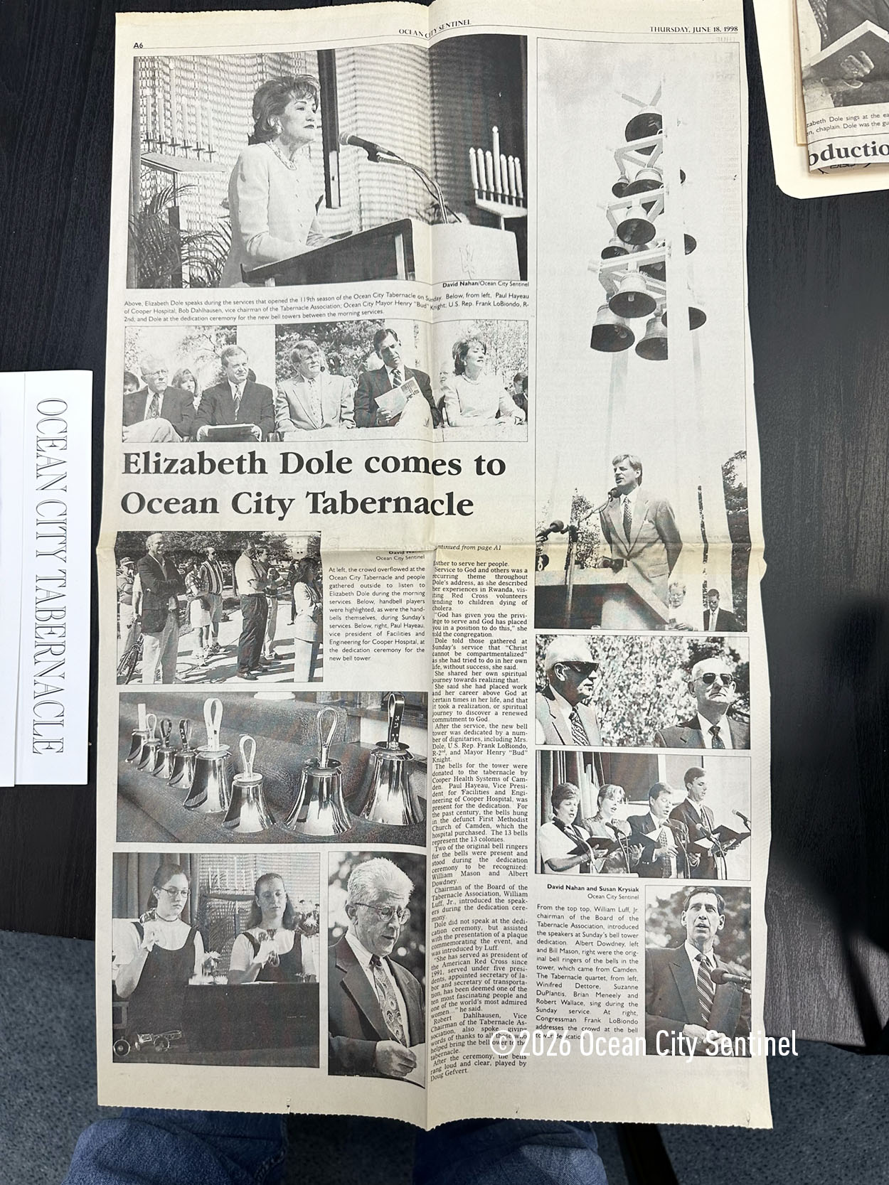 The Ocean City Sentinel (including this reporter/photographer) was there to capture Dole as speaker and the bell ceremony. Former U.S. Rep. Frank LoBiondo offered remarks, as did former mayor Henry “Bud” Knight, and Robert Dalhausen, then vice chairman of the board. William Luff Jr. was the chairman of the board of the Tabernacle Association then and J. Robert Buck was the president and chief executive officer.