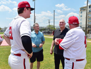 Ocean City High School baseball player Tommy Finnegan, left, and volunteer coach Frank Coppenbarger, right, talk to former Philadelphia Phillies managers Larry Bowa and Charlie Manuel at the Fifth Street baseball field in Ocean City Wednesday afternoon.