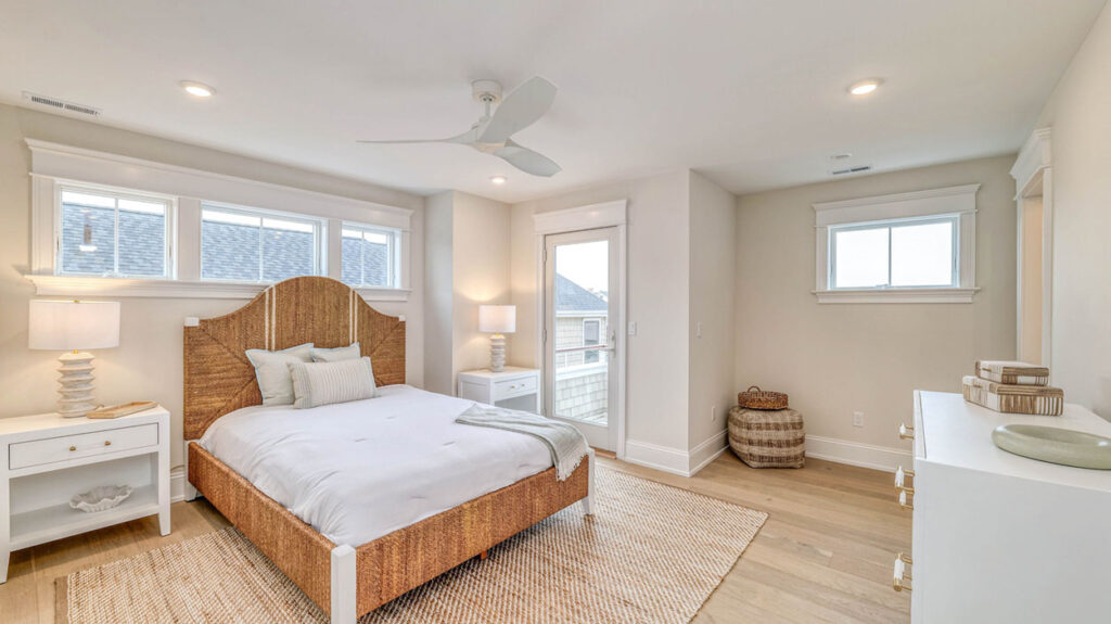 Up one more flight of steps is the final bedroom, which encompasses the entire top floor. Featuring a multiangled ceiling, it has two separate spaces, one for a bed near the full bathroom and another perfect for a home video game haven, art studio or home gym. There also is a sliding glass door opening onto a private rooftop deck, the perfect vantage point for watching the sun set on another great day at the shore.