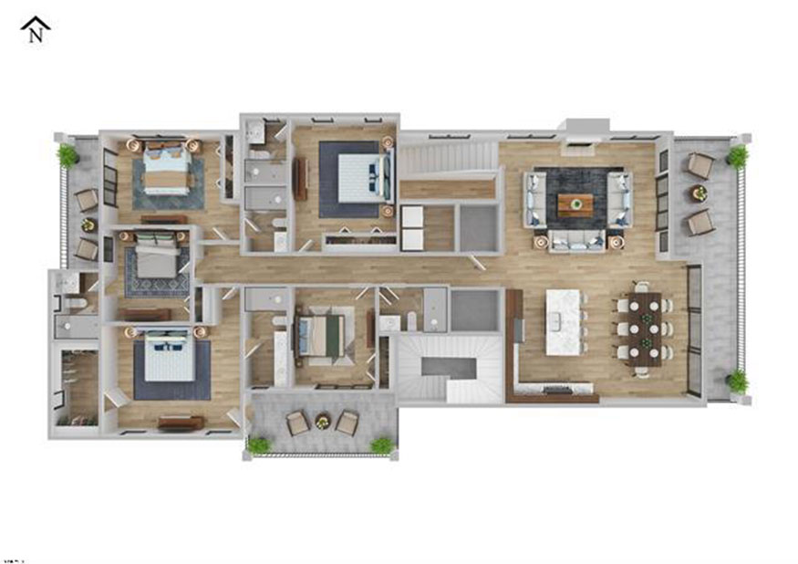 The third bedroom is in the rear right corner, where a sliding glass door opens onto a private deck overlooking the street, while the fourth is sandwiched between the third and the primary suite in the left corner.