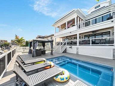 “Step outside to enjoy one of the six decks, four offering jaw-dropping views of fiery sunsets over the bay,” McGonigle said. “Dive into your private in-ground pool, challenge friends to a round on the putting green or take your boat out with ease thanks to the state-of-the-art lift.” Out front, composite stairs ascend to the porch, covered by a second-floor deck with a mahogany plank ceiling matching the one out back.