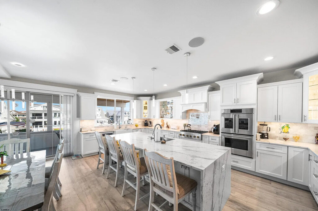 A dining area just inside double sliding glass doors with plantation shutters is just steps away from the kitchenette, where a huge center island provides seating for eight.