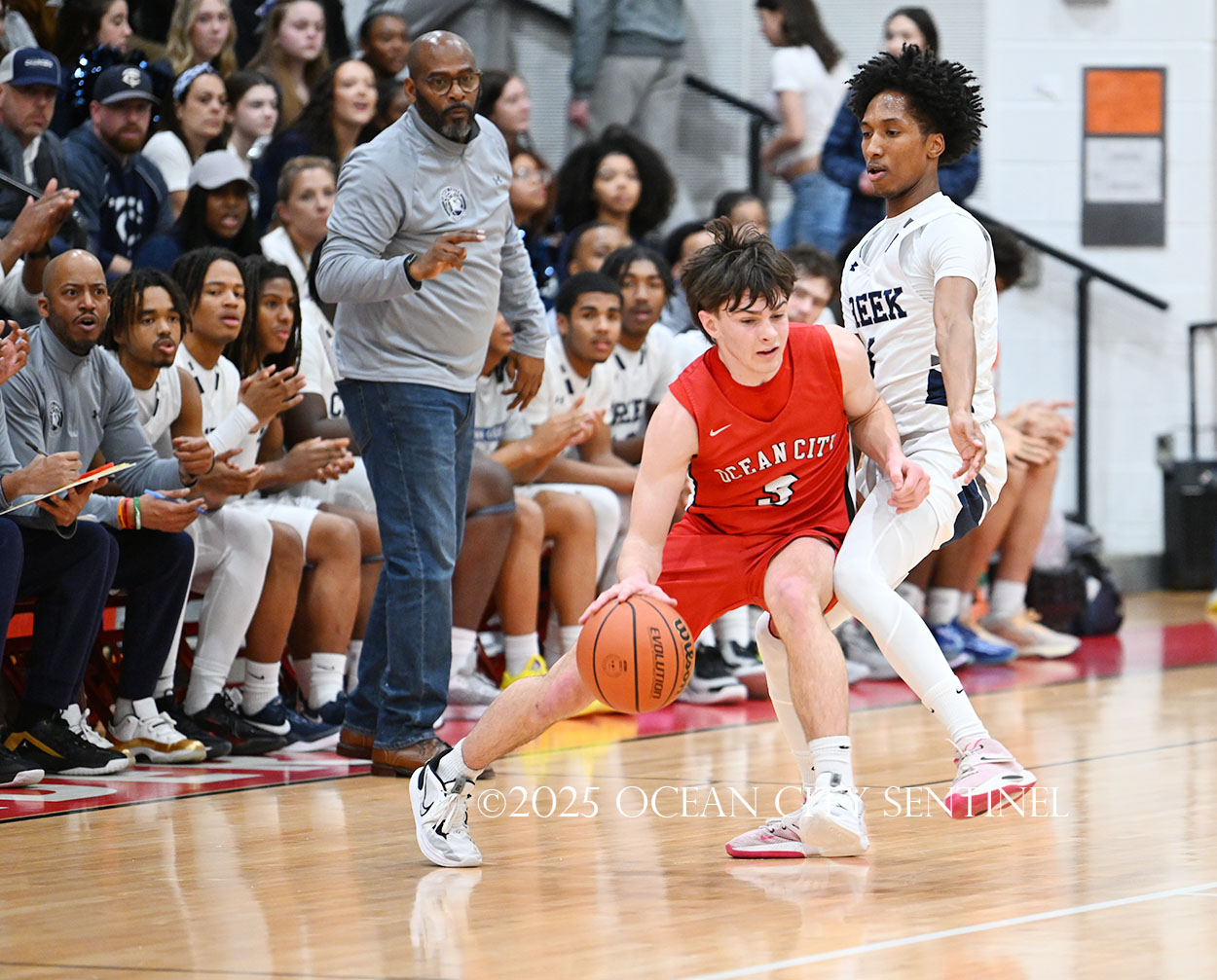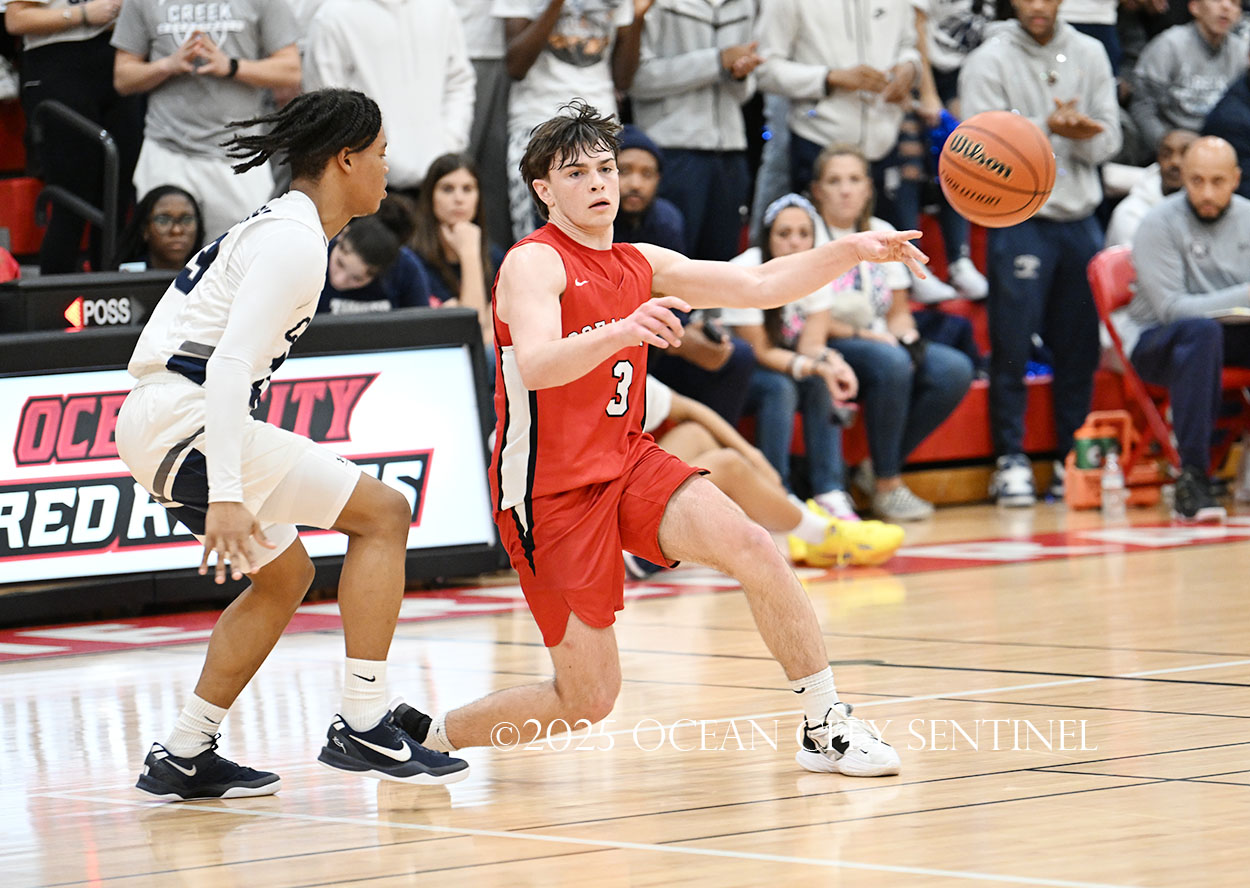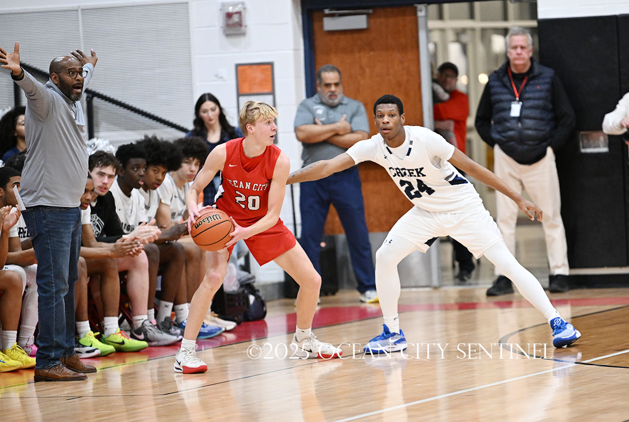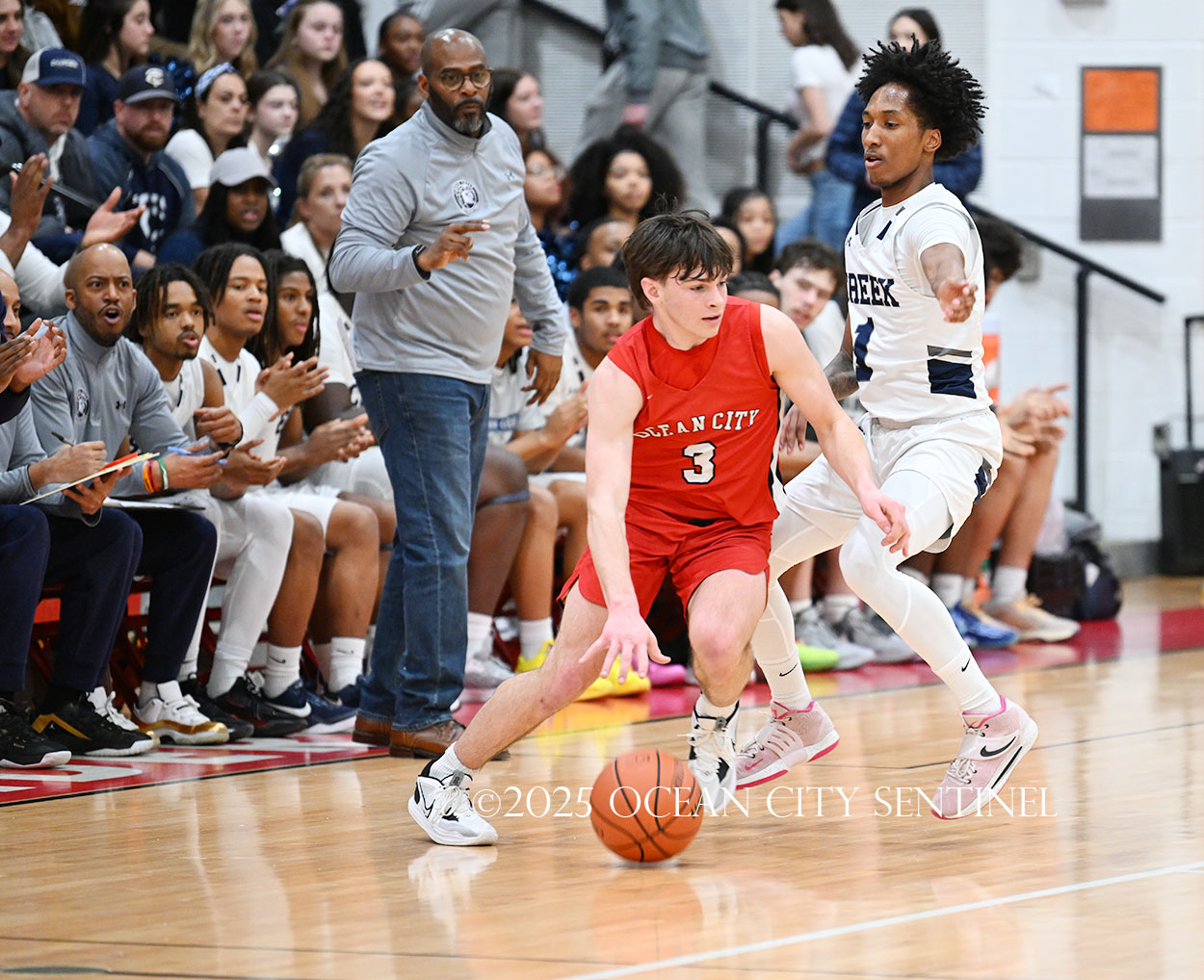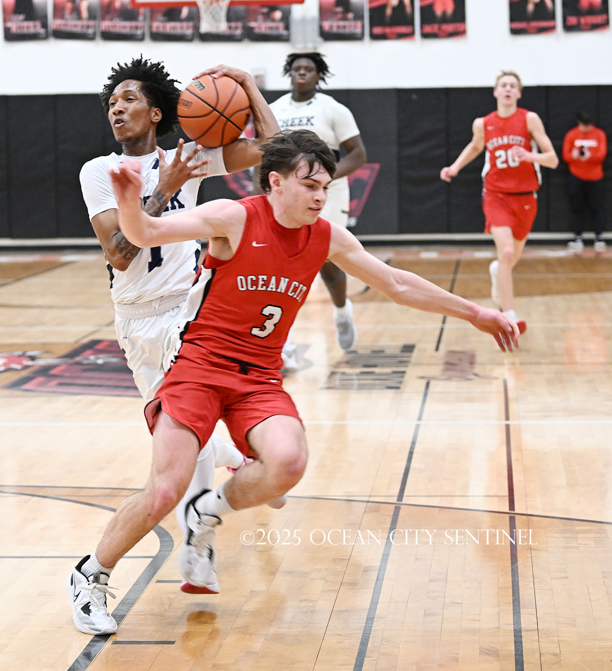 Four foul shots by Tjourmakaris and a three-pointer by Leon Brown helped put Ocean City up 33-24 early in the third quarter, but Timber Creek responded to narrow it to 35-32 with under two minutes to go. Lenko hit a trey with another score by the visitors for a four-point, 38-34 lead heading into the fourth quarter.