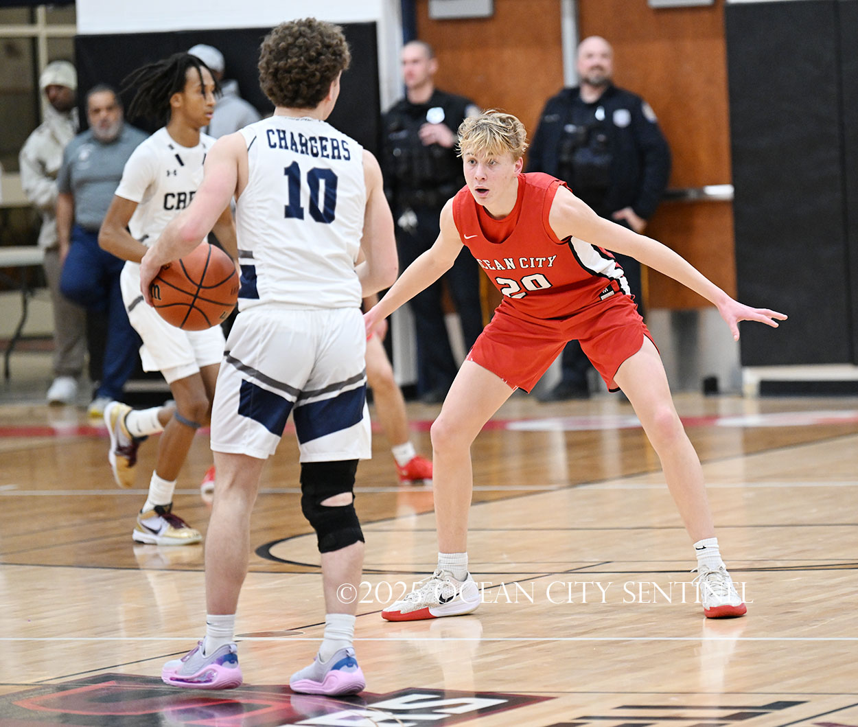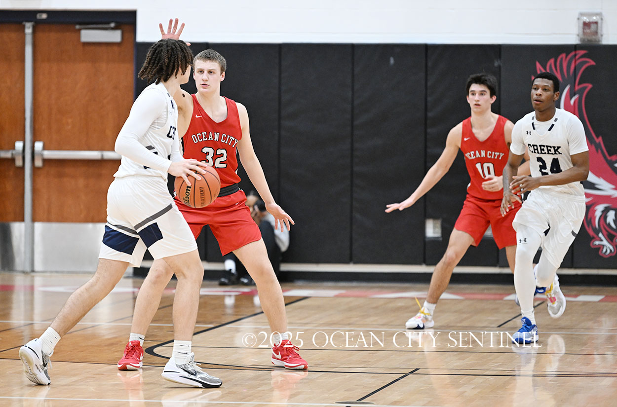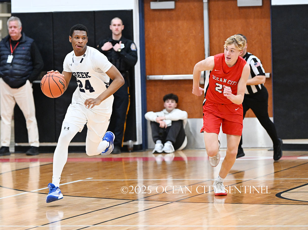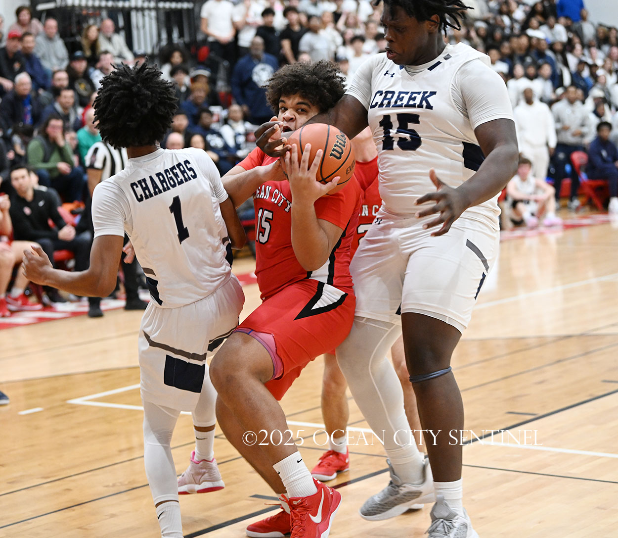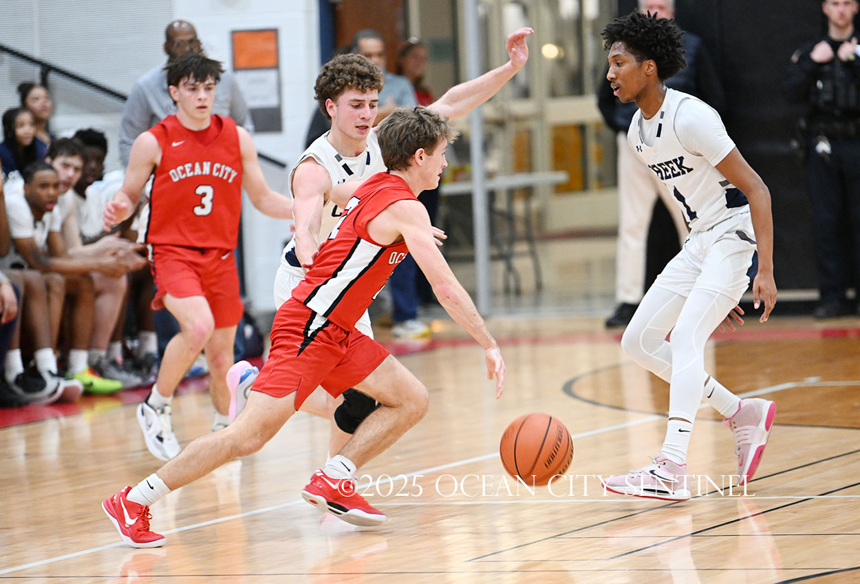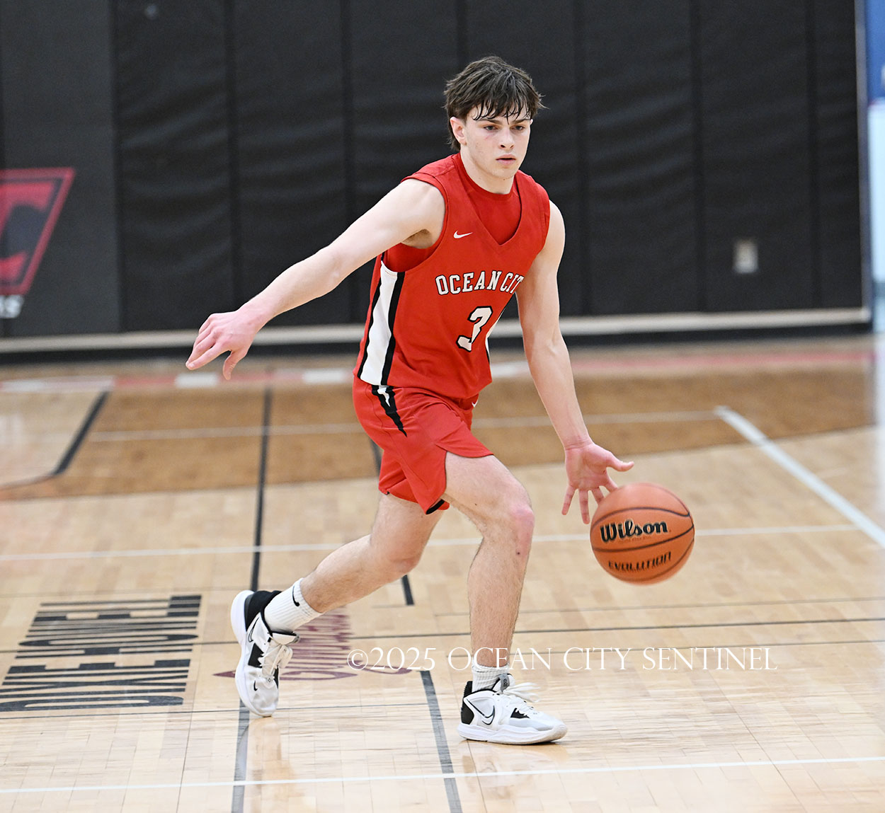 Four foul shots by Tjourmakaris and a three-pointer by Leon Brown helped put Ocean City up 33-24 early in the third quarter, but Timber Creek responded to narrow it to 35-32 with under two minutes to go. Lenko hit a trey with another score by the visitors for a four-point, 38-34 lead heading into the fourth quarter.