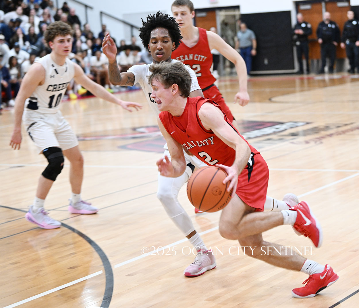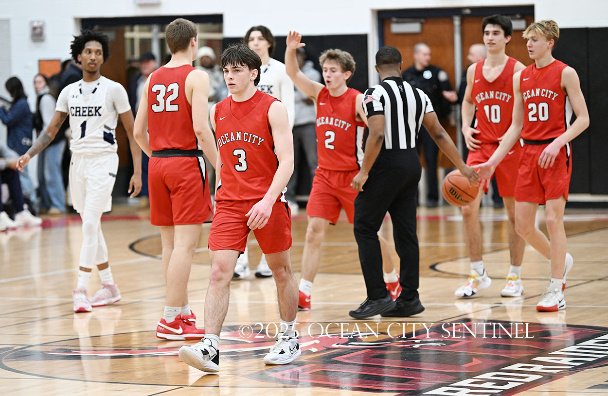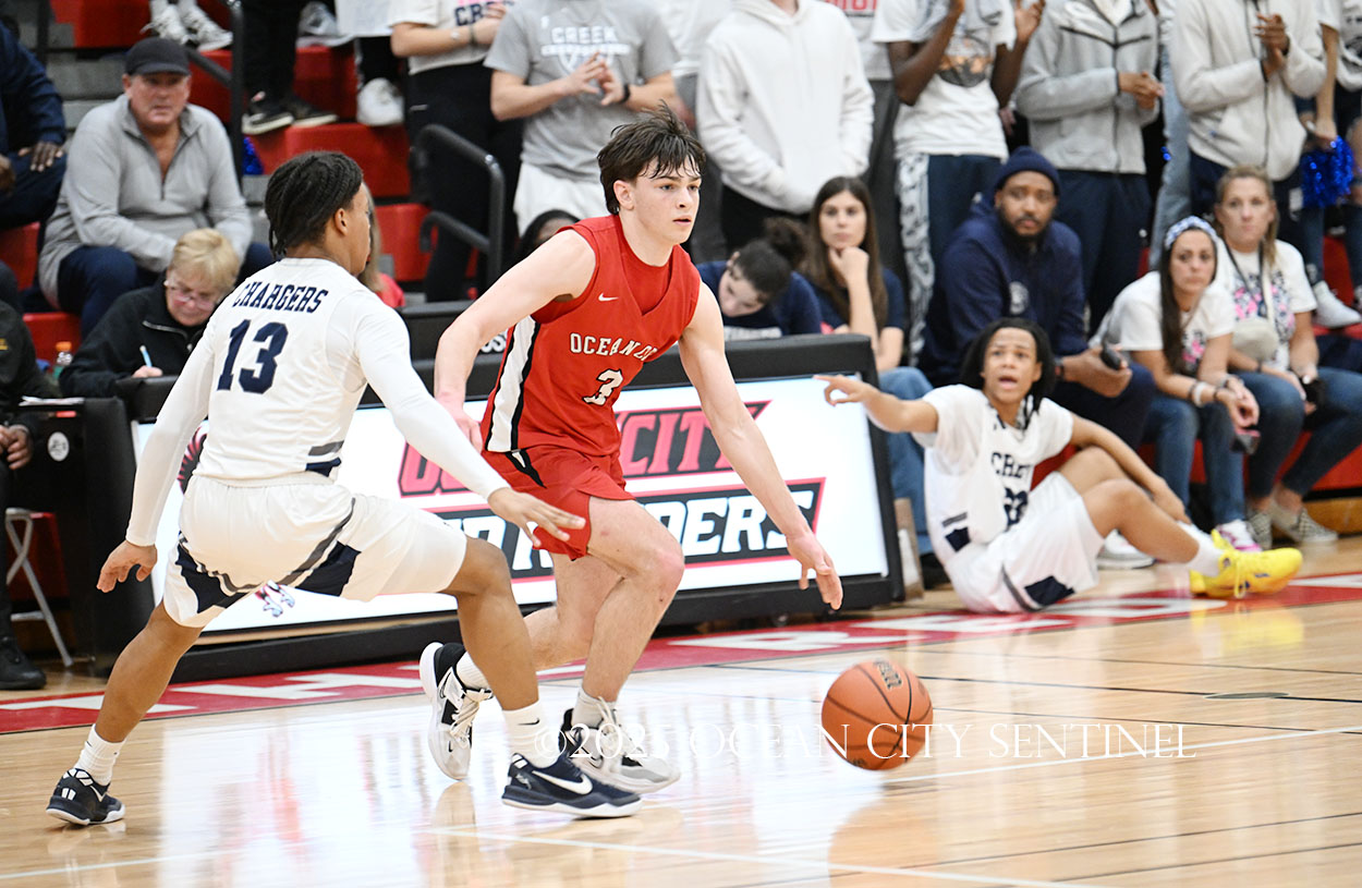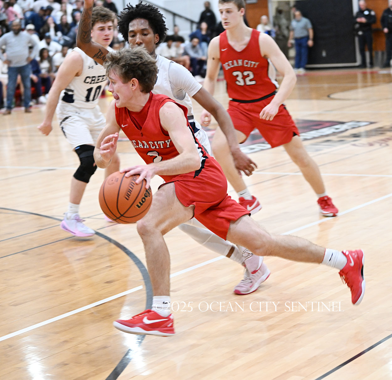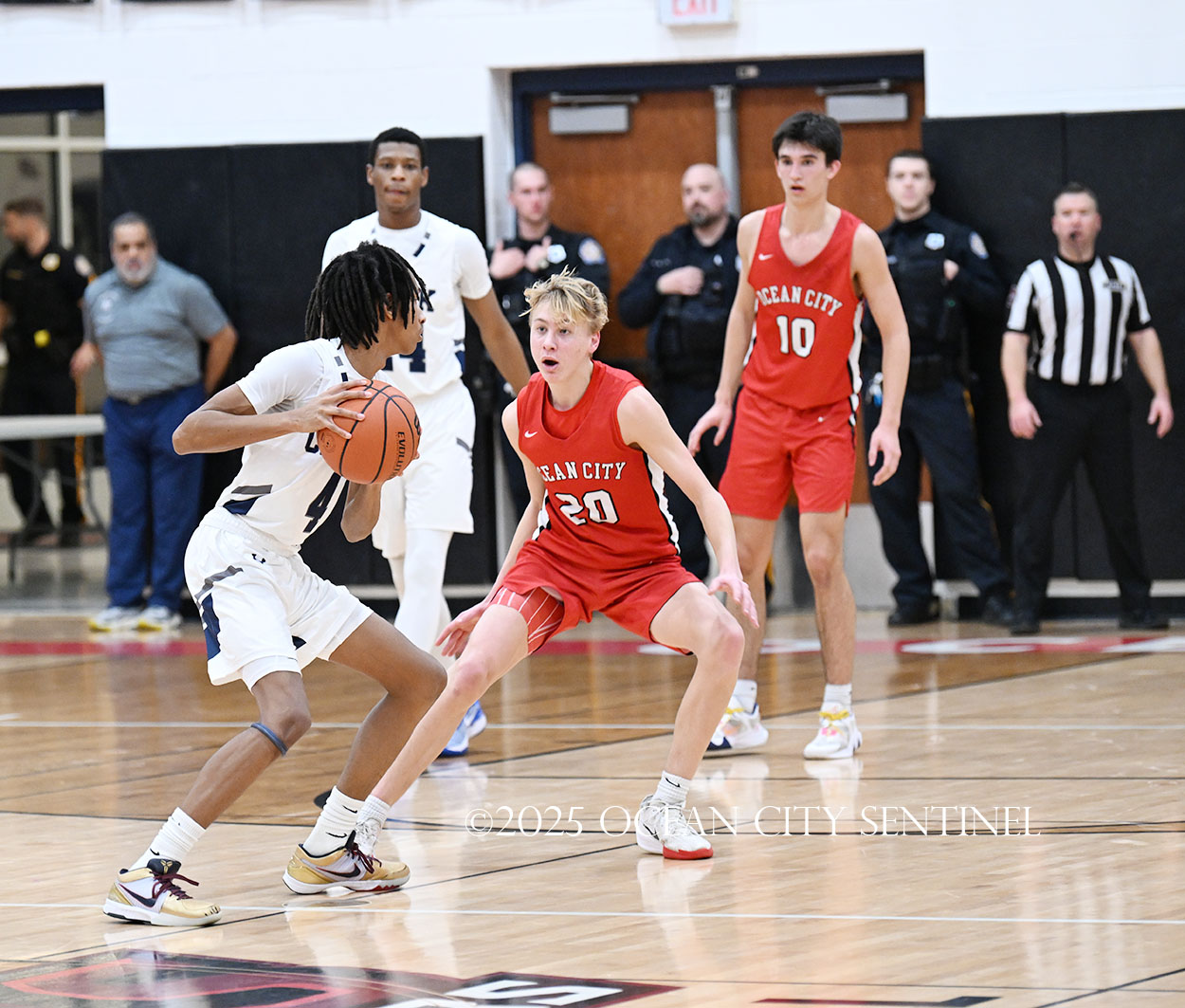 Four foul shots by Tjourmakaris and a three-pointer by Leon Brown helped put Ocean City up 33-24 early in the third quarter, but Timber Creek responded to narrow it to 35-32 with under two minutes to go. Lenko hit a trey with another score by the visitors for a four-point, 38-34 lead heading into the fourth quarter.