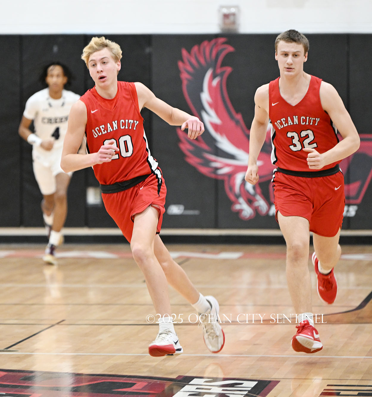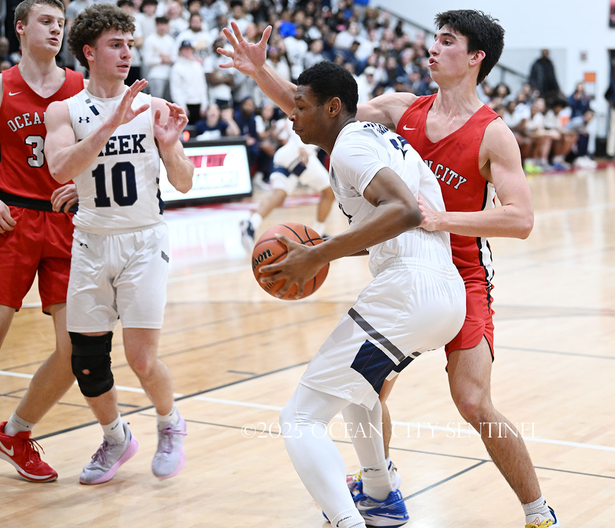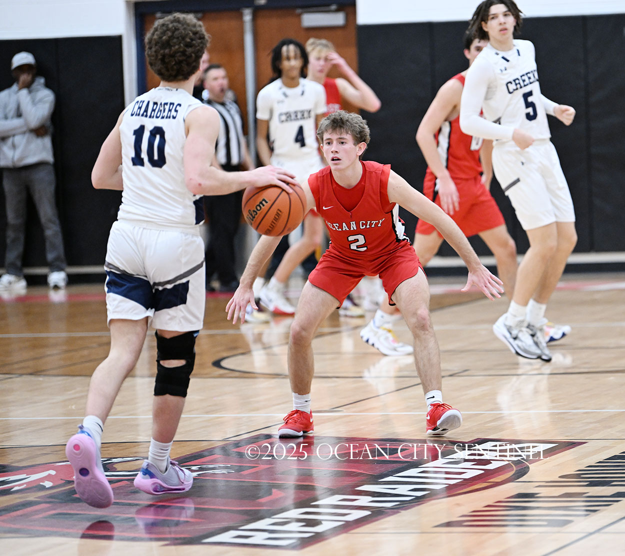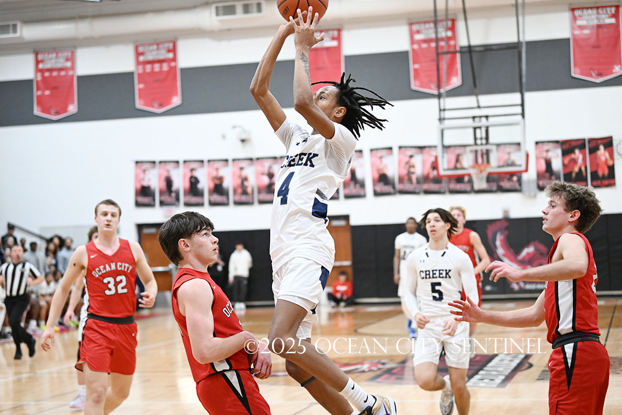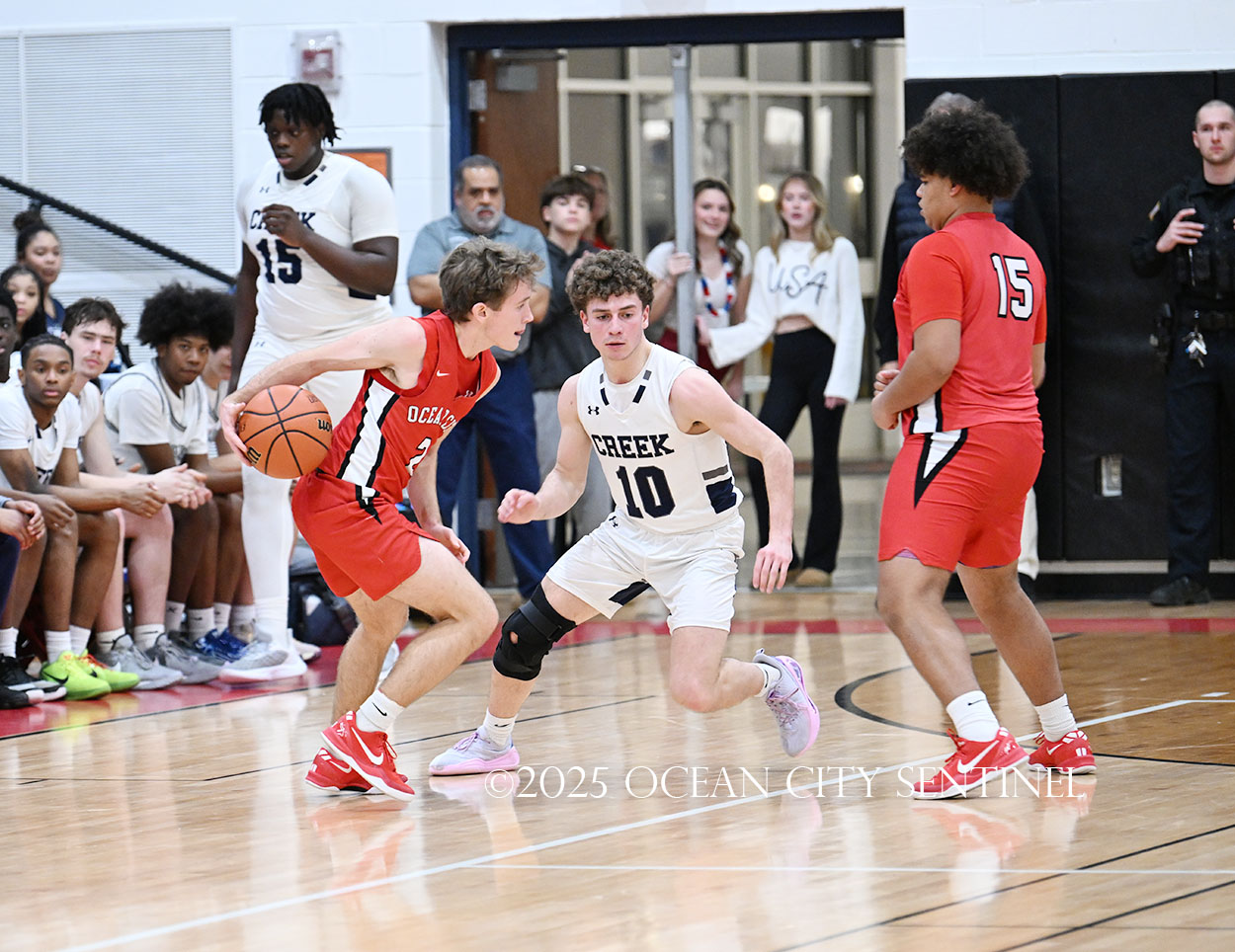 Four foul shots by Tjourmakaris and a three-pointer by Leon Brown helped put Ocean City up 33-24 early in the third quarter, but Timber Creek responded to narrow it to 35-32 with under two minutes to go. Lenko hit a trey with another score by the visitors for a four-point, 38-34 lead heading into the fourth quarter.