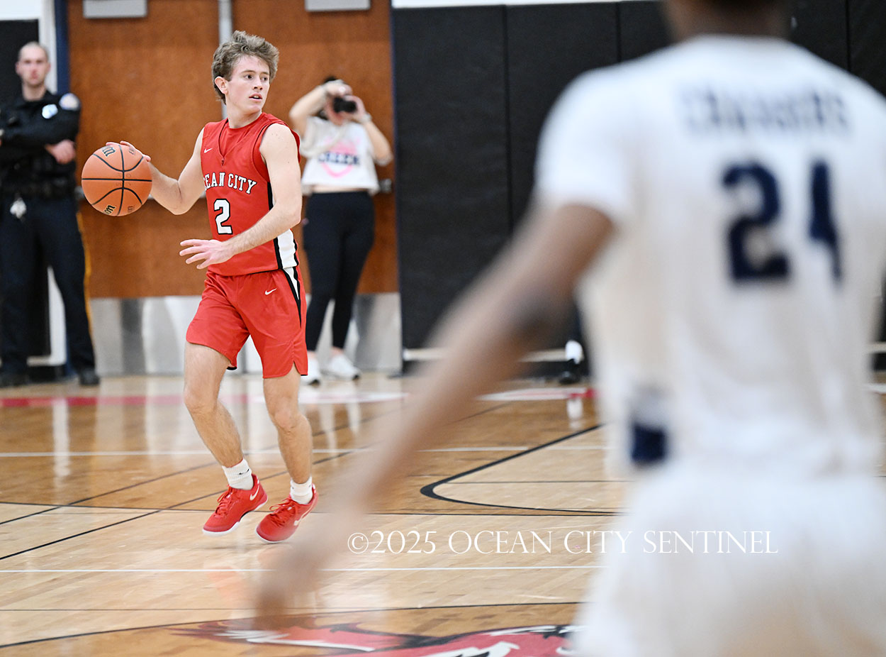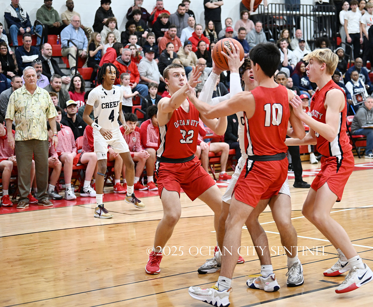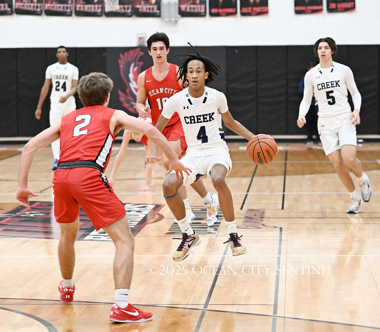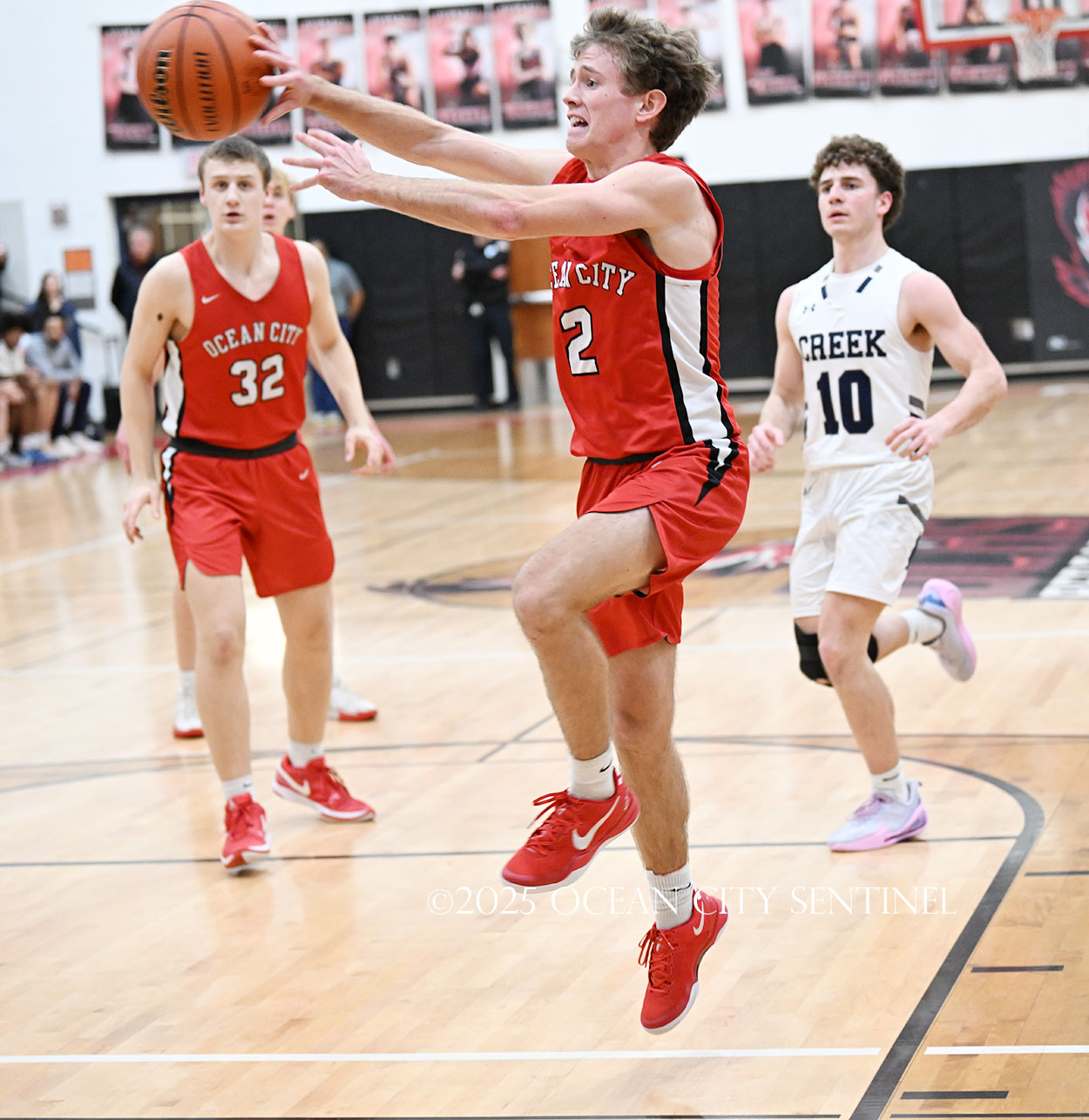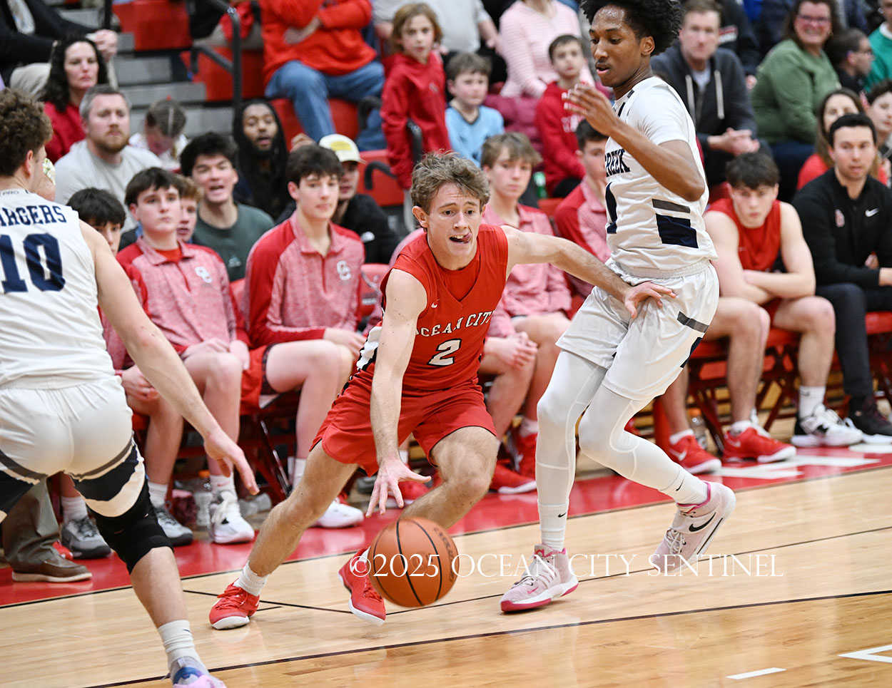 Four foul shots by Tjourmakaris and a three-pointer by Leon Brown helped put Ocean City up 33-24 early in the third quarter, but Timber Creek responded to narrow it to 35-32 with under two minutes to go. Lenko hit a trey with another score by the visitors for a four-point, 38-34 lead heading into the fourth quarter.