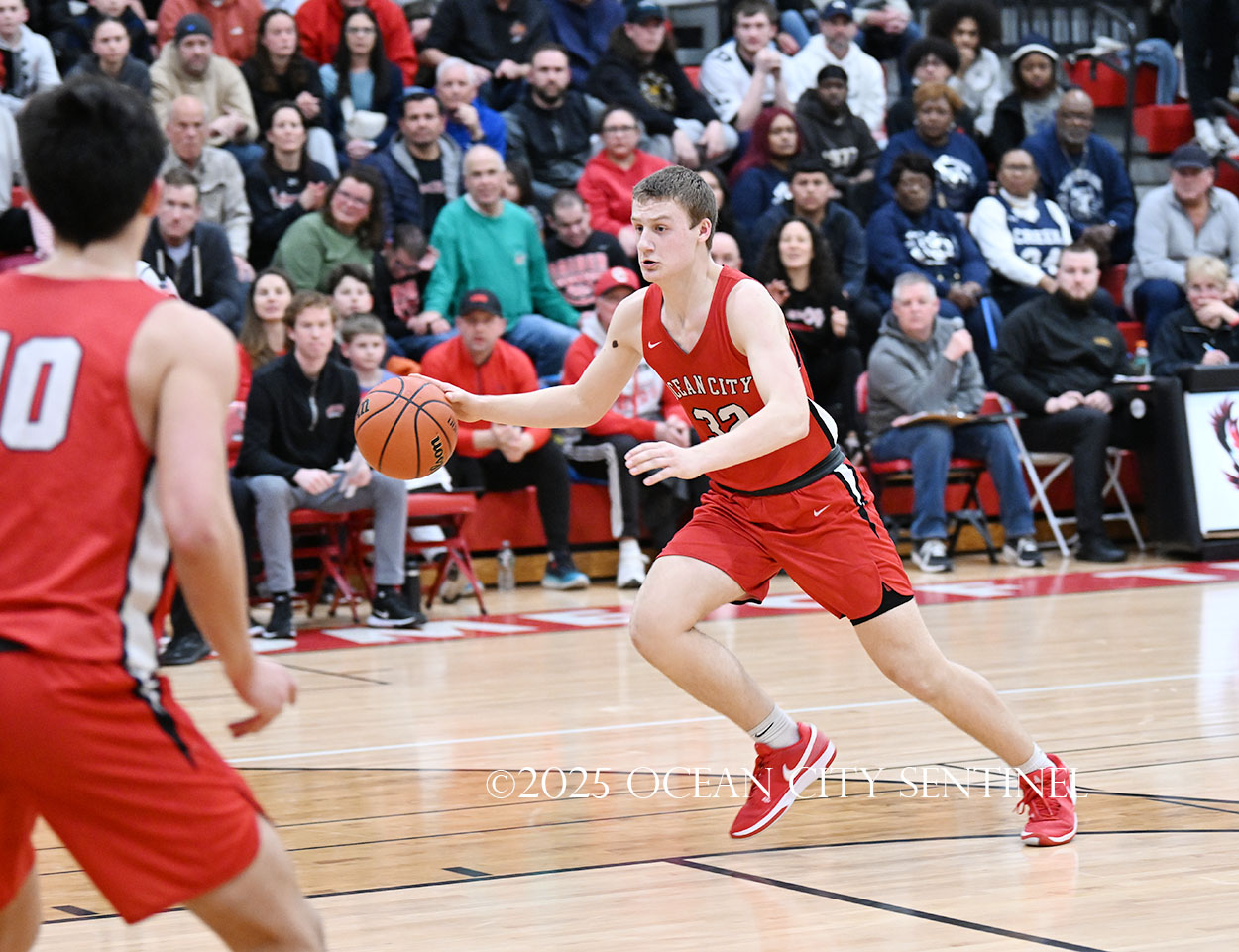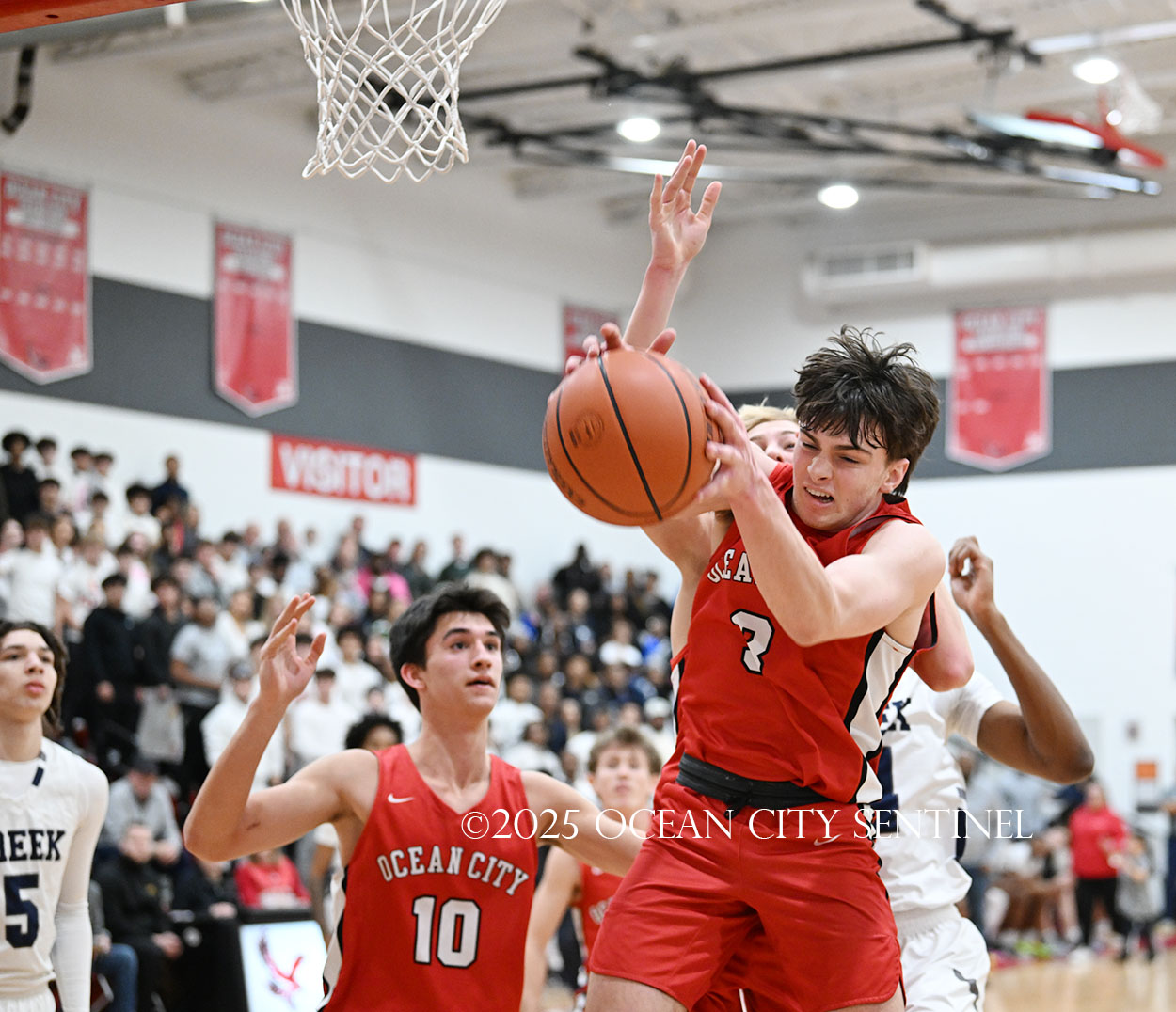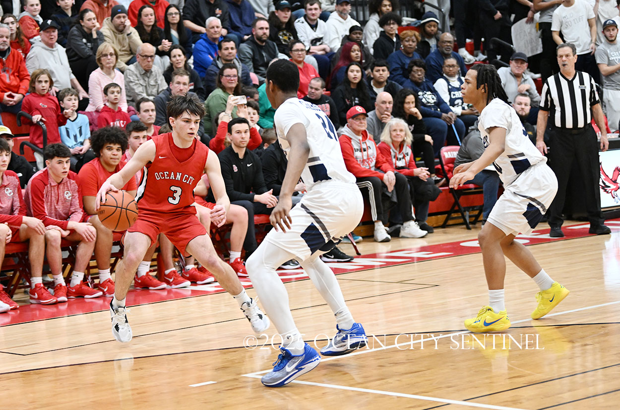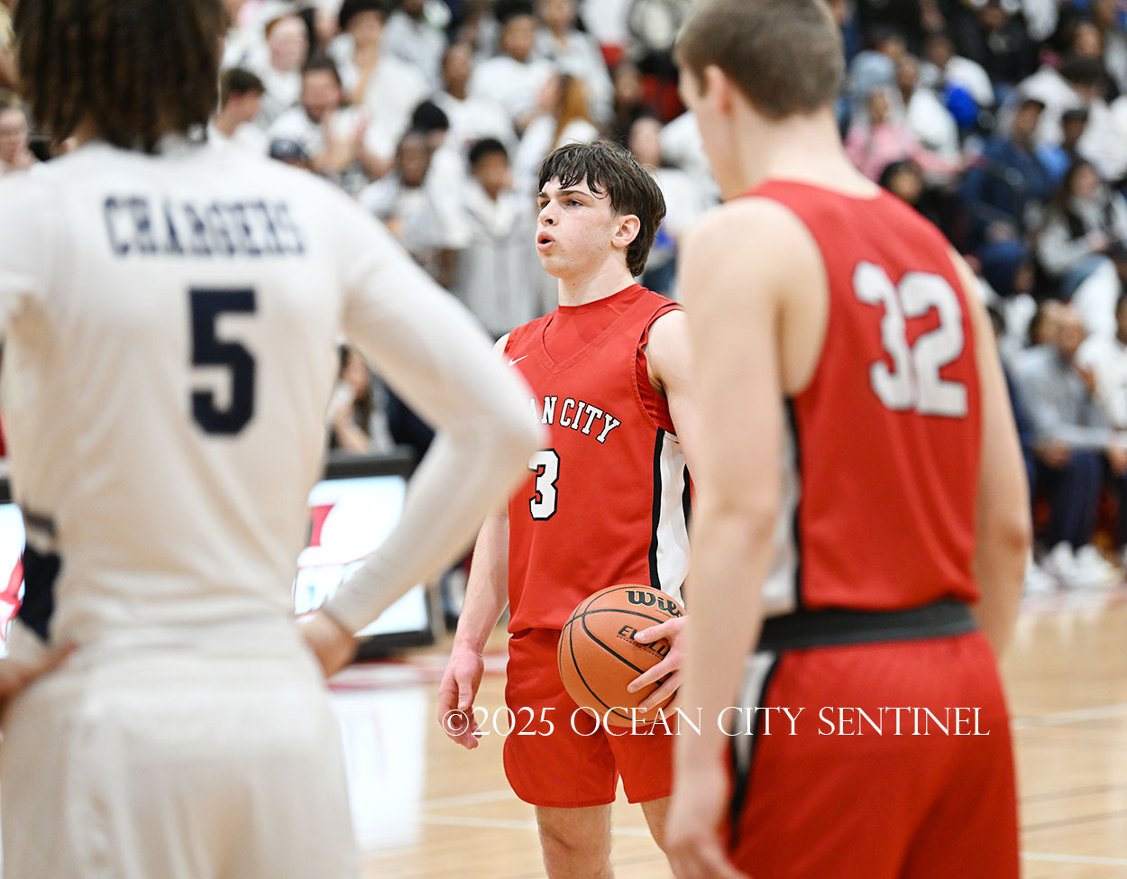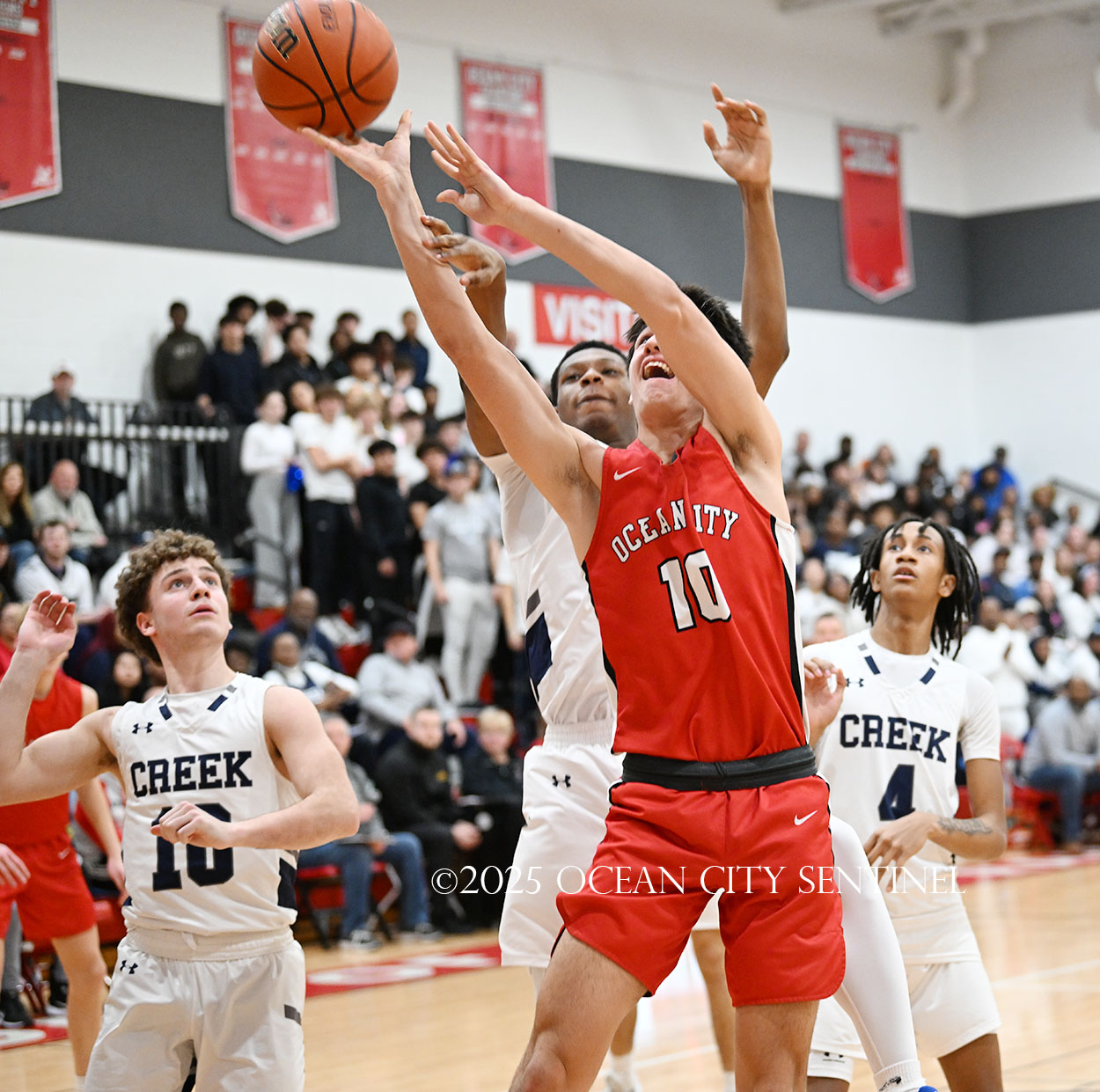 Four foul shots by Tjourmakaris and a three-pointer by Leon Brown helped put Ocean City up 33-24 early in the third quarter, but Timber Creek responded to narrow it to 35-32 with under two minutes to go. Lenko hit a trey with another score by the visitors for a four-point, 38-34 lead heading into the fourth quarter.