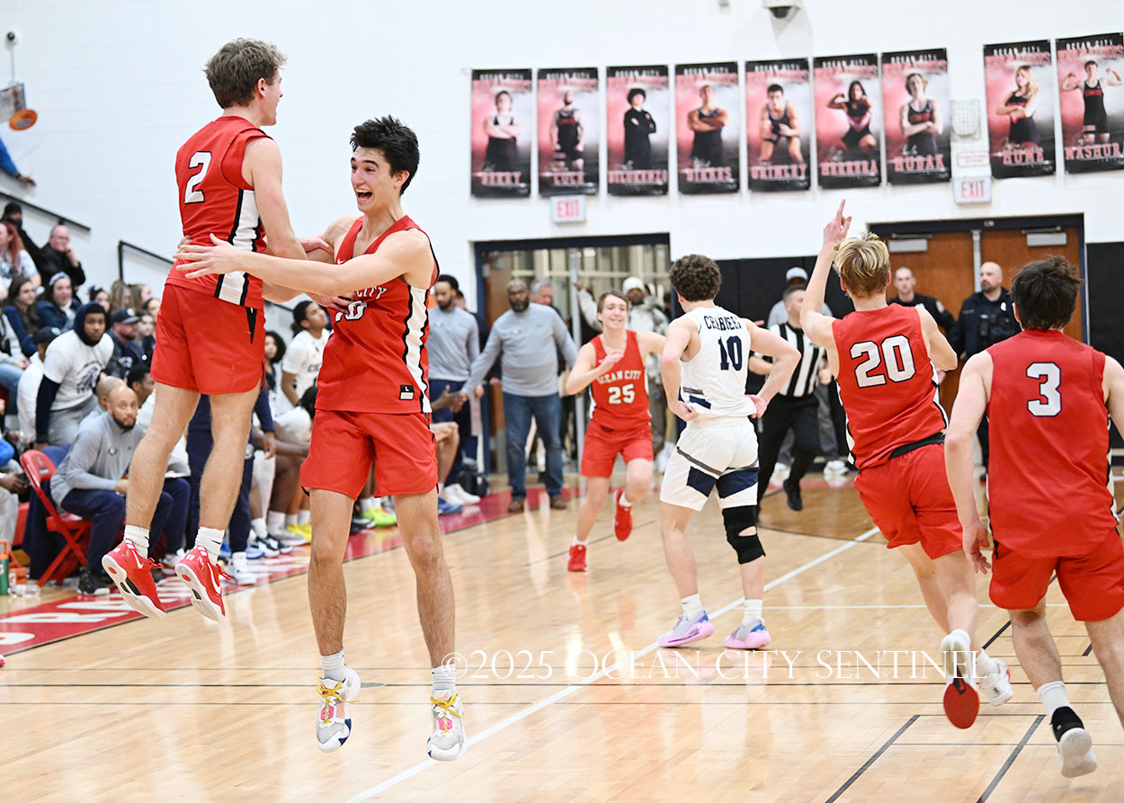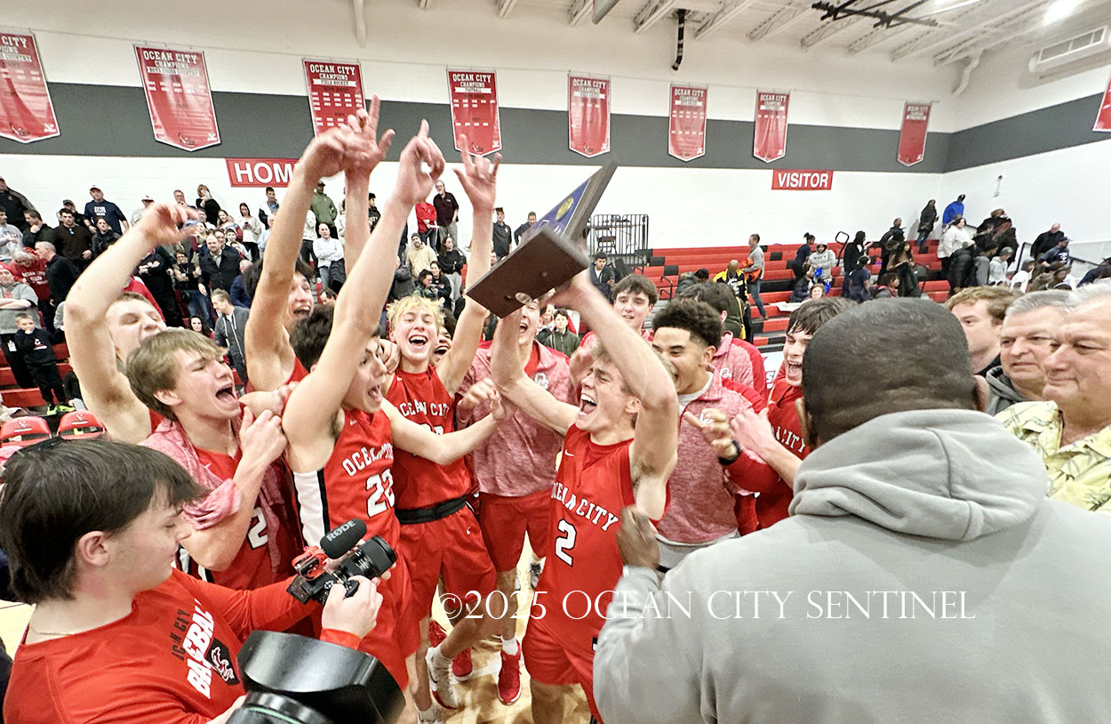 OCEAN CITY — Luke Tjoumakaris and Tighe Olek dominated the boards. Josh Lenko and Tjoumakaris combined for 44 points. Dean Lappin had three steals and four assists. Floor general Ben McGonigle put it all together as the Red Raiders won their first South Jersey boys basketball championship since the late 1990s, beating Timber Creek 66-53 at home Friday night.
