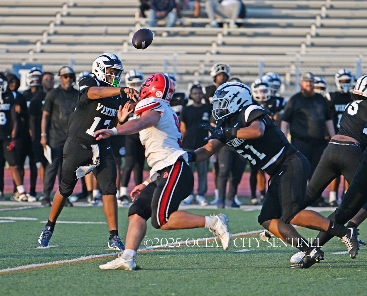 A penalty on the ensuing kickoff put Ocean City in good field position at Atlantic City’s 45. Becker completed a 17-yard pass and the Raiders had a first down at the 31, but a short run and three incomplete passes gave the ball back to the Vikings.