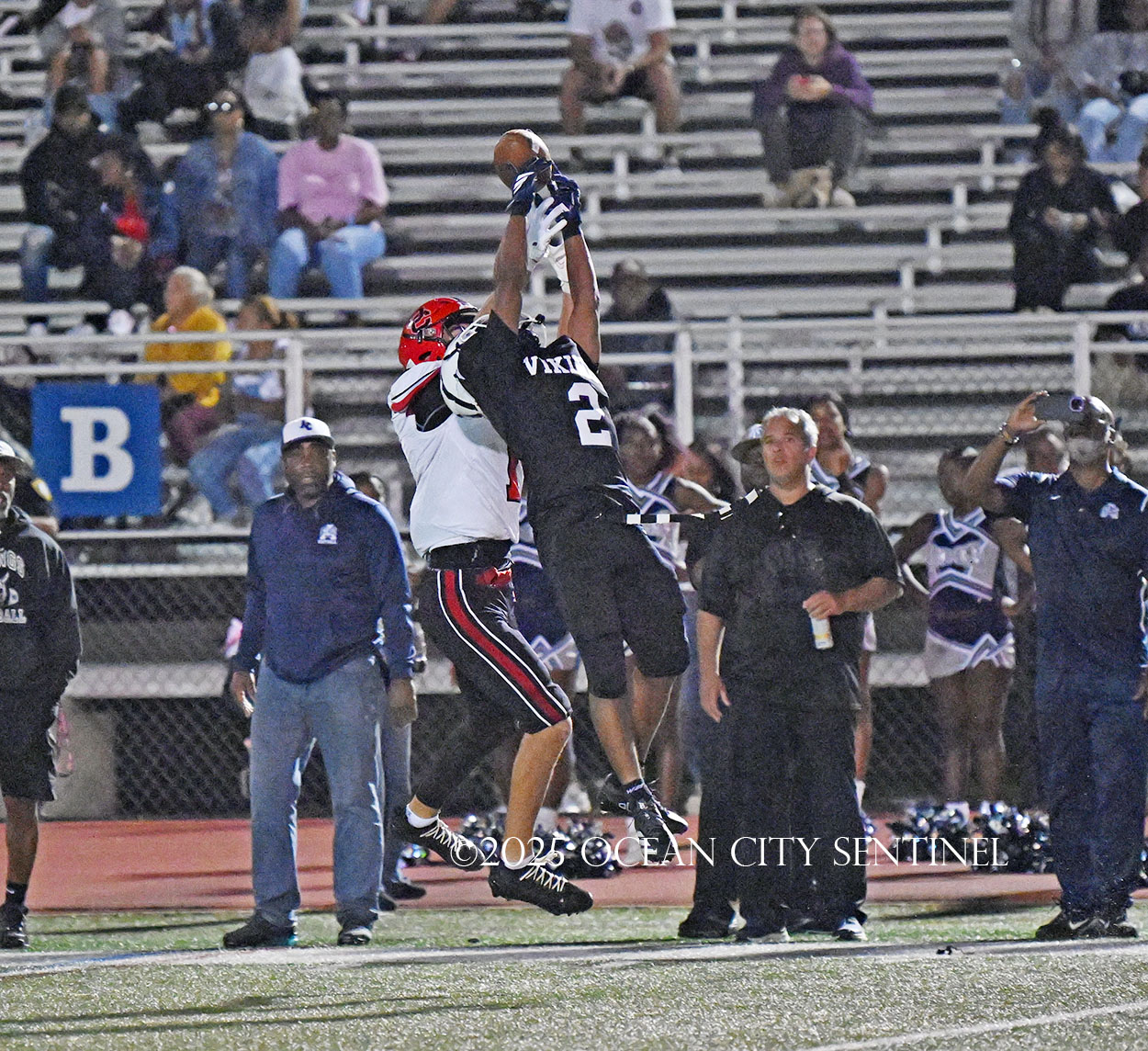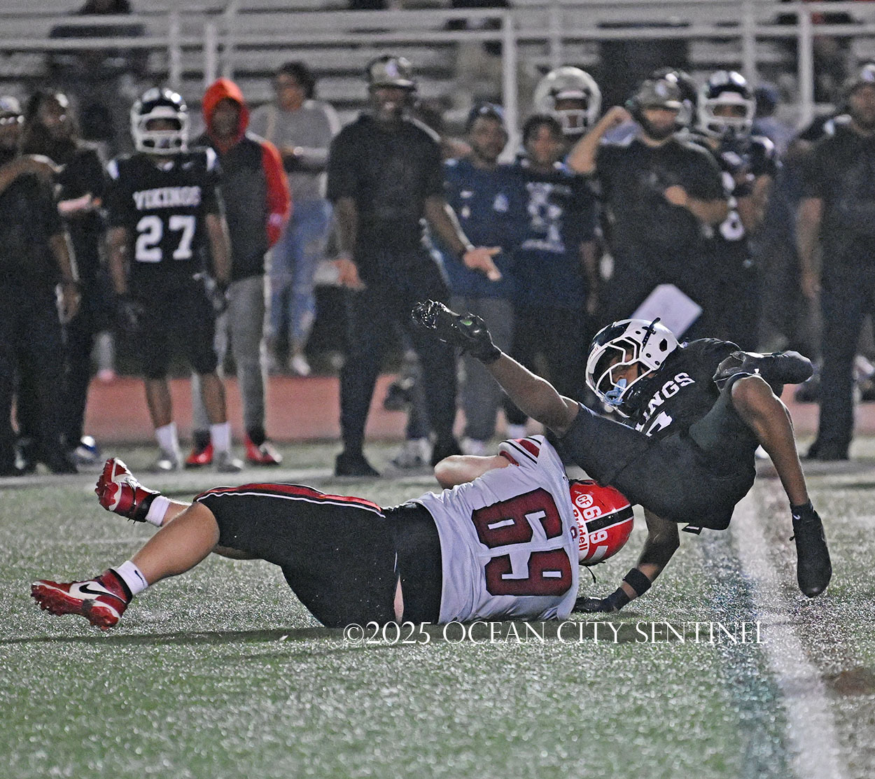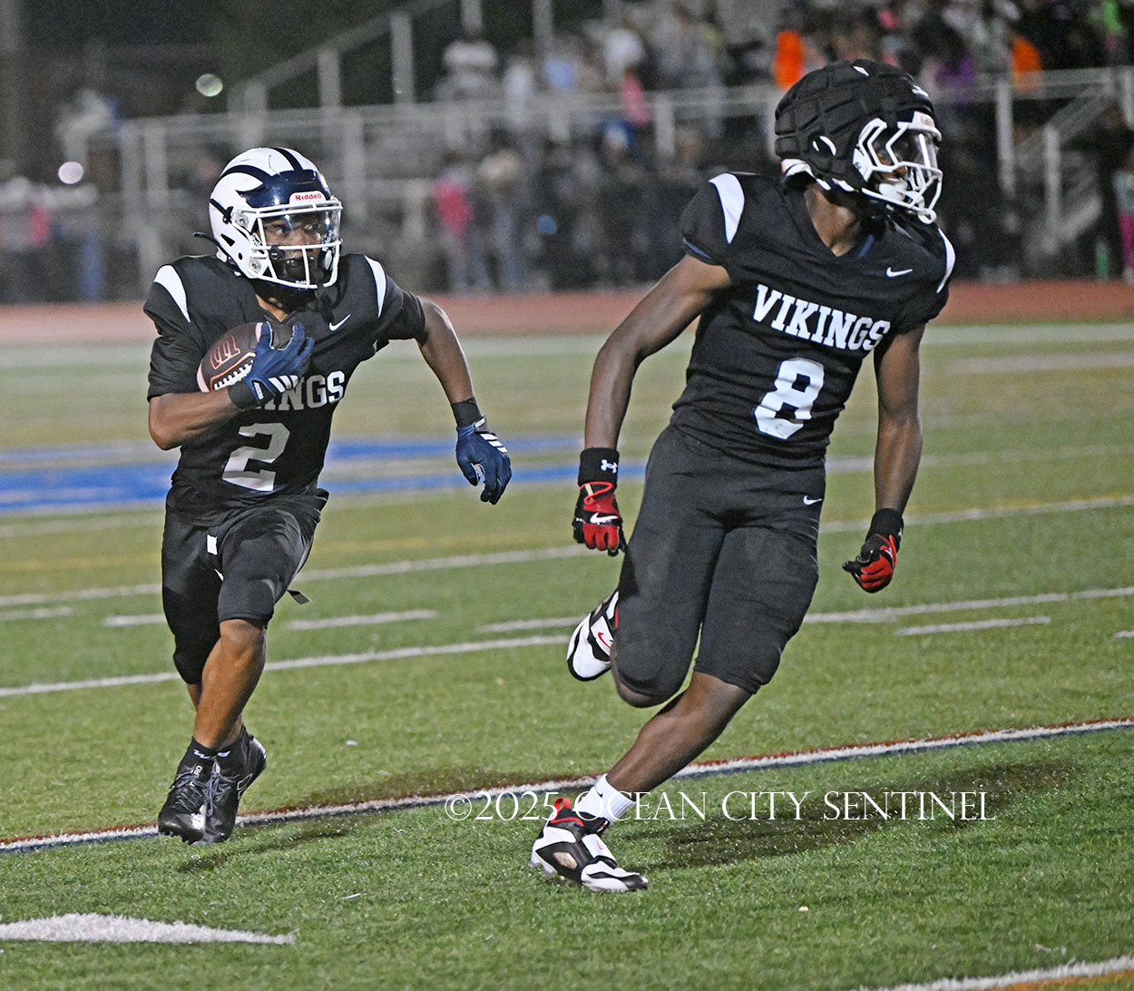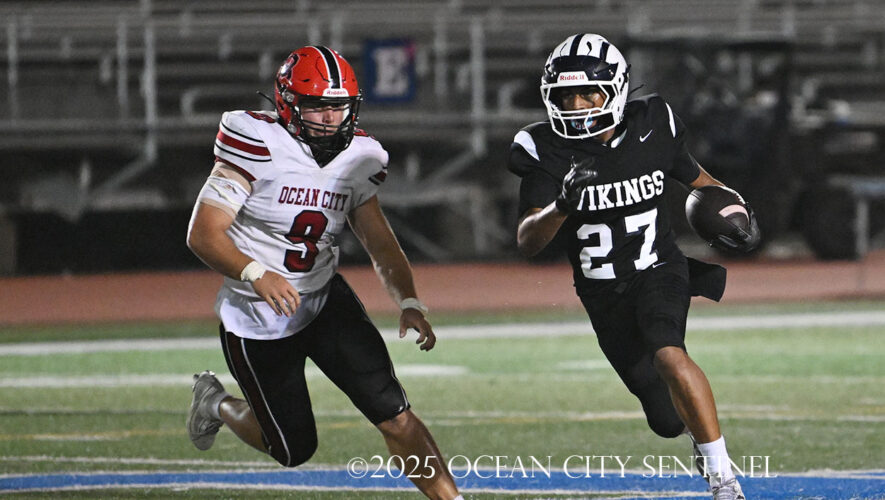 The Vikings were flagged for pass interference and the Raiders finally moved out of the shadow of their uprights with a first down at the 19. A pass to Compton picked up 38 yards and set Ocean City up with a first down at Atlantic City’s 43, but senior Triston Schmidt was stuffed on two runs and a catch, forcing the Raiders to punt again.