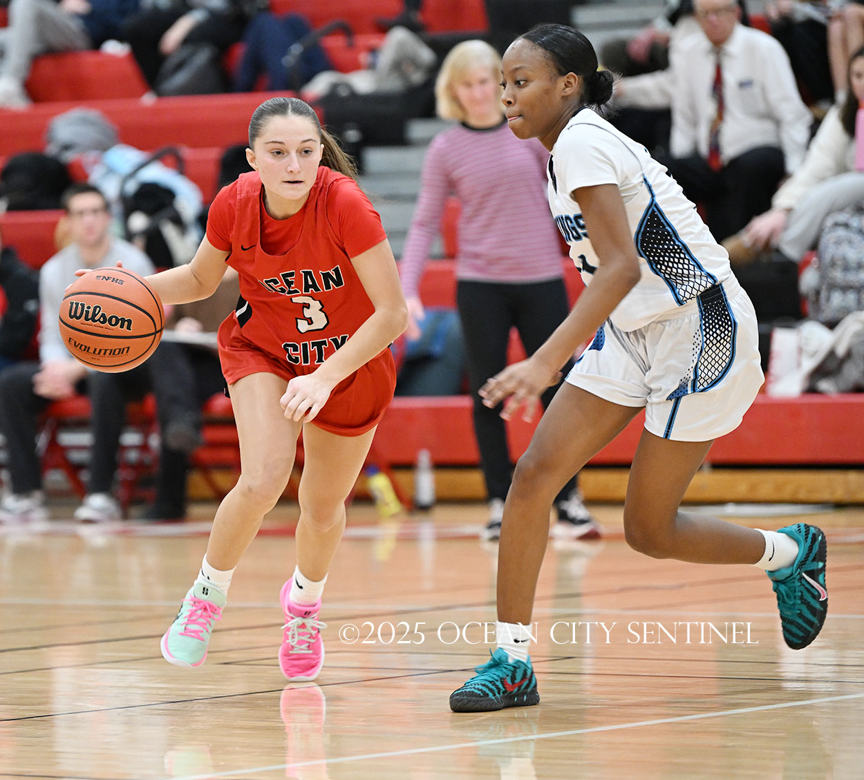 Ocean City senior Marley Ostrander led all scorers with 17 points, including 13 in the first half. The lead changed hands eight different times until Haddonfield settled into a 25-22 advantage at halftime.