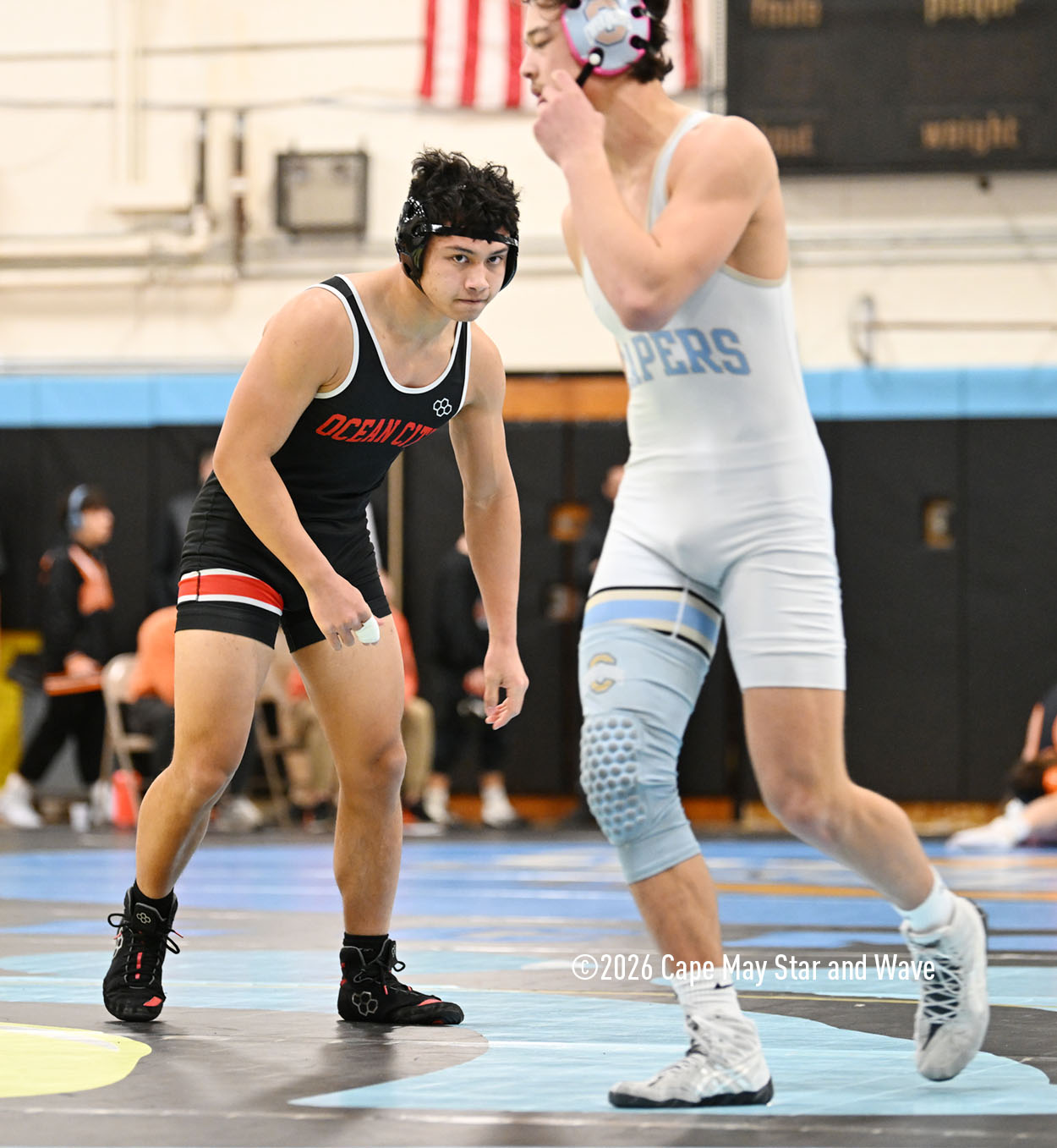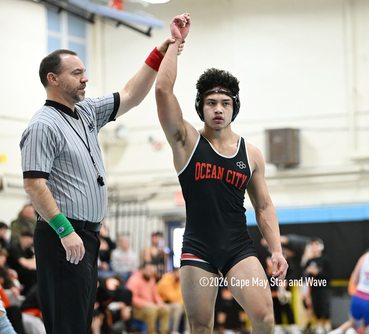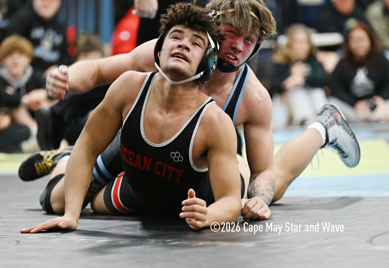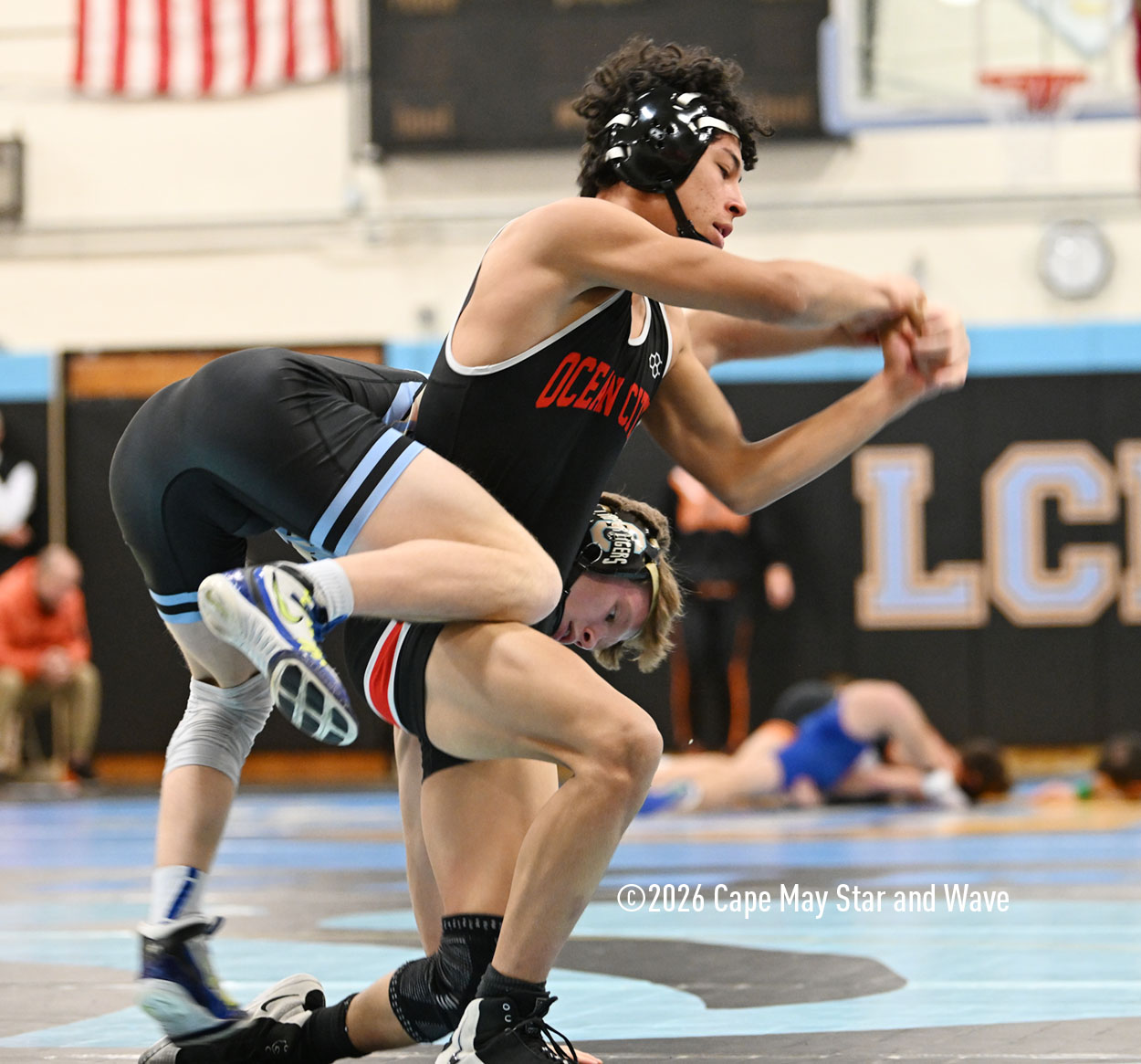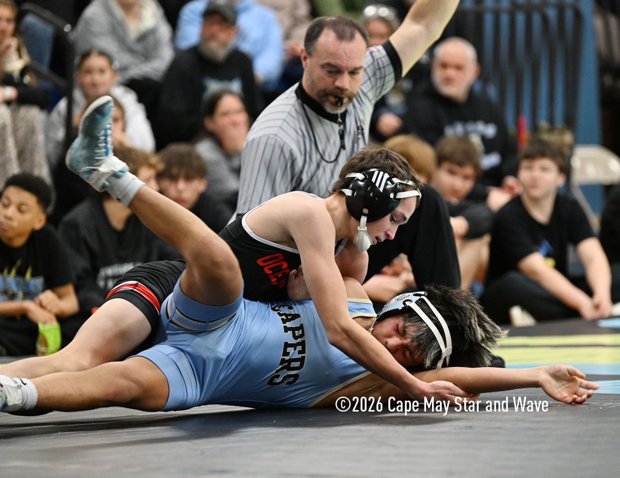 Ocean City’s Zarian Cabalo won a 6-0 decision over Ashton Ray at 165 pounds, but LCMR’s Shane Morrell (175) put 6 more points on the board with a pin of Ethan Miura at the 2:13 mark, pushing the Caper Tiger lead to 30-6.