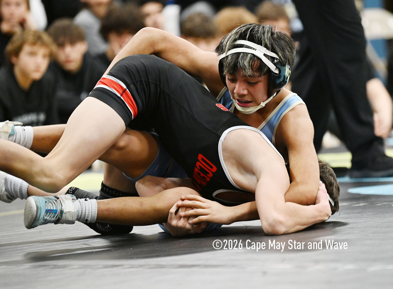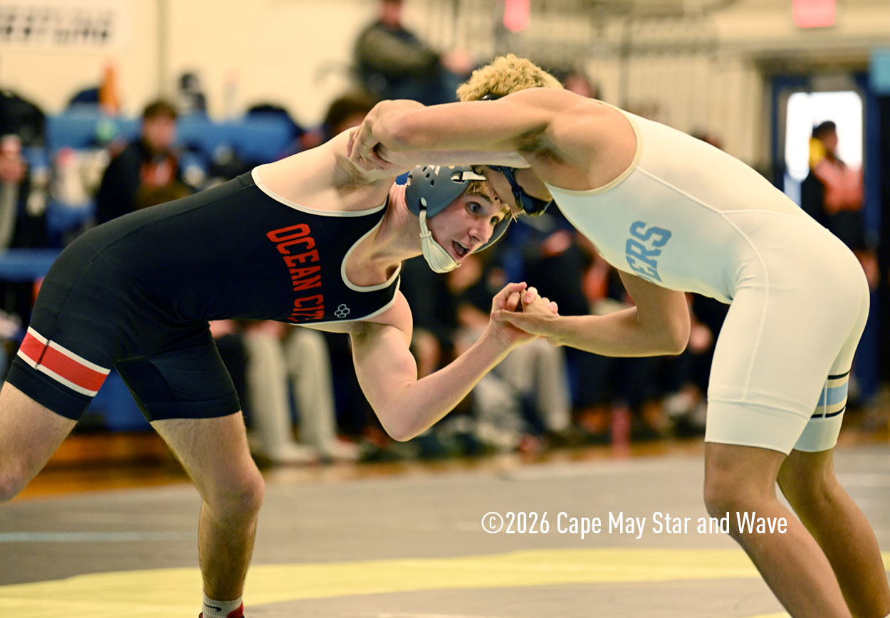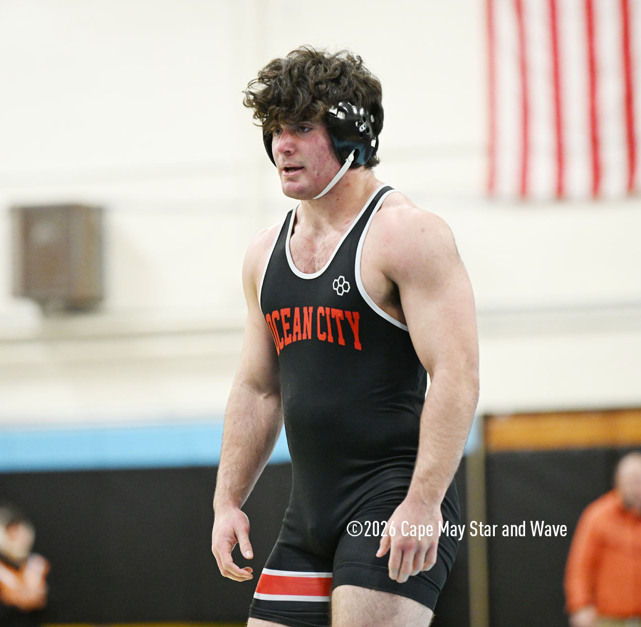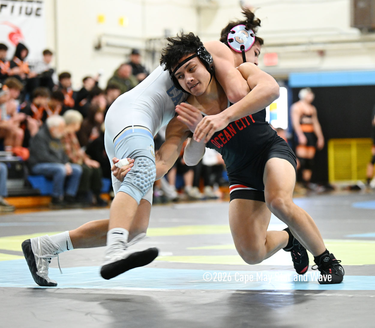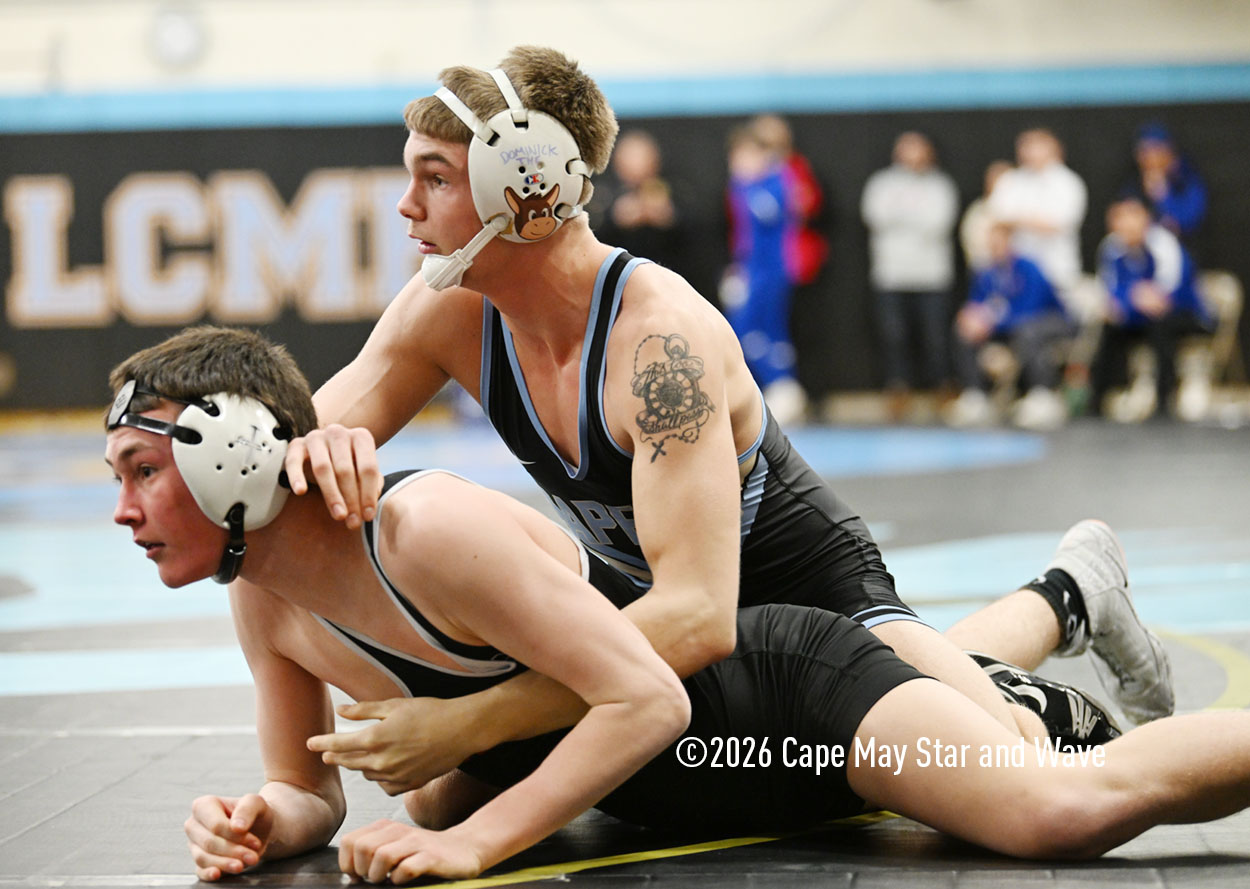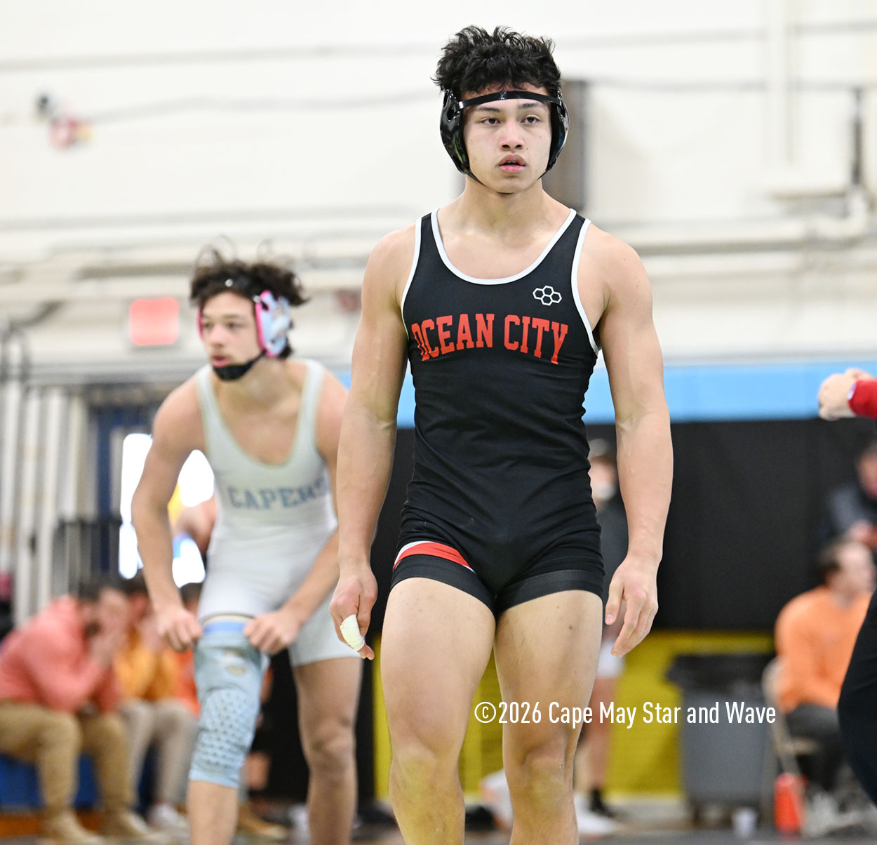 Ocean City’s Zarian Cabalo won a 6-0 decision over Ashton Ray at 165 pounds, but LCMR’s Shane Morrell (175) put 6 more points on the board with a pin of Ethan Miura at the 2:13 mark, pushing the Caper Tiger lead to 30-6.