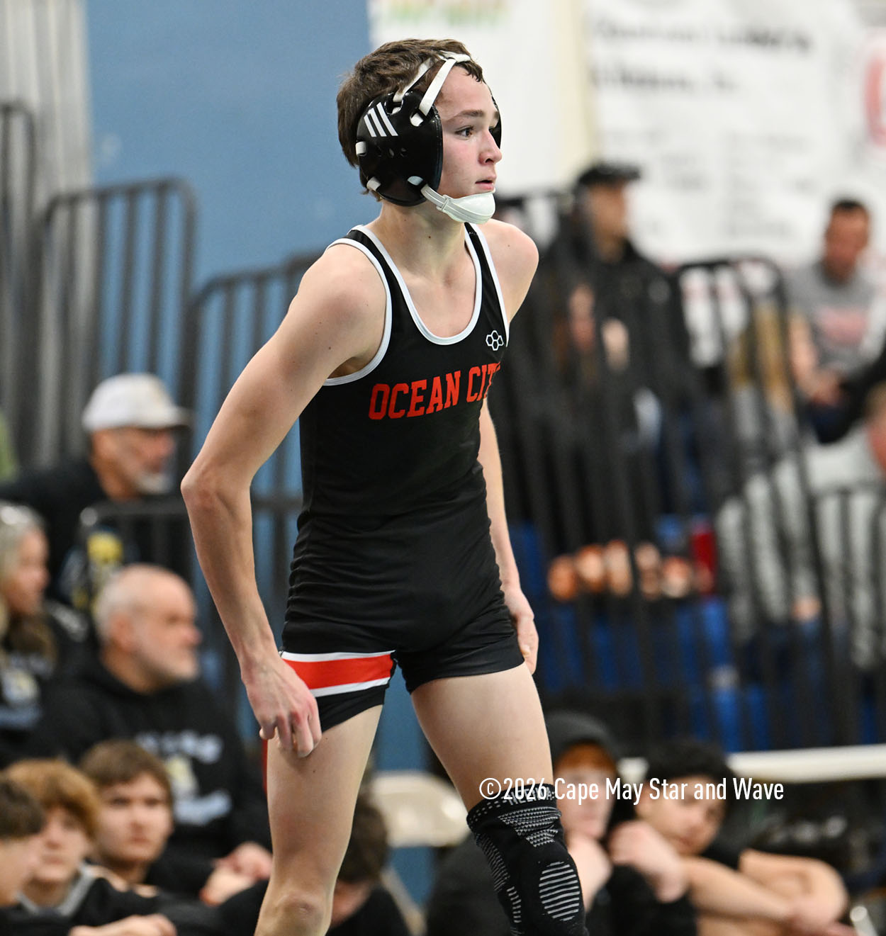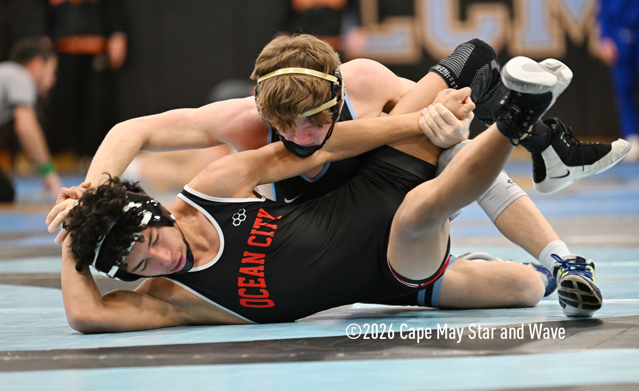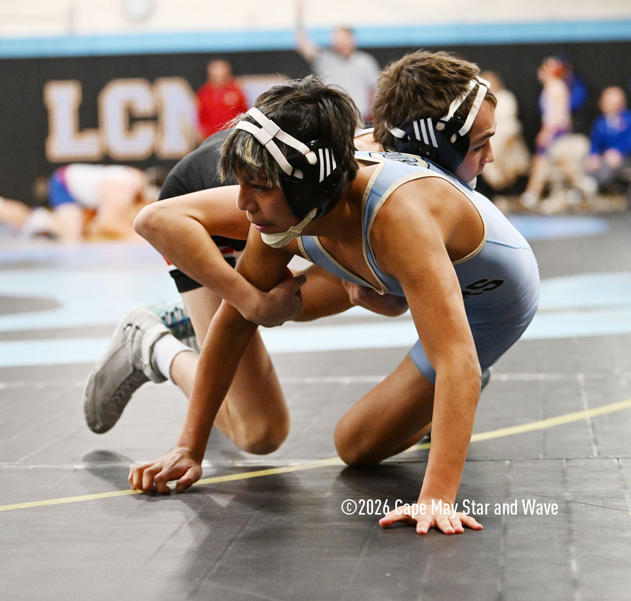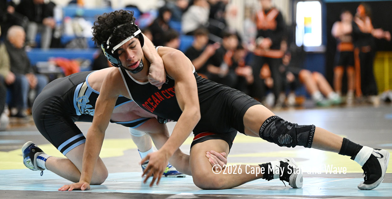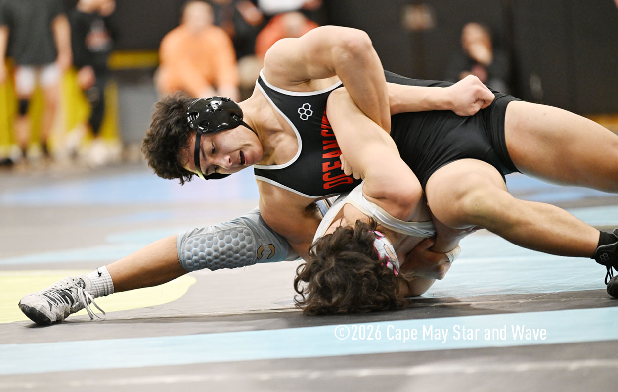 Ocean City’s Zarian Cabalo won a 6-0 decision over Ashton Ray at 165 pounds, but LCMR’s Shane Morrell (175) put 6 more points on the board with a pin of Ethan Miura at the 2:13 mark, pushing the Caper Tiger lead to 30-6.