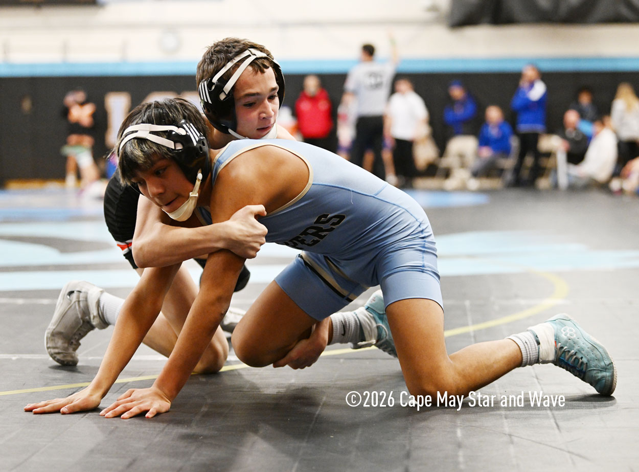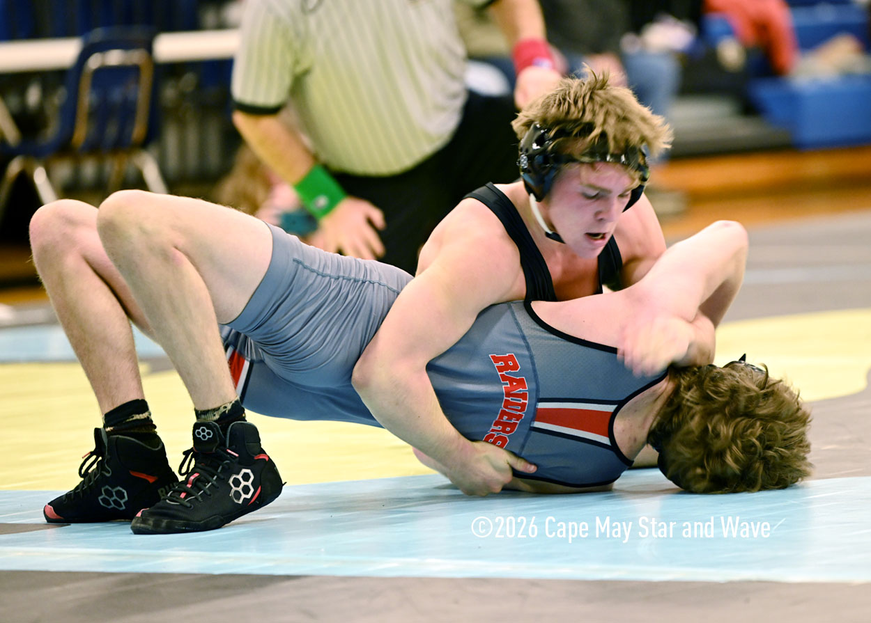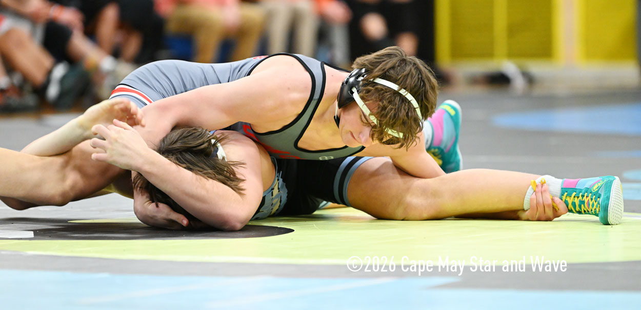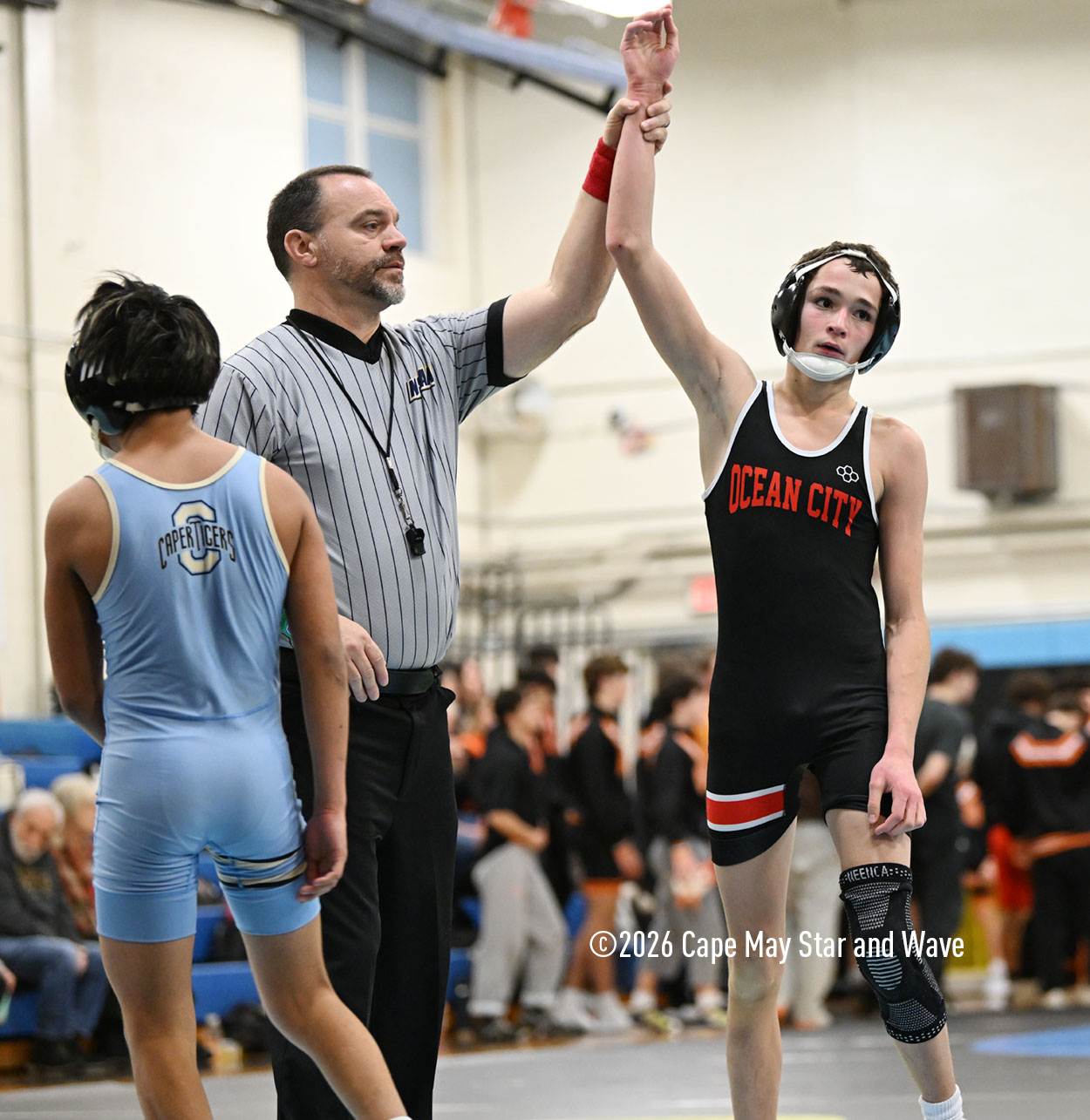 Red Raider Sawyer Gayeski, at 106 pounds, pinned his Caper Tiger opponent, Abraham Caballero, in 2:56 for Ocean City’s final points of the morning.