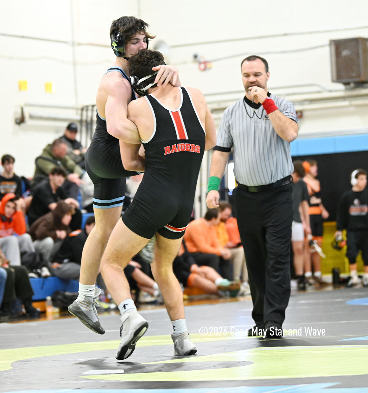 Daniel Byrne (157) earned another technical fall for the Caper Tigers, winning 18-3 over Raider Logan Fearnhead.