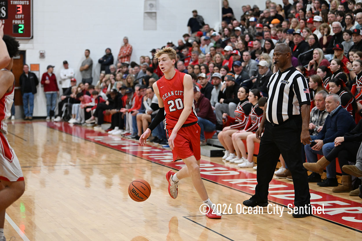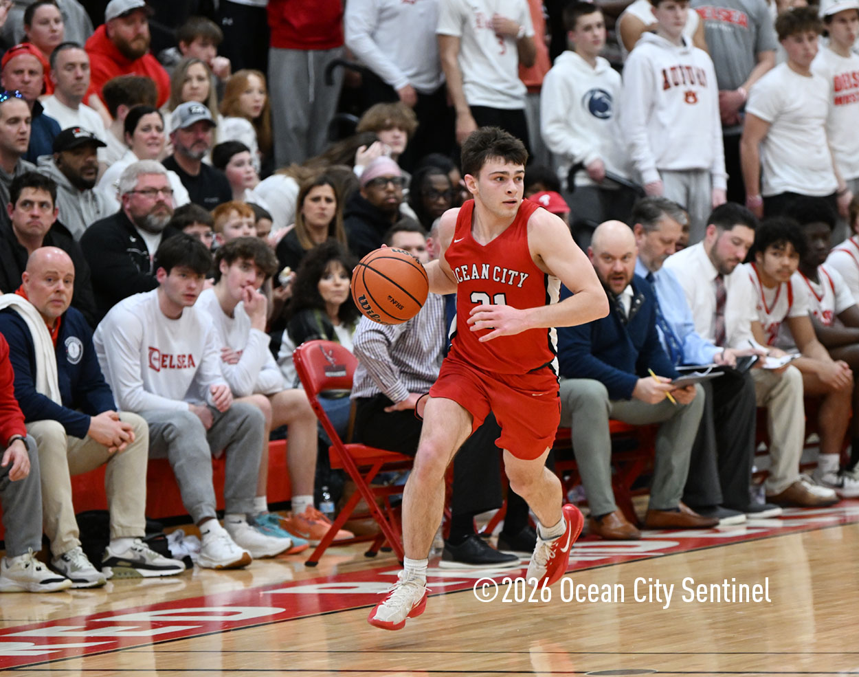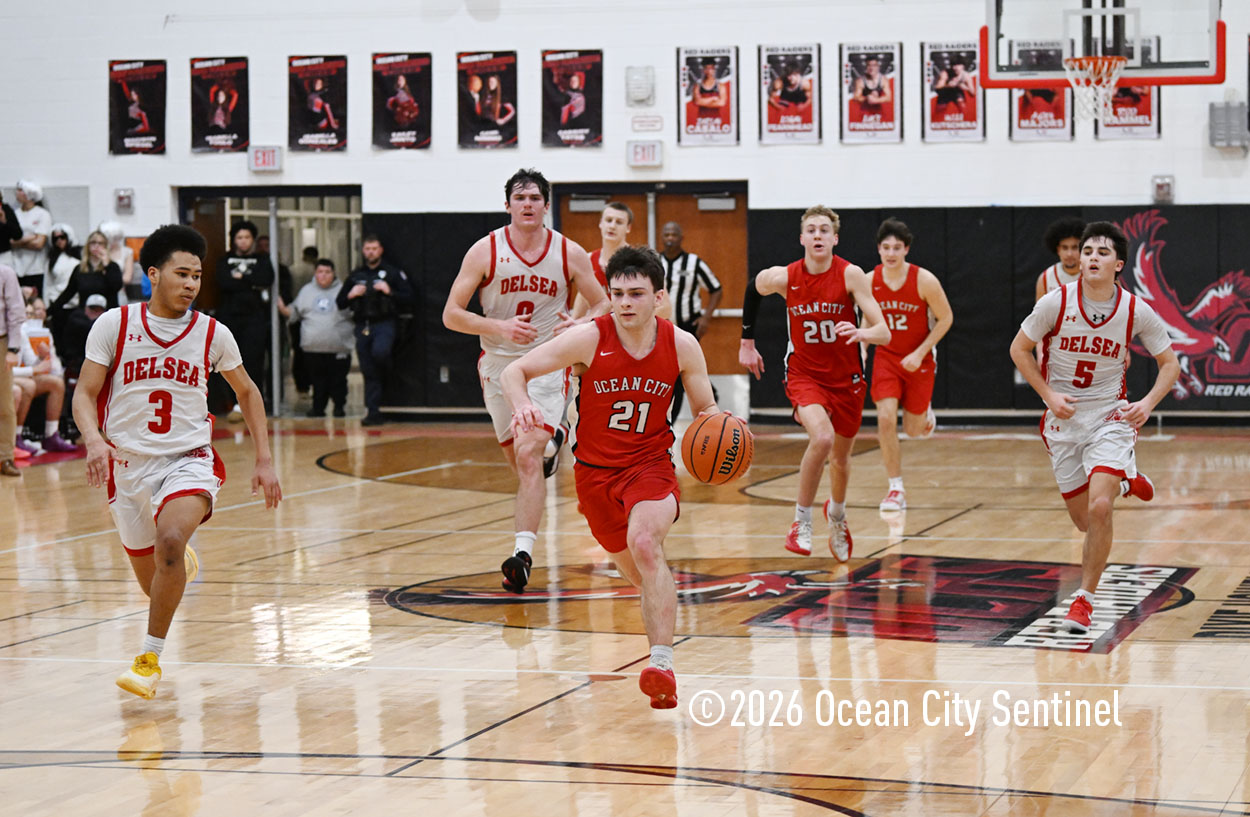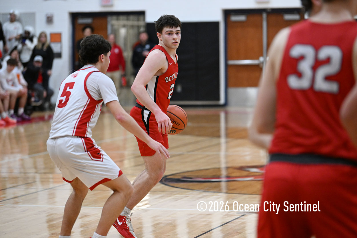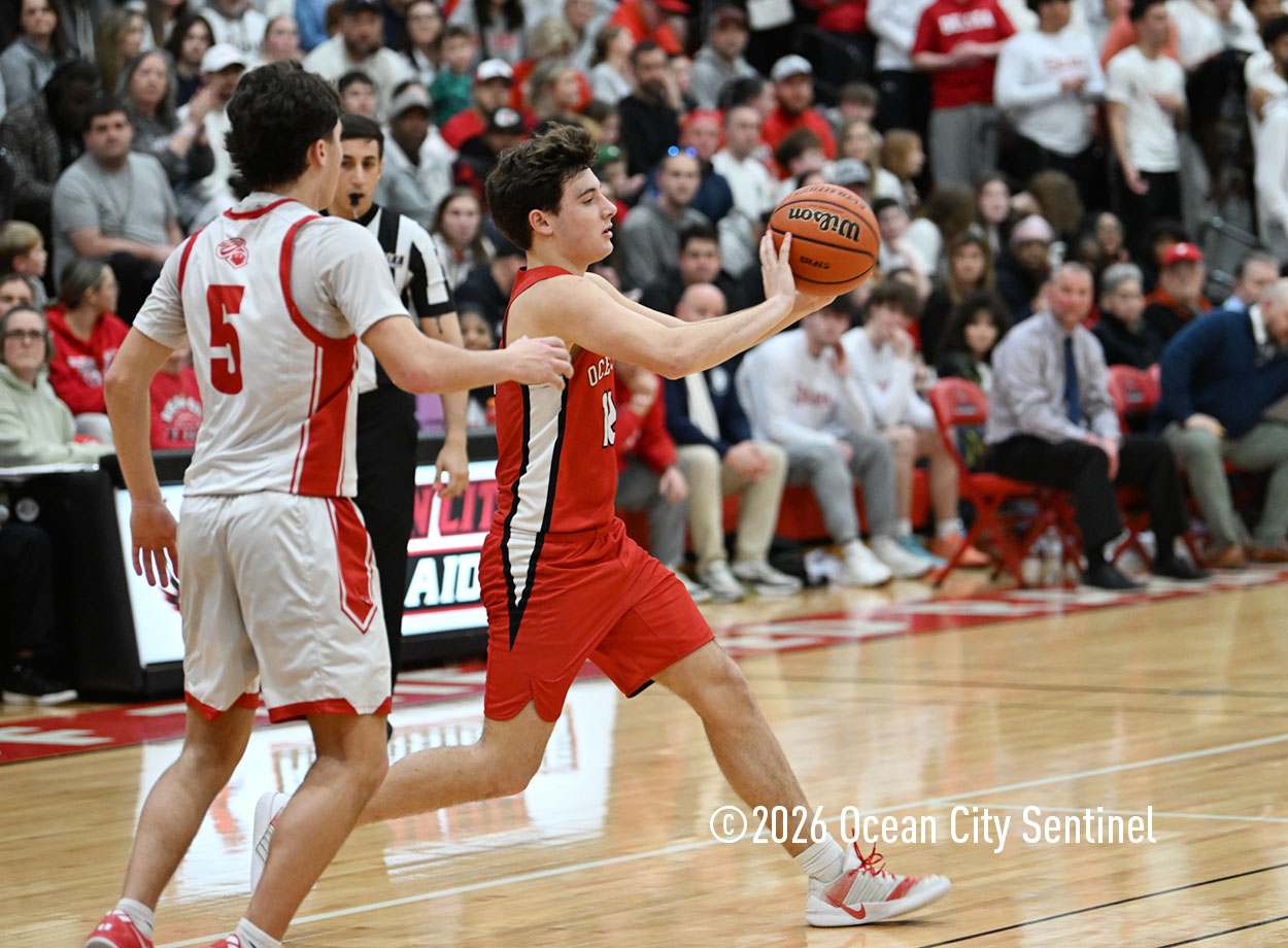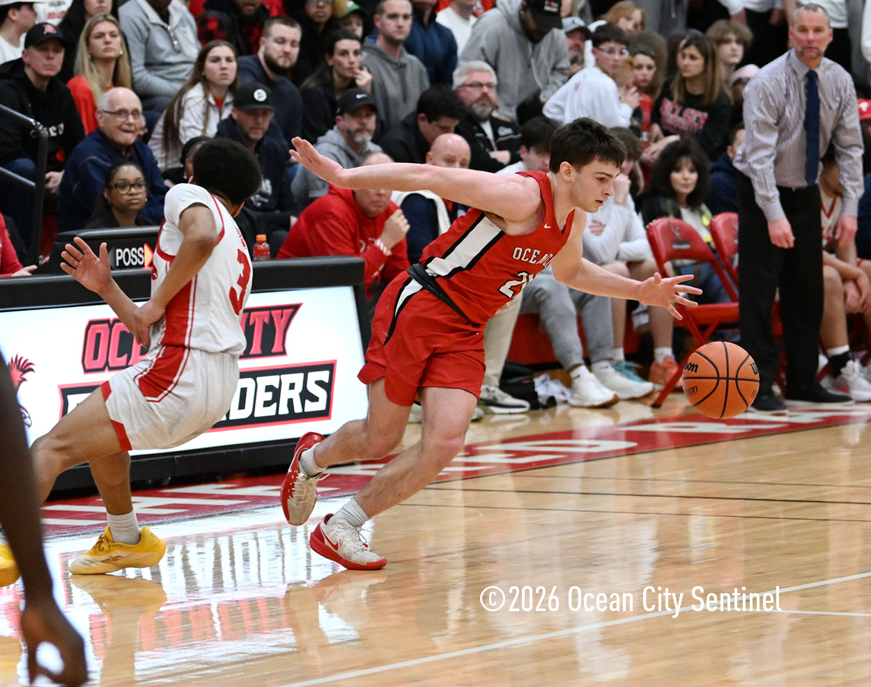 The Raiders seized control of the game in the second quarter and played nearly perfectly on both sides of the court. Ocean City trailed 17-11 with 6:20 remaining in the half but turned the tide after Luke Tjoumakaris stood tall and took a charge on defense.