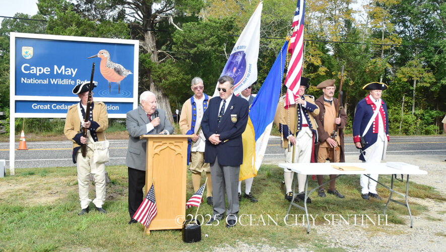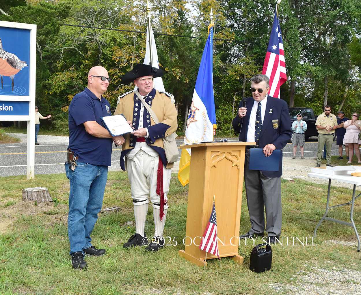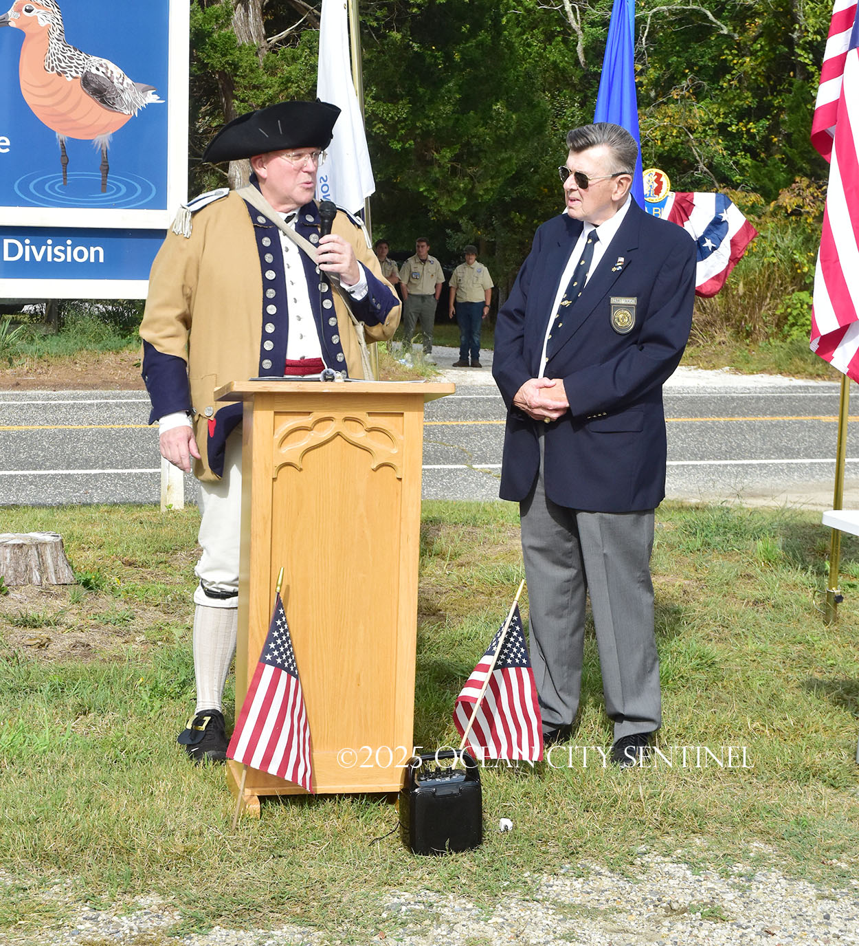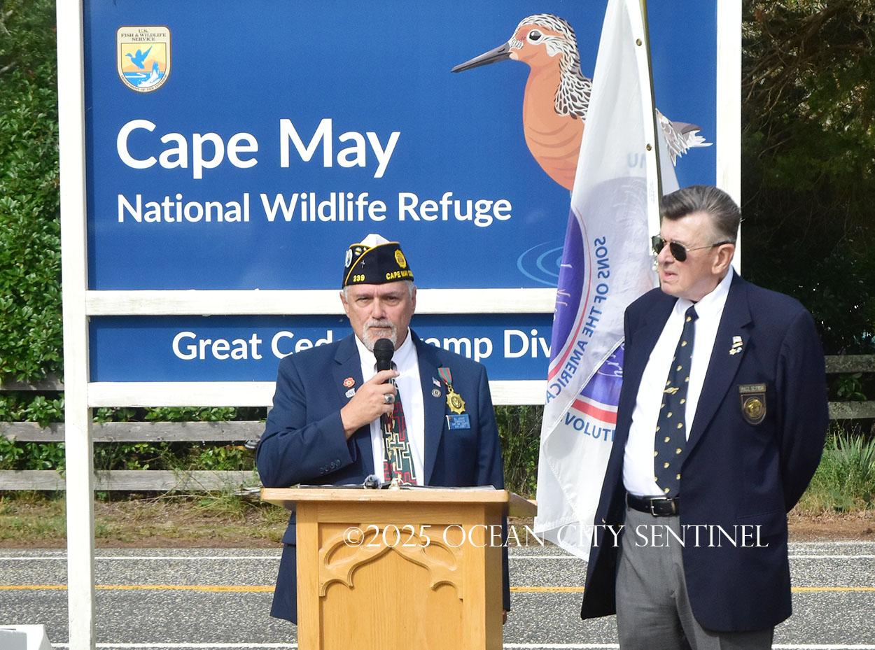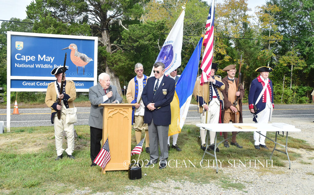 According to the terms of the grant from the William Pomeroy Foundation, the American Legion and the Col. Richard Somers Chapter of the Sons of the American Revolution were obliged to hold a public dedication of the sign’s positioning at the entrance to the refuge.