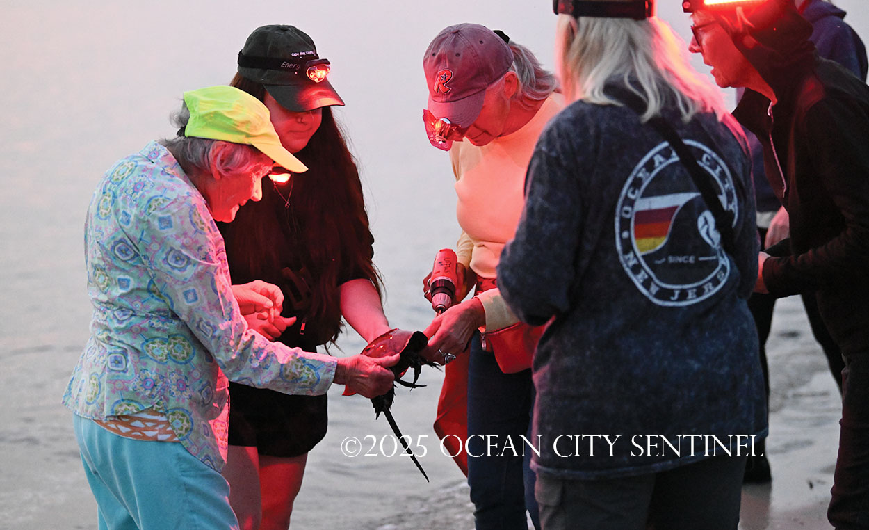 It was an interesting sight after the sun went down June 10, the day before the full moon — known in June as the Strawberry Moon. After getting their marching orders on this, the second tagging of the season after one in late May, the little groups of volunteers spread out over about a half-mile of shoreline, visible only by the little red lights on their heads.
