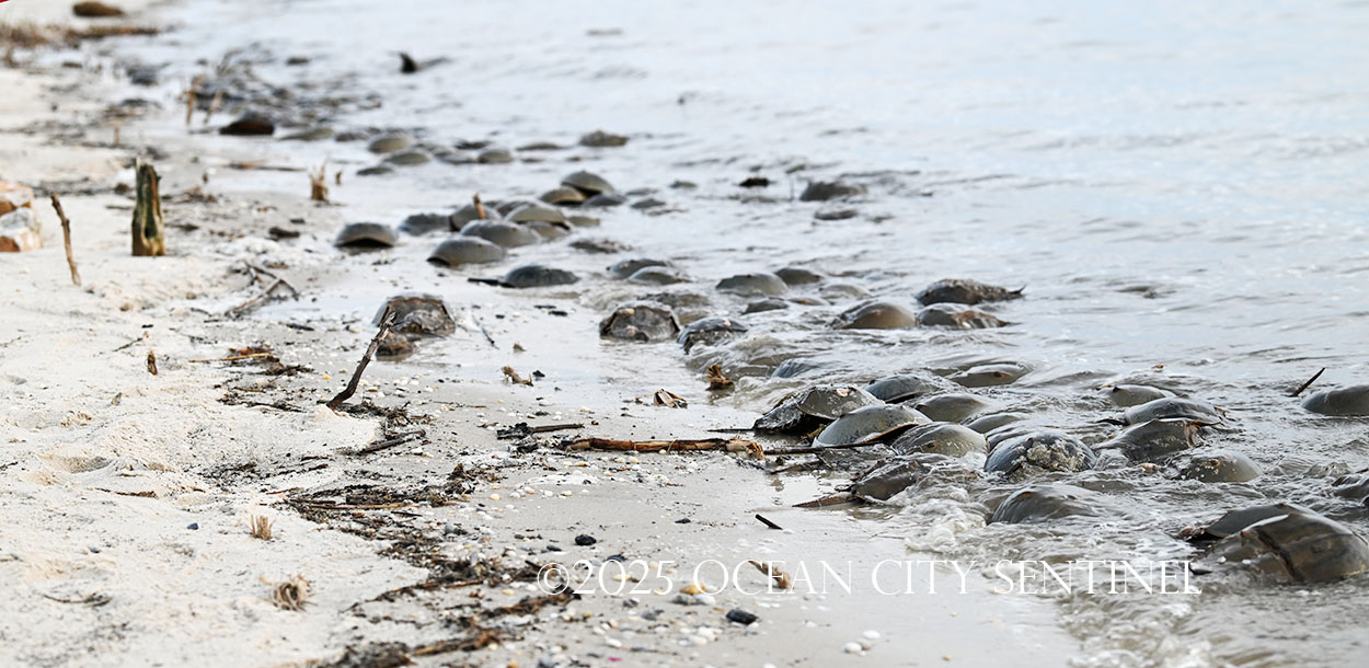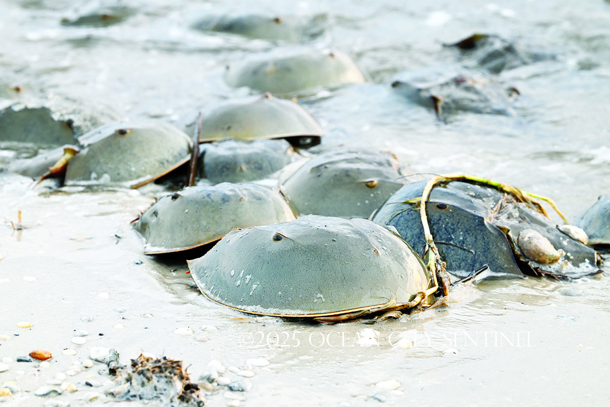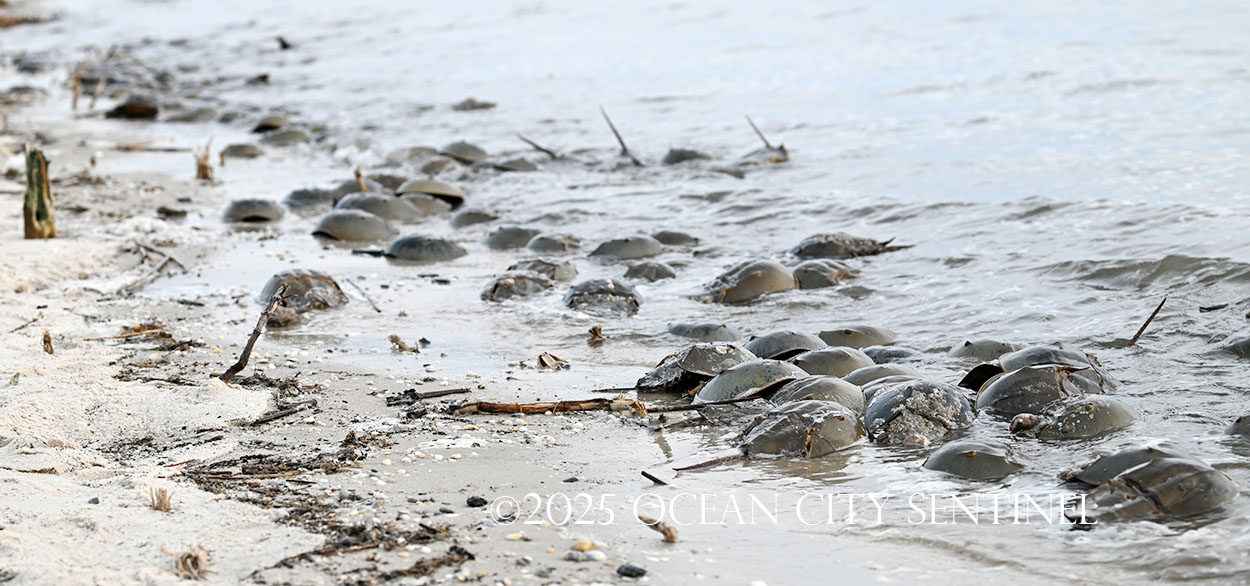 Females can lay 60,000 to 120,000 eggs in batches of a few thousand at a time. Those eggs are a key part of the ecosystem, providing food and energy for migrating shorebirds, which is one reason the horseshoe crabs are considered a keystone species because of their part in the environment.