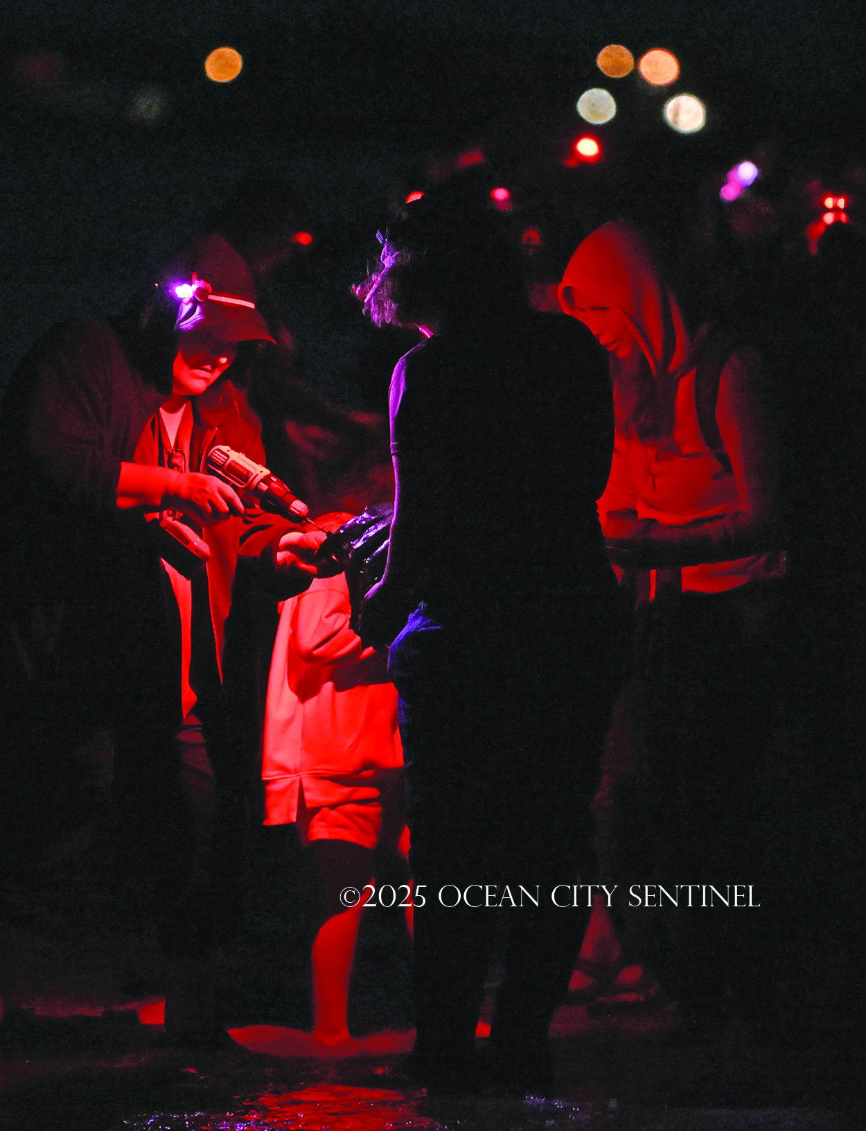 Wearing headlamps with red filters, volunteers of all ages listened as Hanlon explained how each group of four to five would pick up the horseshoe crabs, take down information on size and gender, carefully drill a hole in a corner of their shell and affix a white tag about the size and shape of a quarter. Volunteers were told to be careful not to disturb the horseshoe crabs that had literally hooked up to mate in the shallow water and just onto the sand.