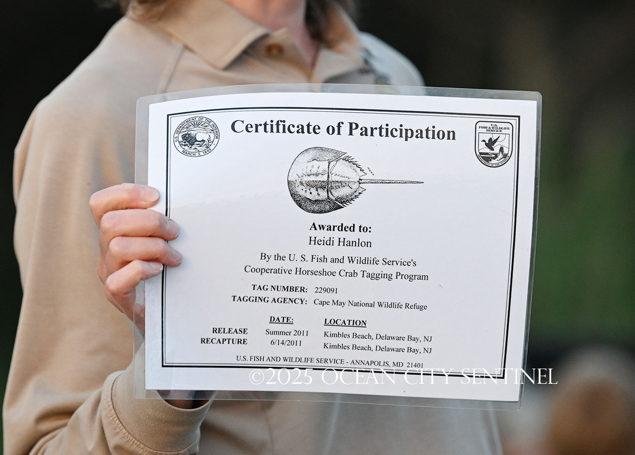 She showed some certificates to the volunteers. One was for a crab tagged 10 years earlier that returned to the same beach.