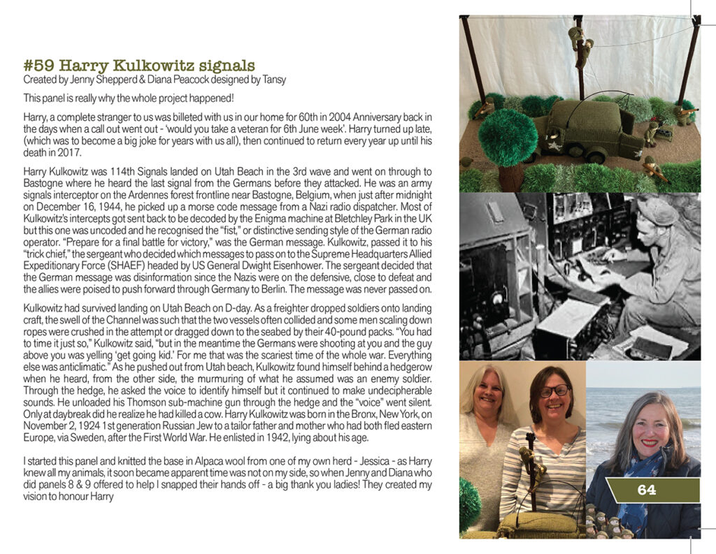 “This panel is really why the whole project happened,” Forster wrote of panel #59 “Harry Kulkowitz signals” in her new guidebook for The Longest Yarn. (See entry, above.) “Harry, a complete stranger to us, was billeted with us in our home for the 60th” — the 60th anniversary of D-Day, back in 2004 — “back in the days when a call went out — ‘would you take a veteran for 6th June week?’.”