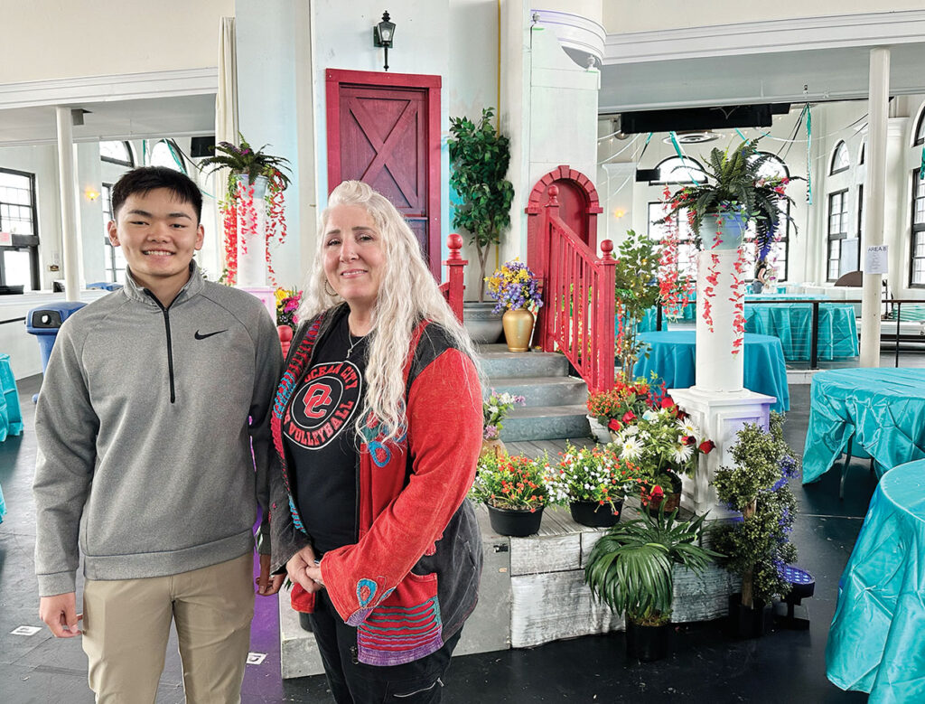 At top, Junior Class President Joseph Heng with Junior Class Adviser Jennifer Dean prepared for last weekend’s prom at the Ocean City Music Pier.
