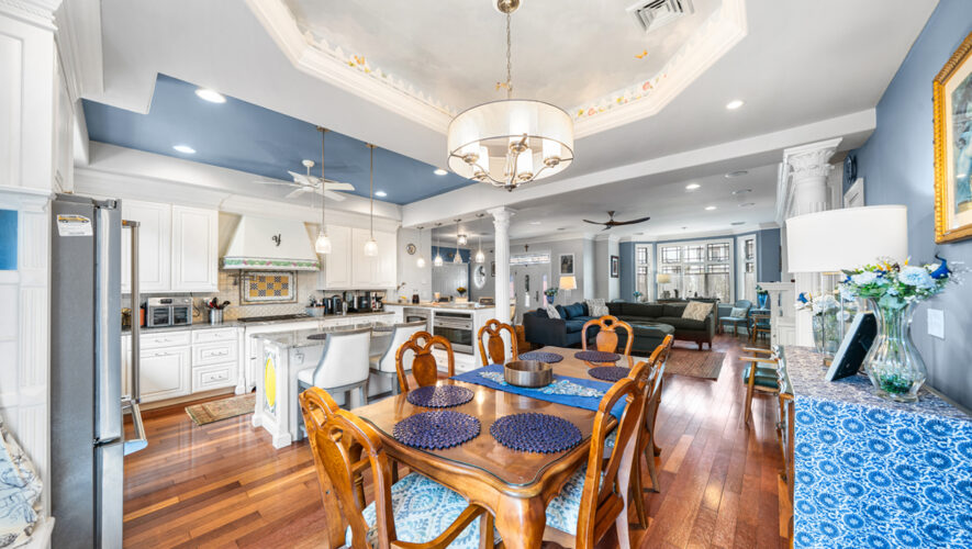 The dining area is just steps away, and features its own tray ceiling, this one painted with a sky and birds. The long table below the chandelier includes seating for at least eight people. Natural light is provided by the sliding glass door that opens onto the back porch.
