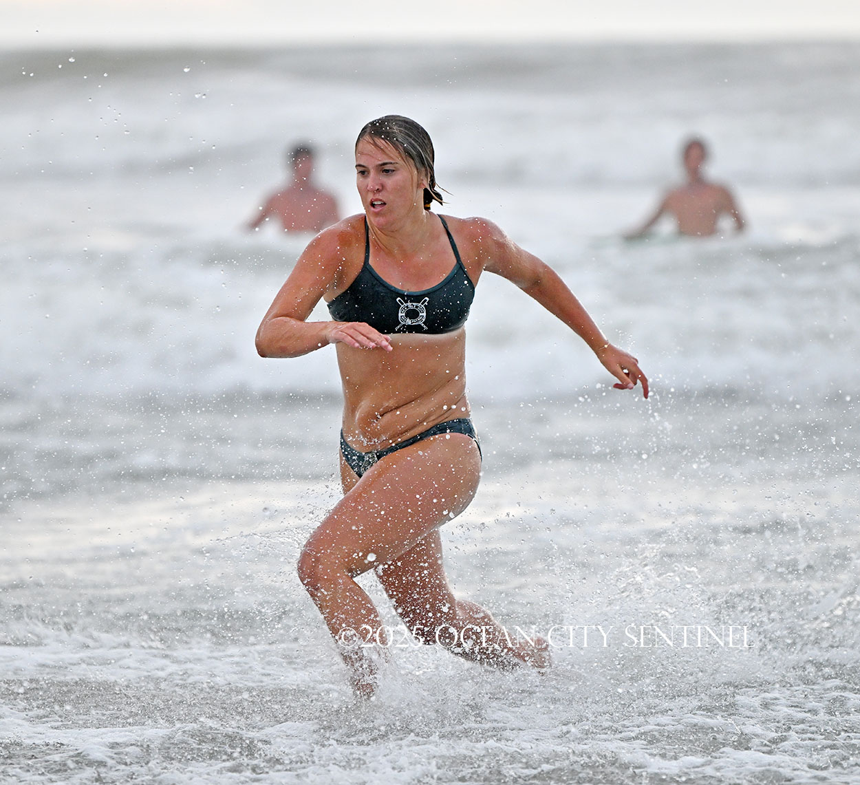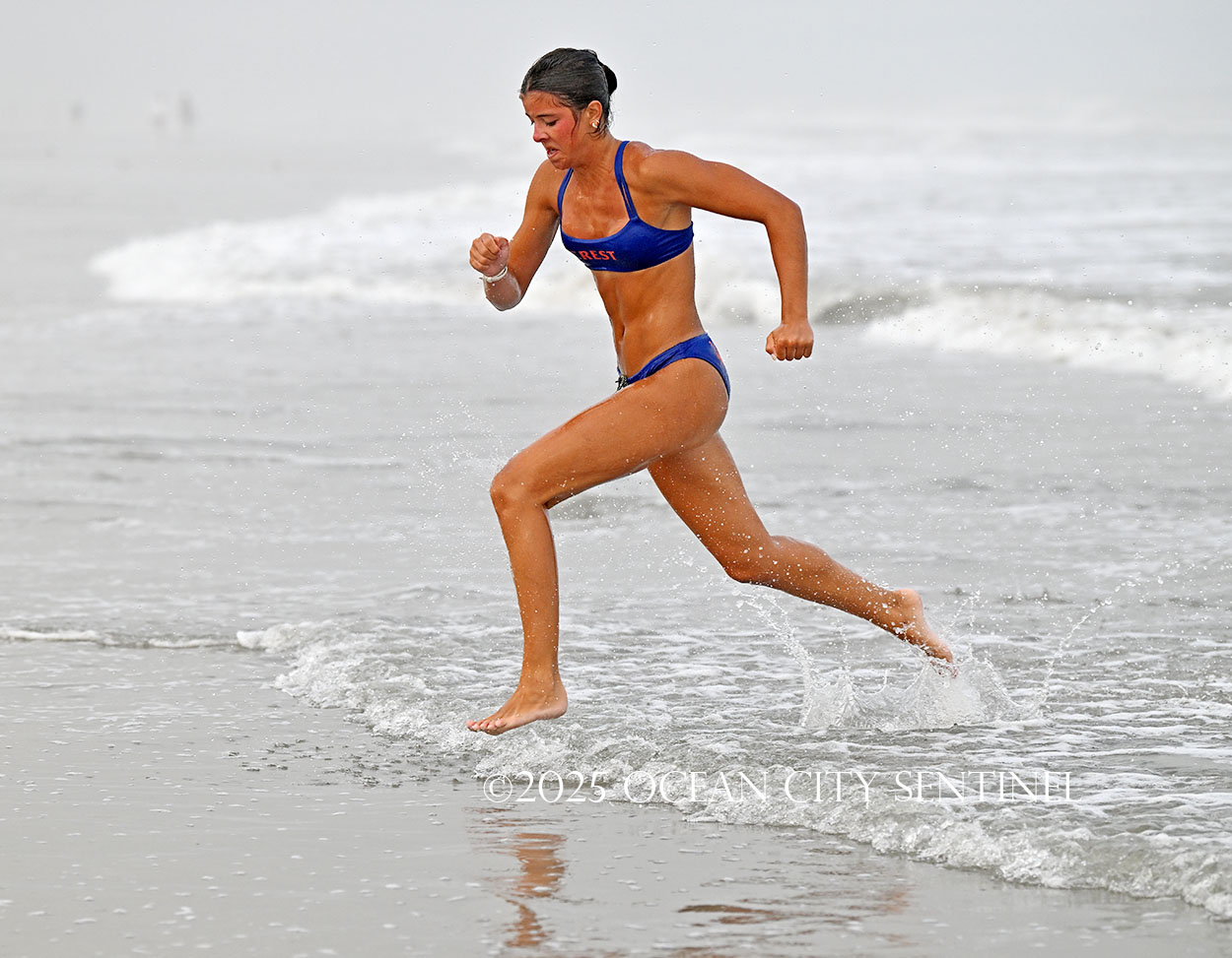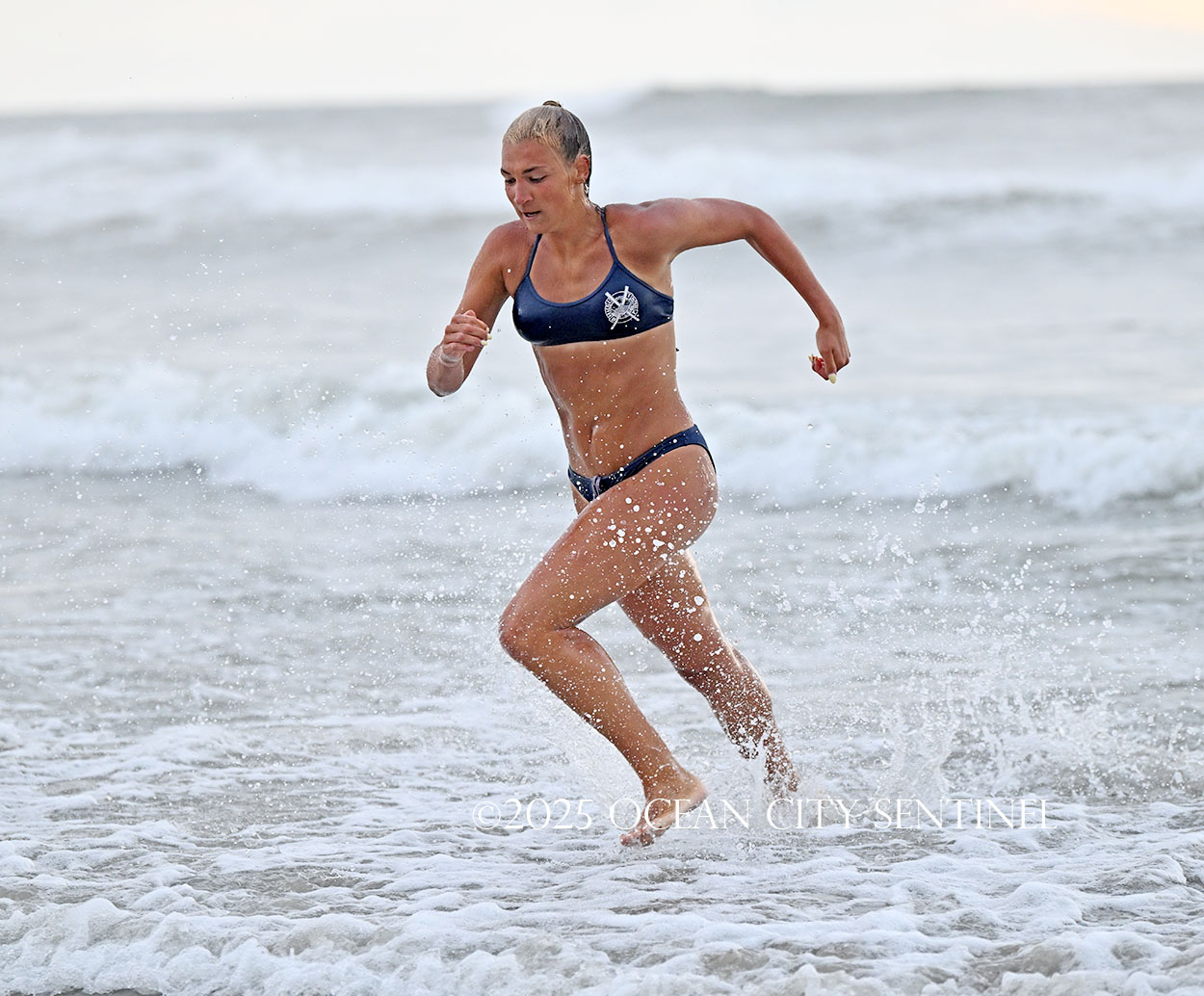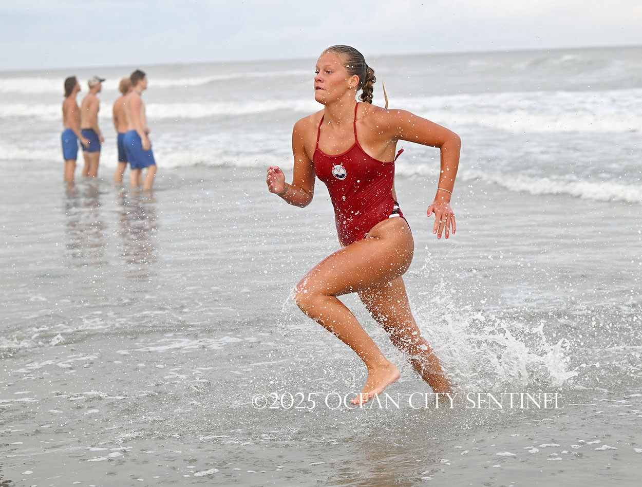 She added the conditions were rough for the dash relay, in which the guards run over the sand and into the surf, touch a marker and then race back again. There was a “really strong current ripping north, so it was learning how to angle, get to the correct buoy, come right back in, and make sure you’re on target,” Frederick said.