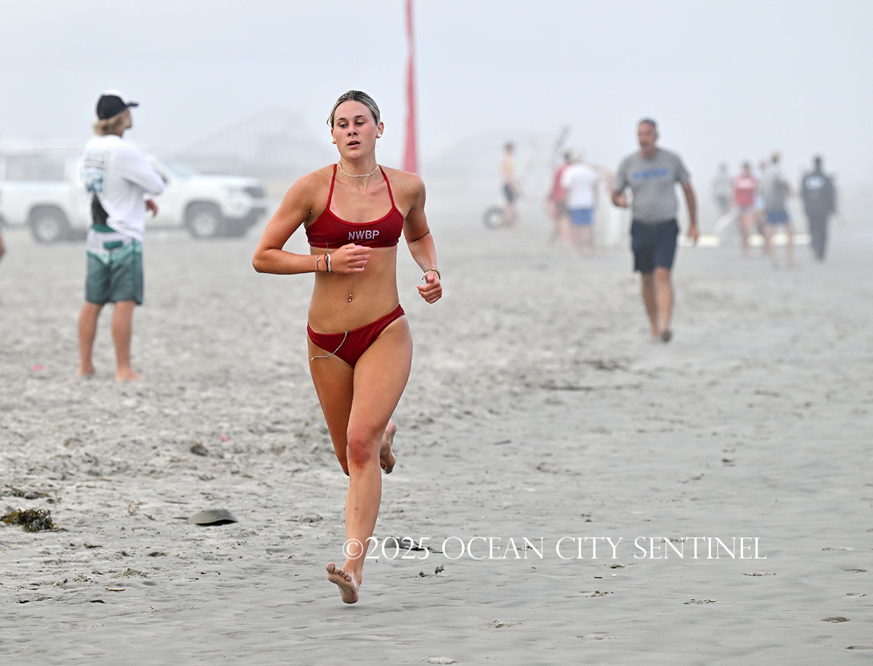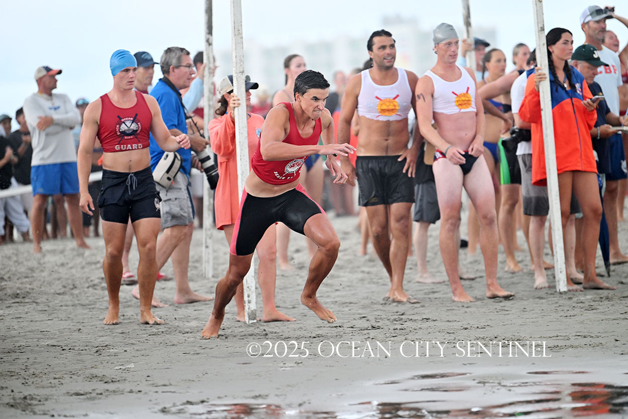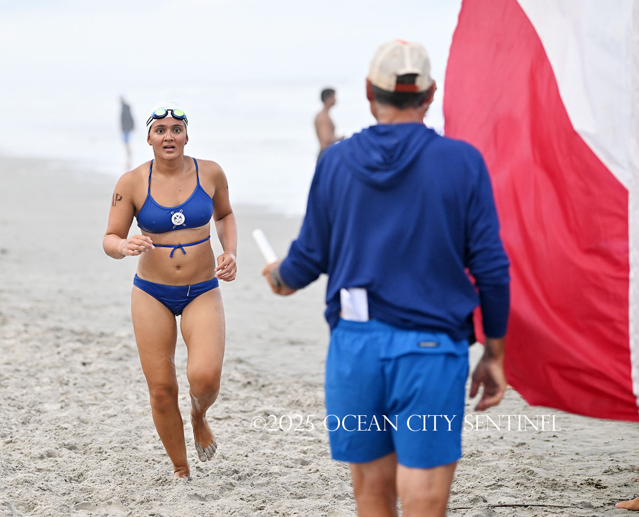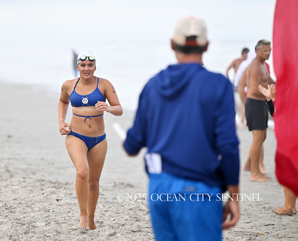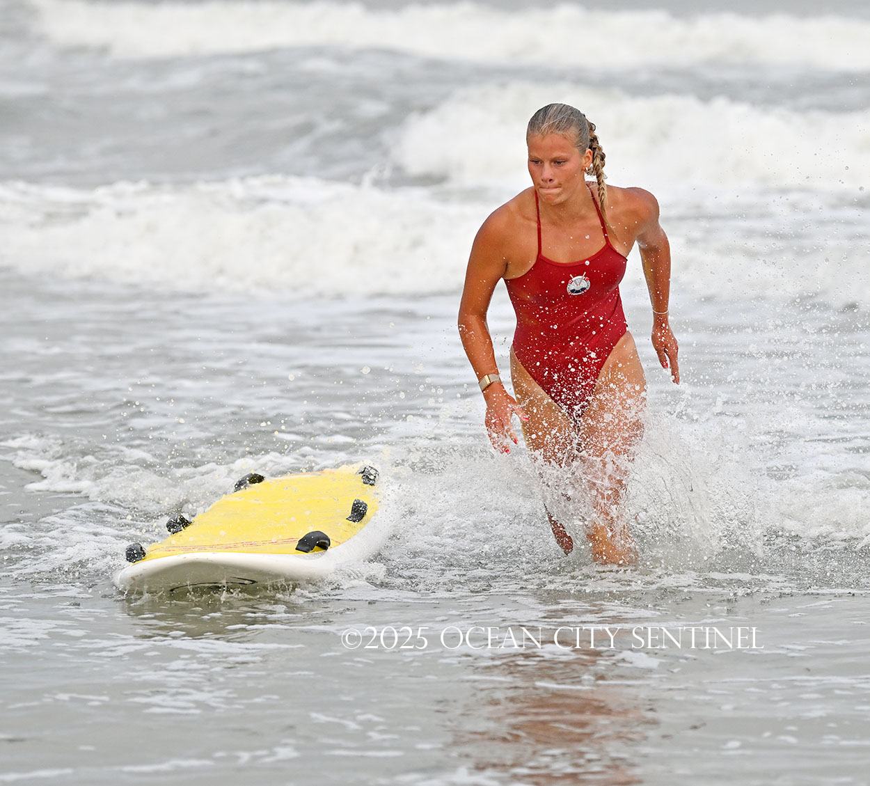 She added the conditions were rough for the dash relay, in which the guards run over the sand and into the surf, touch a marker and then race back again. There was a “really strong current ripping north, so it was learning how to angle, get to the correct buoy, come right back in, and make sure you’re on target,” Frederick said.