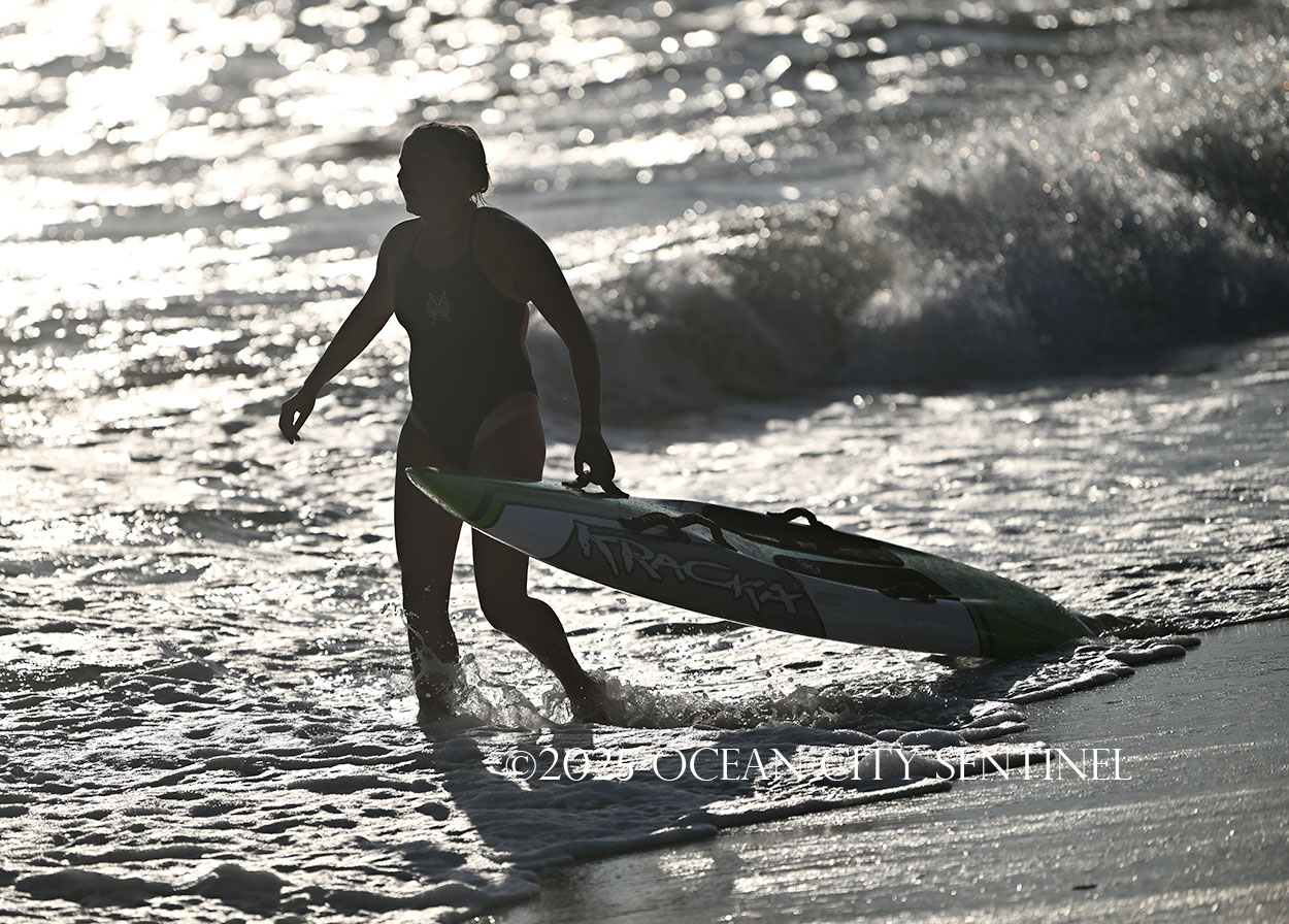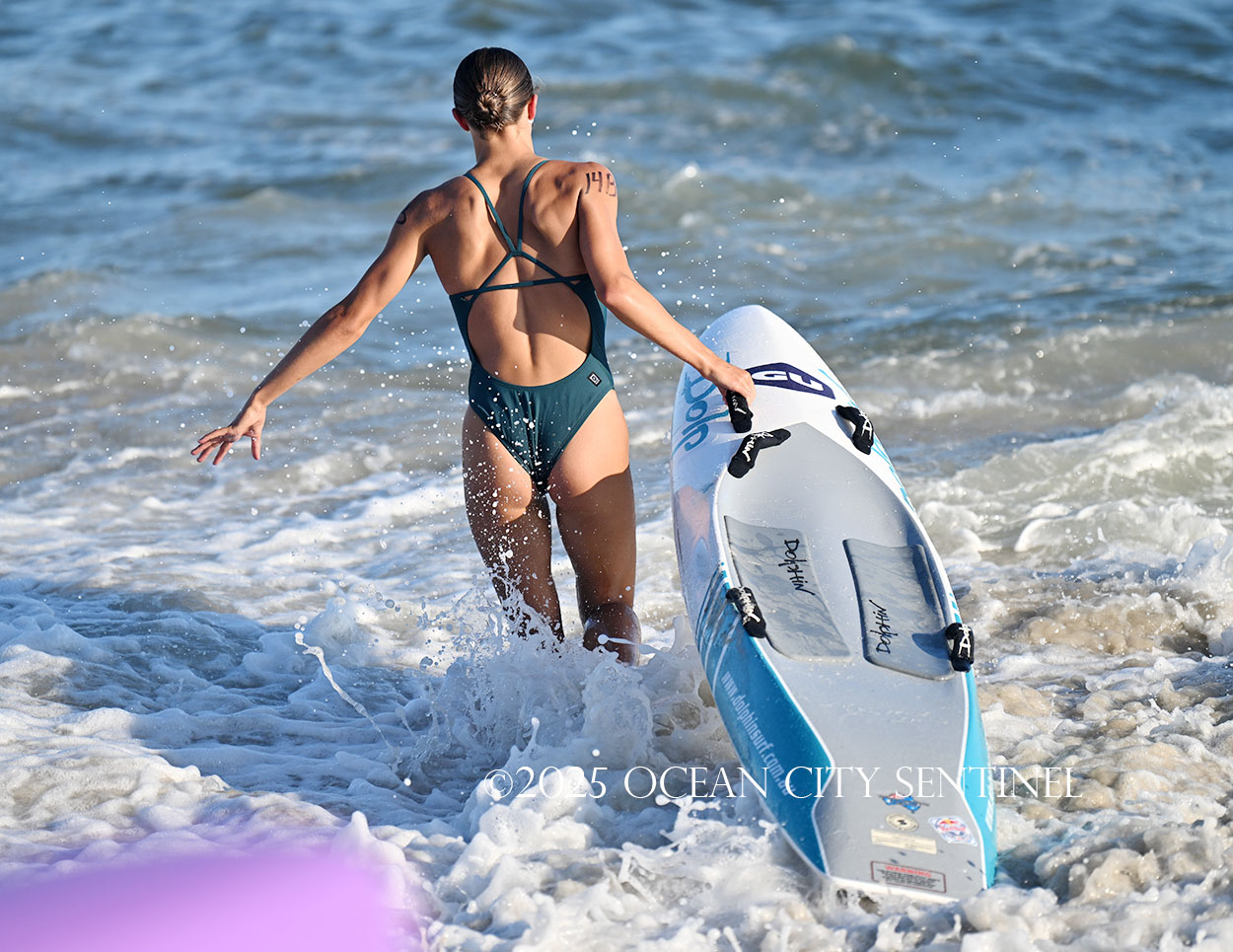 “Ooh, that run, especially that second run, cooks my legs up. That really hurts,” she said. “And then especially when you grab the board and try to run down the beach to make your paddle a little shorter, as soon as you grab that extra weight in your hands with the soft sand, ouch!”